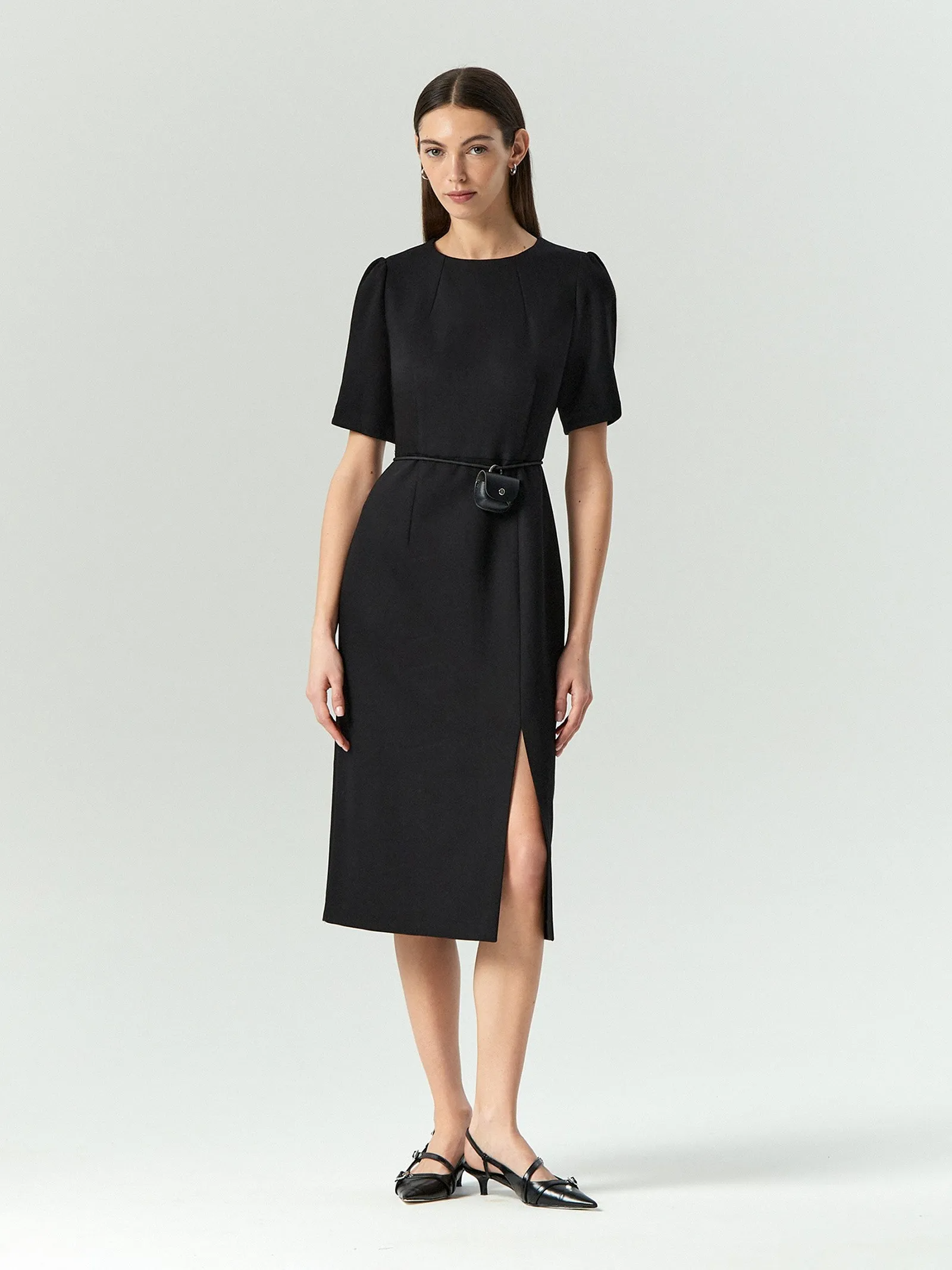 Базовое платье для офиса и на каждый день. Приталенная модель миди имеет круглый вырез, короткий рукав с объемом и сборкой у плеч и отрезную талию. Сбоку предусмотрен разрез для свободы шага, который добавляет пикантности образу. Оригинальности модели также придают вытачки. Изделие застёгивается сзади на молнию. Выполнено из материала с высоким содержанием вискозы, на подкладке.