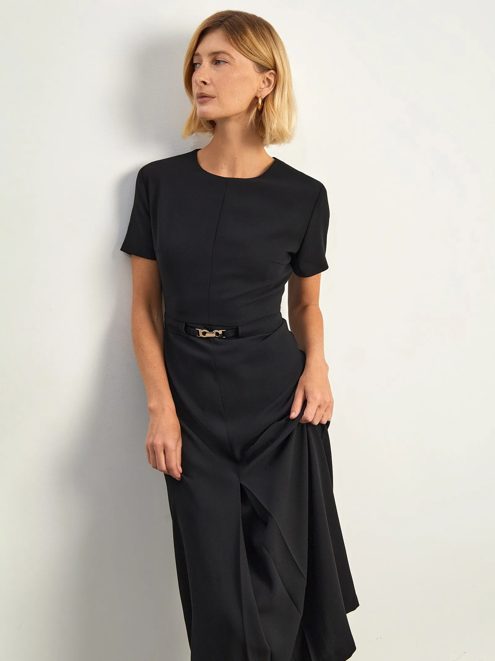 Лаконичное платье миди в чёрном цвете украшено бантовой складкой на юбке и акцентной пряжкой на поясе. Это отличный вариант на каждый день, а с яркими аксессуарами может стать и коктейльным образом.