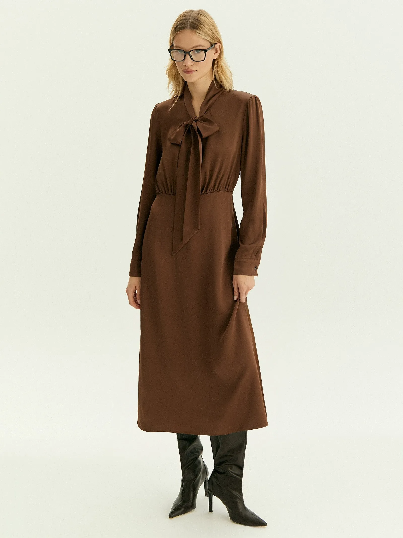 Платье в винтажном стиле из мягкой атласной ткани сделает будни романтичнее. Изысканный воротник-бант можно можно стилизовать как шарф или галстук. Модель выполнена с резинкой в талии: комфортно и красиво садится на любую фигуру. Платье в цвете мокко, одном из ключевых в сезоне, будет любимой вещью в гардеробе. Сочетается с приталенными жакетами и другой базой.