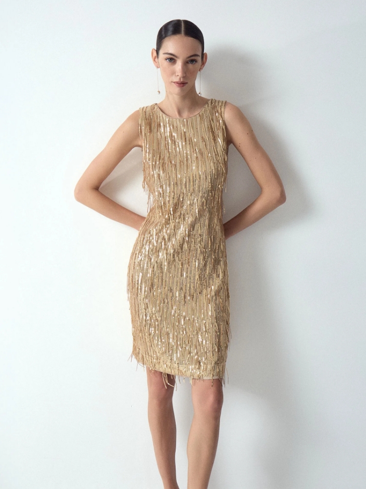 Платье с каскадом золотых пайеток создаст роскошный образ. Пайетки не ощущаются на теле за счёт удобной основы и лёгкой подкладки-сеточки. Модель имеет длину выше колена и приталенный силуэт. Выполнена без застёжек. Платье станет идеальным вариантом для коктейльного образа, отличным выбором на корпоратив, день рождения или Новый год