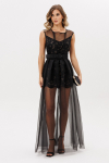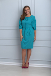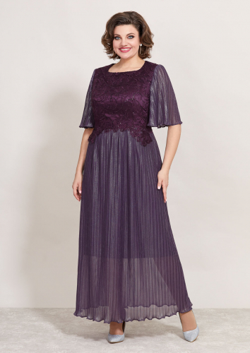 Эффектное женское платье, полу-прилегающего силуэта, выполнено из плиссированной ткани, на трикотажной подкладке. Лиф платья отрезной по линии талии, горловина округлой формы, на обтачке, также на горловине обработаны втачные планки из атласа в тон и декорированы стразами. По линии горловины выполнена вставка из сетки, что придает платье еще больше эффектности, по линии талии втачной пояс из основной ткани, декорирован стразами. Юбка присборена по линии талии и расклешена к низу, спинка отрезная по линии талии, со средним швом и вытачками. Рукав втачной, выполнен з основной ткани, укороченный. Стильное платье, то, что надо для торжественного мероприятия!