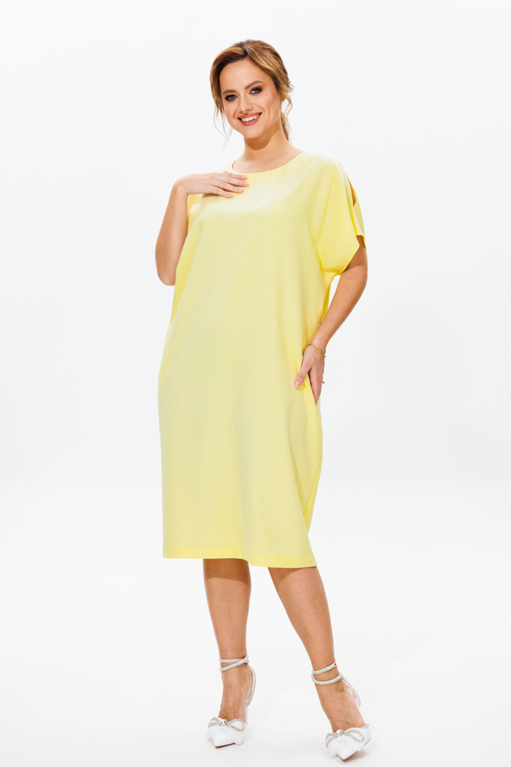 Платье прямого свободного силуэта со спущенной линией плеча, выполненное из плательной ткани (чуть тянется). Платье без подкладки. Вырез горловины округлой формы. Спинка со средним швом. В боковых швах карманы. По плечевым швам разрезы. Изюминка данной модели – бант в верхней части спинки из основной ткани.