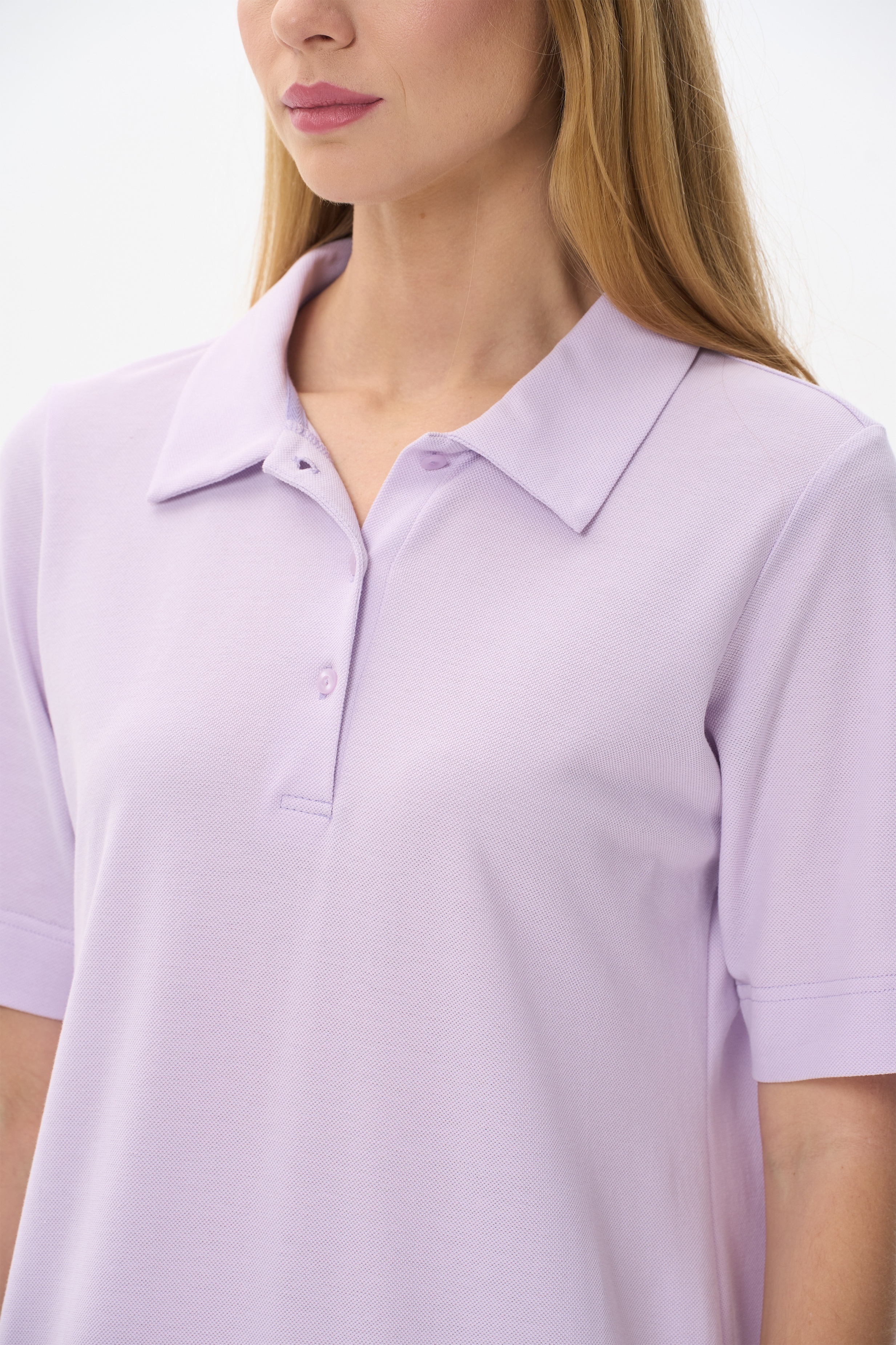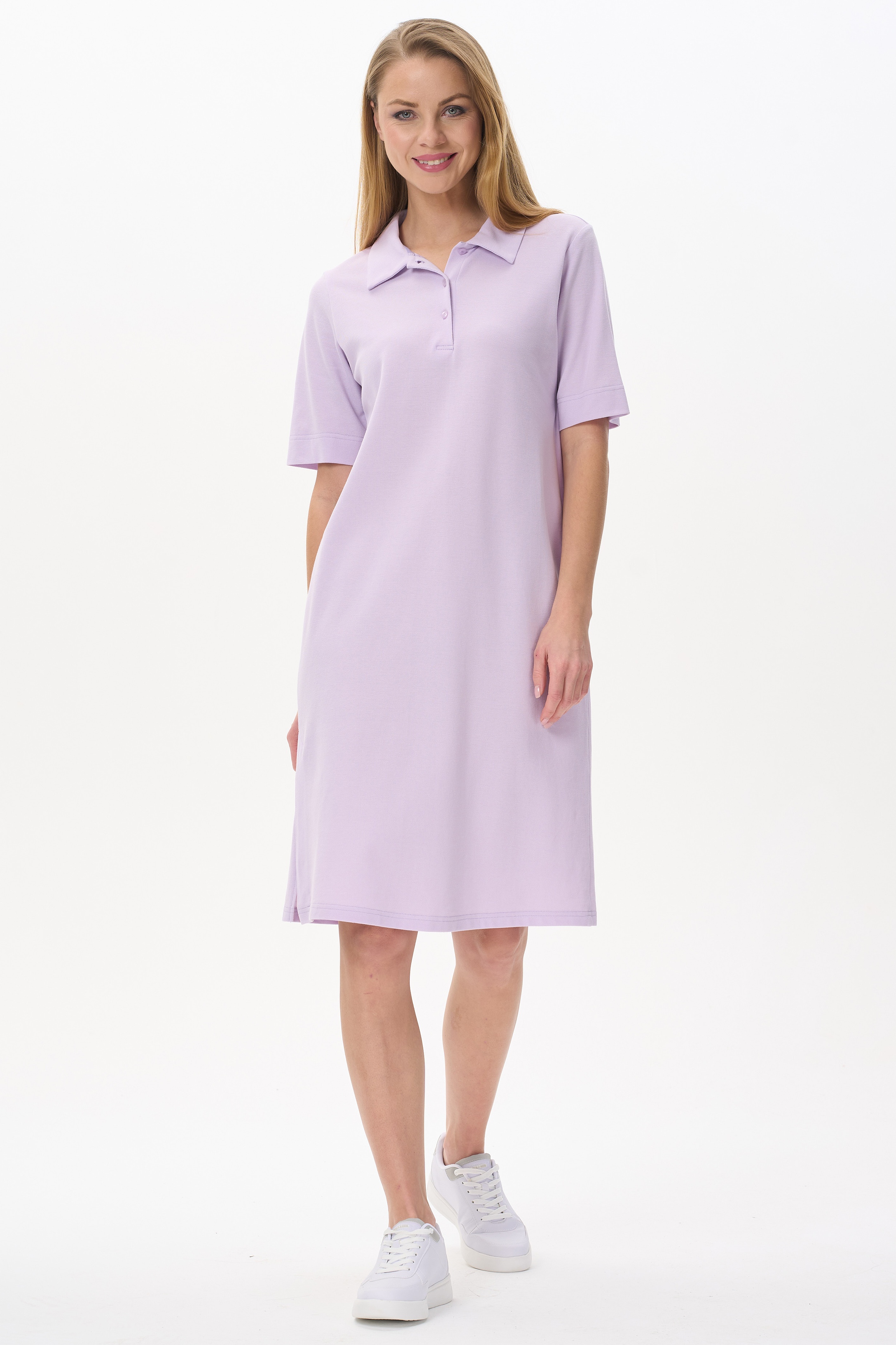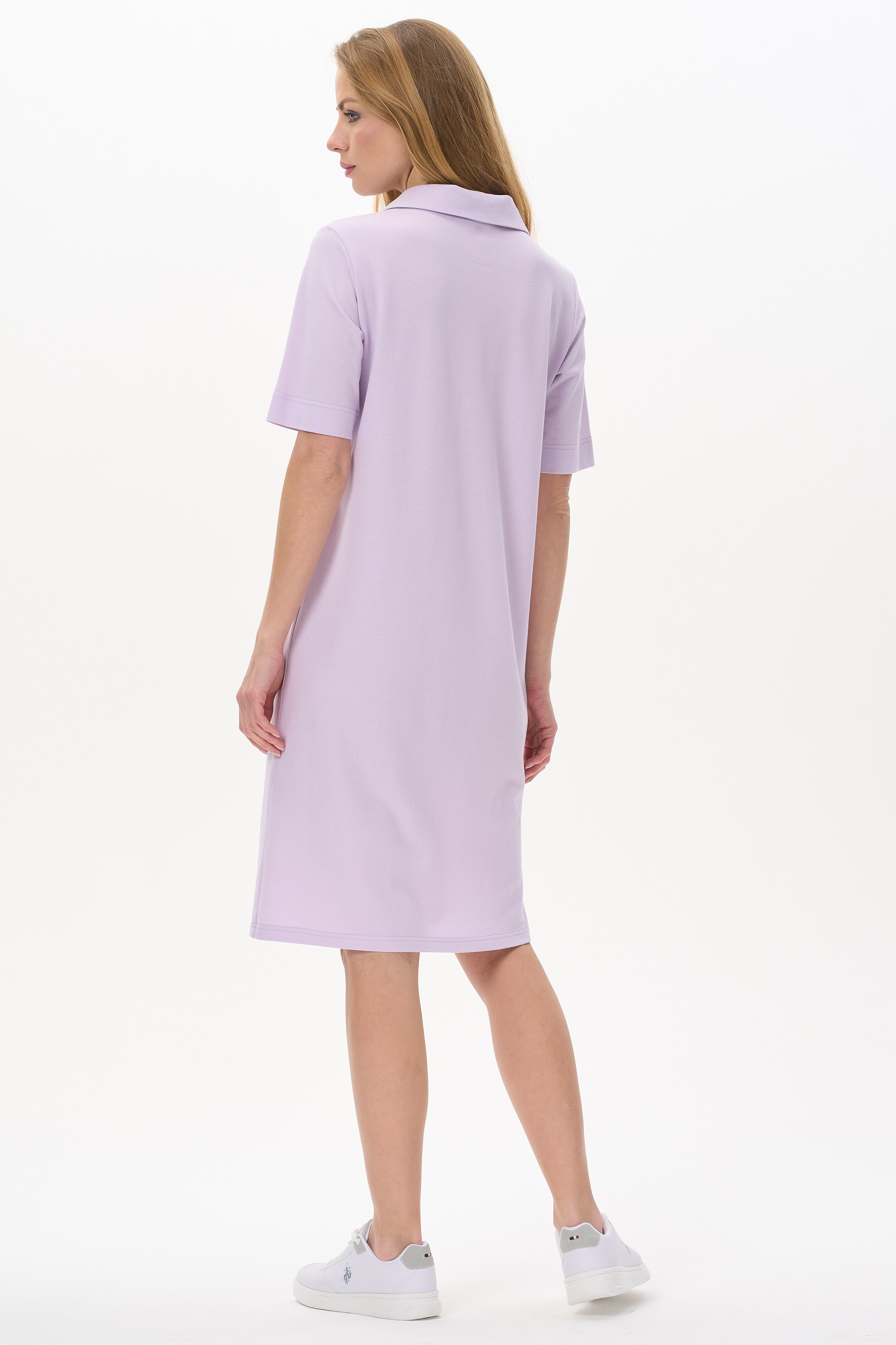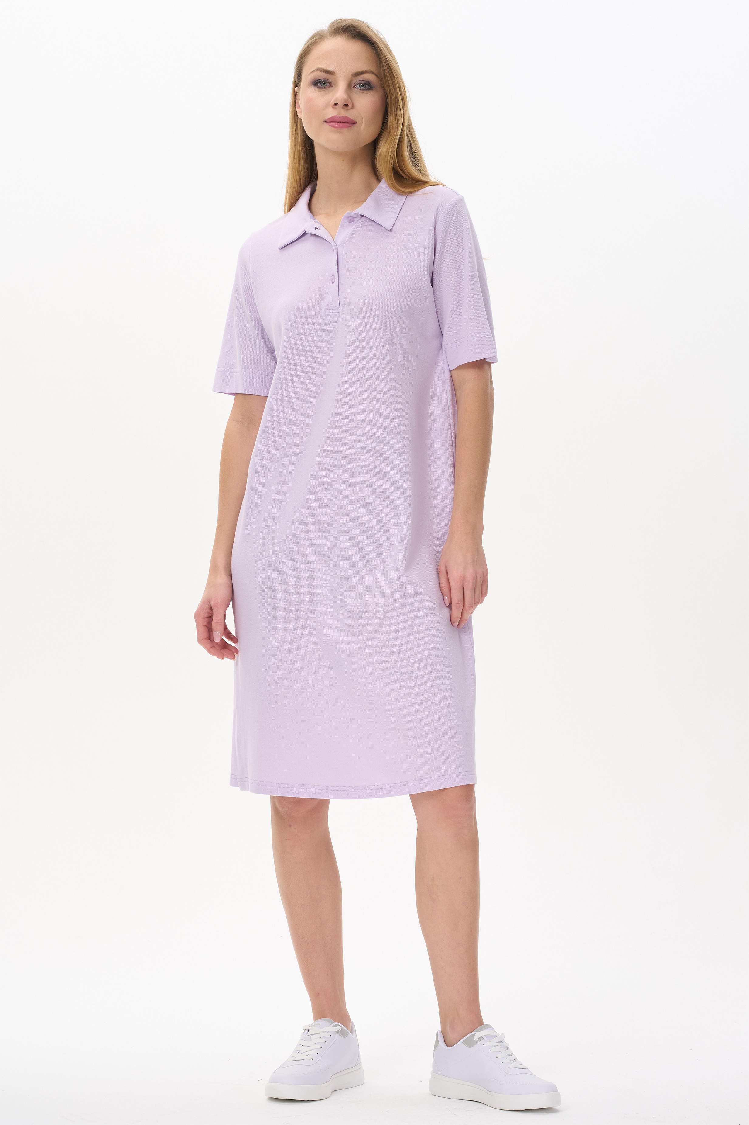 100% хлопок Платье-поло из пике с эластаном 210 гр в сиреневом оттенке. Модель свободная, прямого силуэта, отложной воротник, застежка на пуговицы, рукава до локтя, в правом боковом шве шлица. Лёгкое комфортное платье для ярких летних образов. Рост модели 175 см.