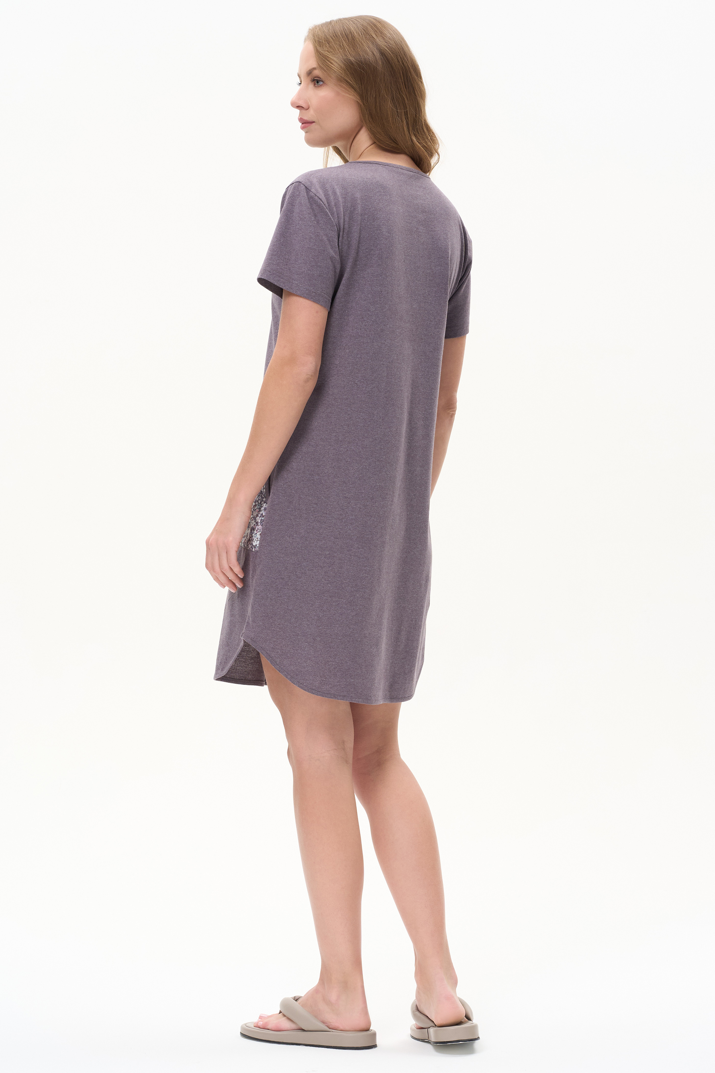 Платье А-силуэта выполнено из сочетания хлопкового и меланжевого трикотажных полотен. Спереди фигурная кокетка с завязкой, накладные карманы. Короткие втачные рукава. Фигурная линия низа изделия окантована. Длина платья до колена. Рост модели 175 см.