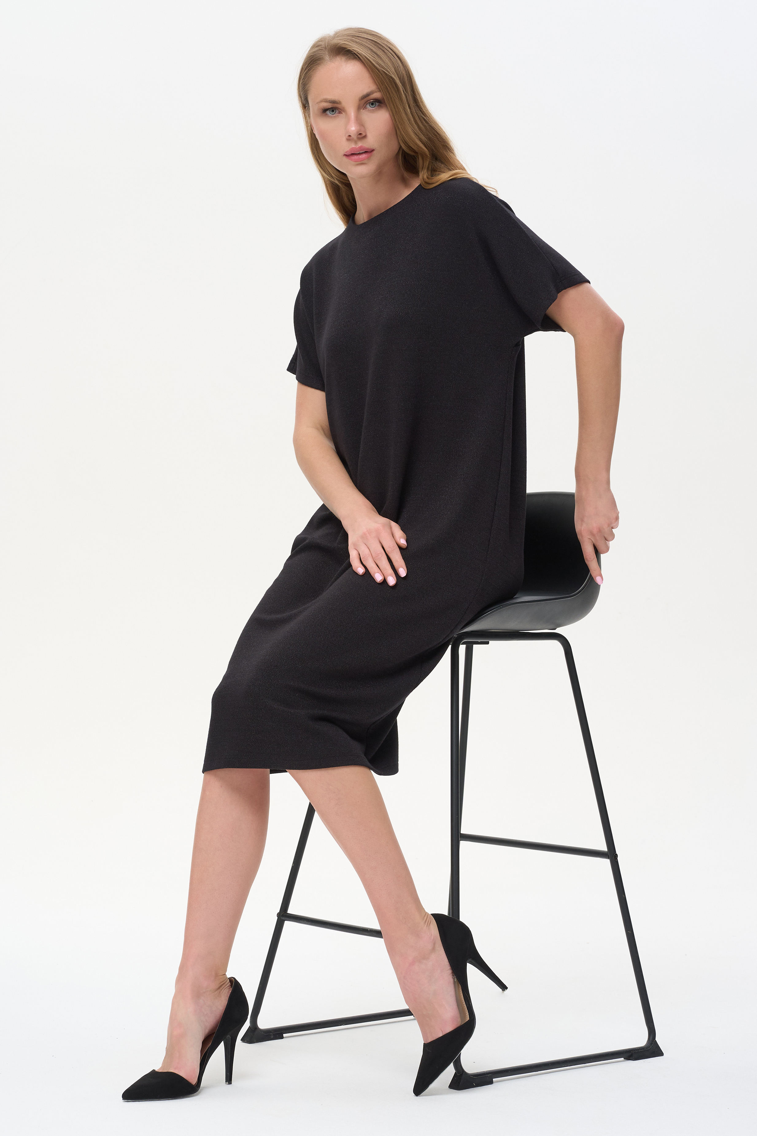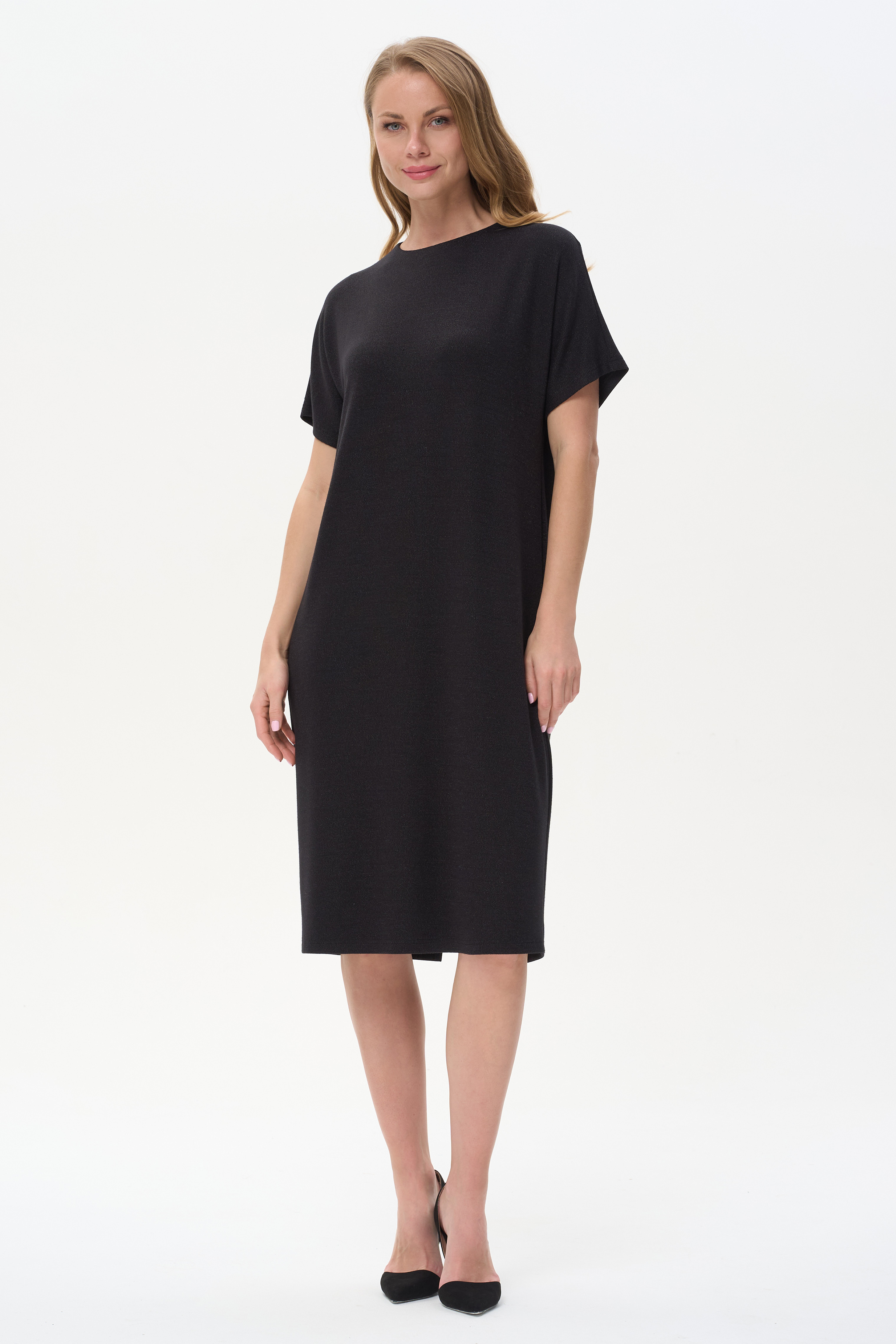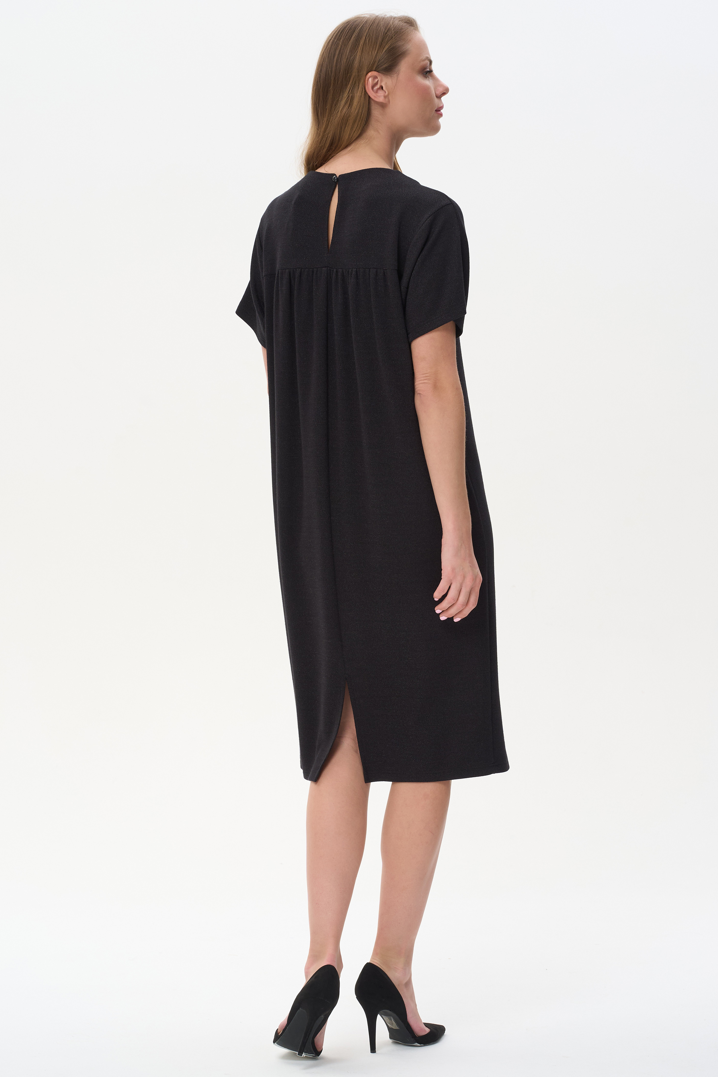 85% вискоза, 13% полиэстер, 2% эластан Свободное платье с округлым вырезом из мягкой рибаны с деликатным блеском, рукава спущенные короткие Спинка с отрезной кокеткой на подкладке, со сборкой и застёжкой на пуговицу. Элегантное решение для офиса и особых случаев.