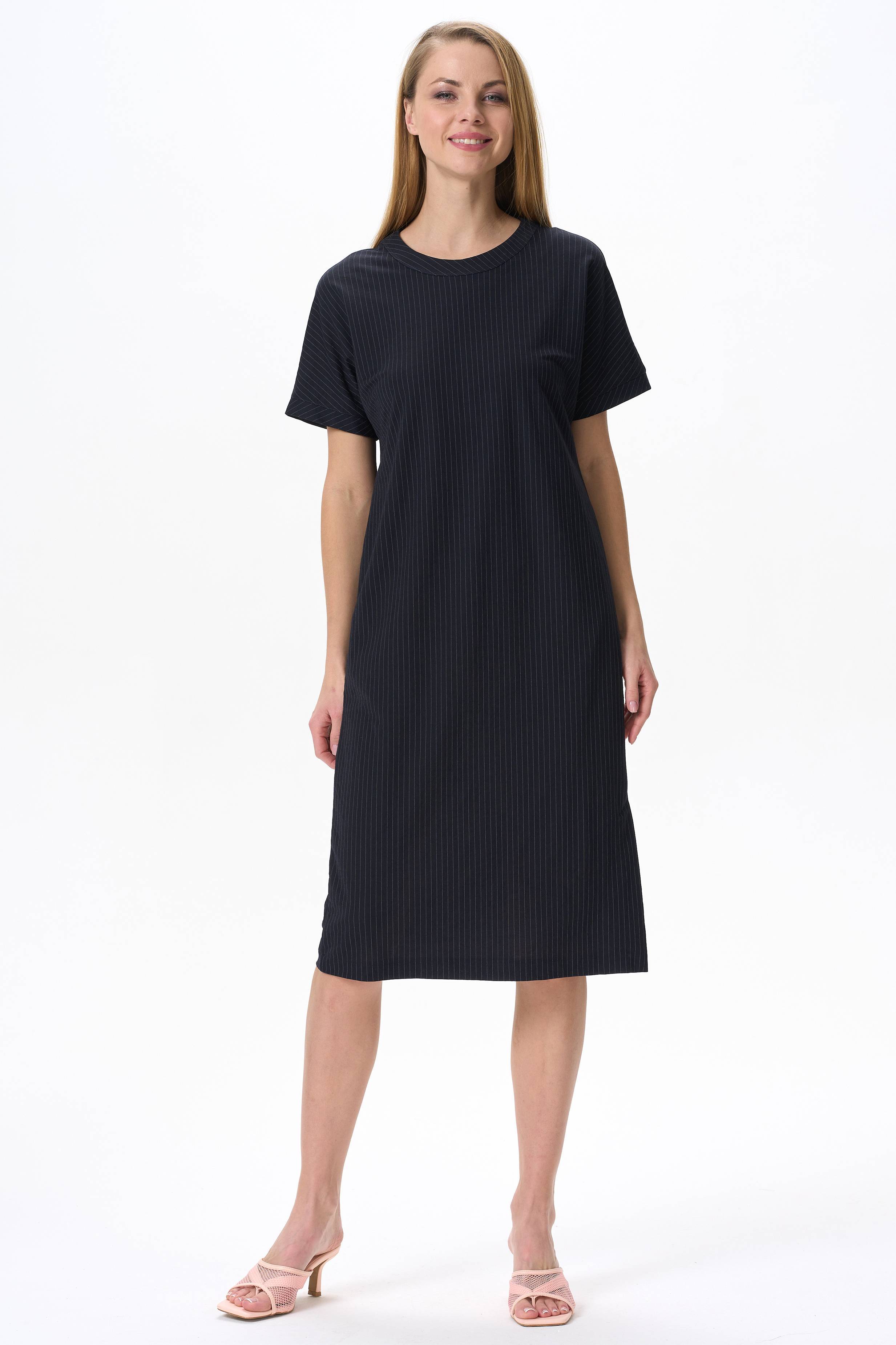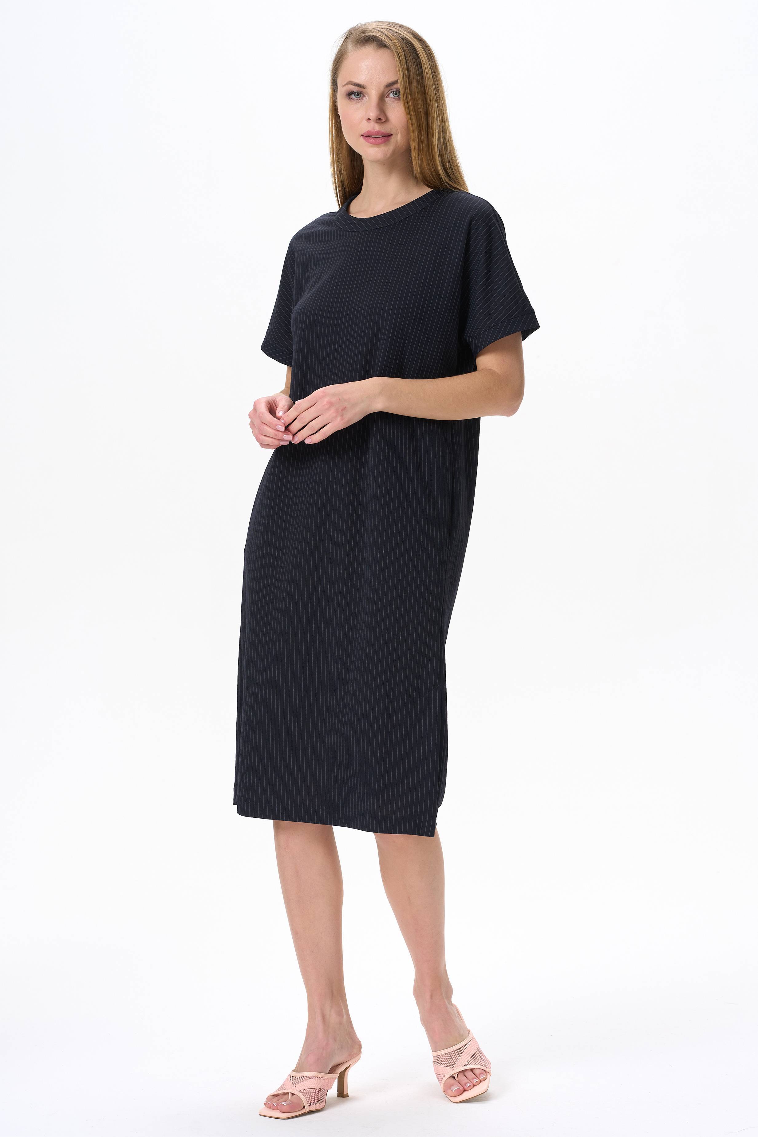 75% вискоза, 25% полиэстер Комфортное повседневное платье прямого силуэта из вискозной ткани. Круглый вырез горловины, цельнокроеные короткие рукава с манжетами, в боковых швах карманы. По низу изделия в боковом шве шлица. Длина платья ниже колена. Рост модели на фото 175см.