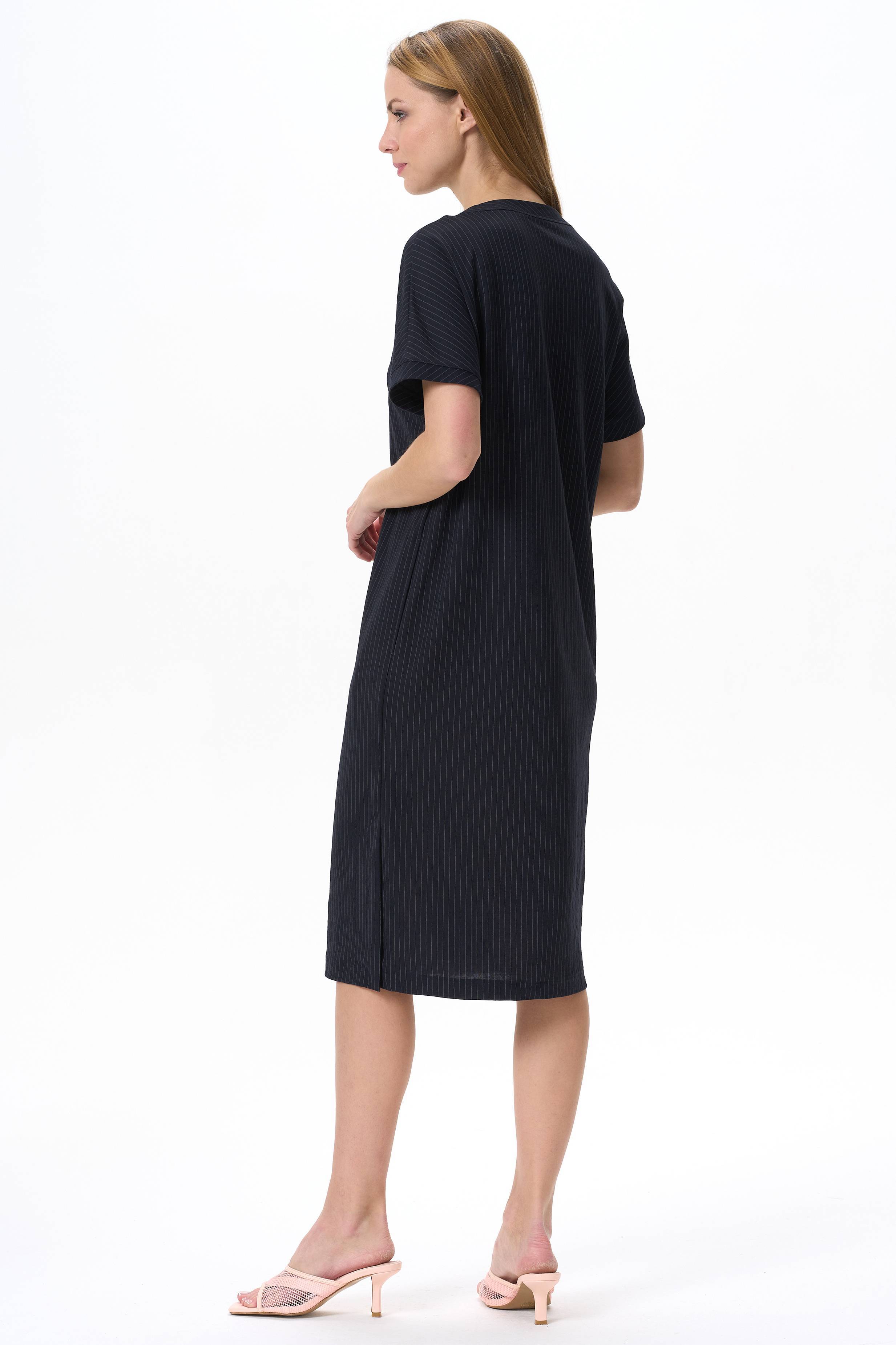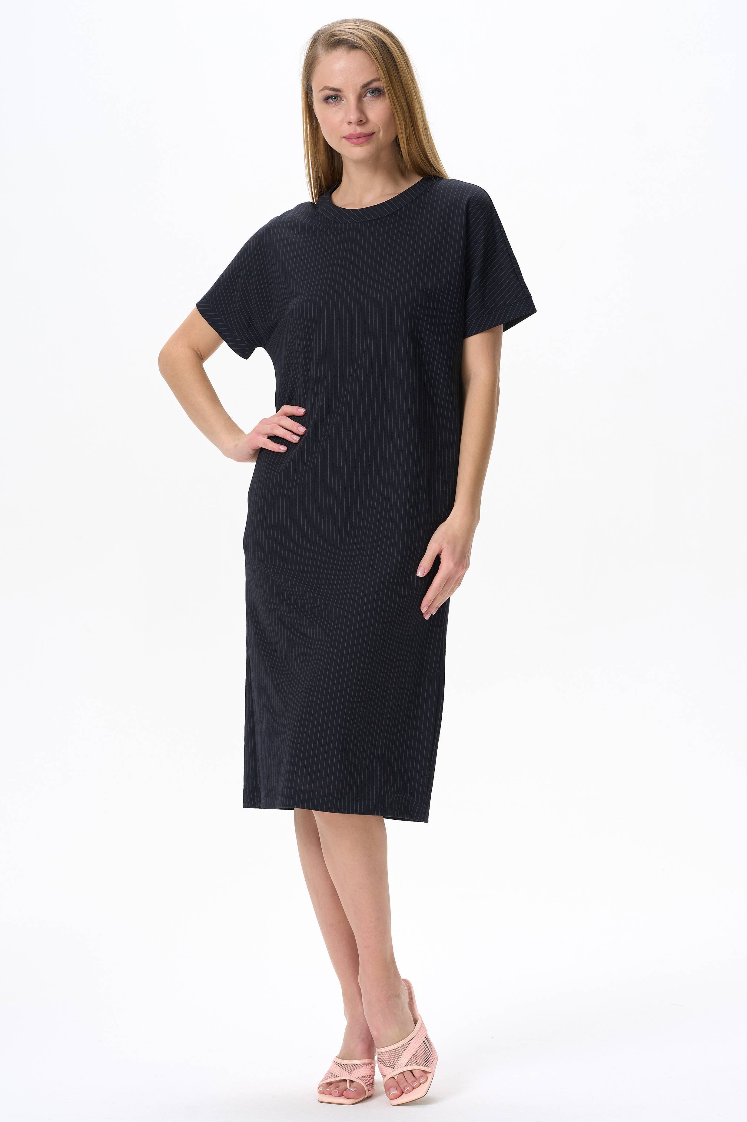 75% вискоза, 25% полиэстер Комфортное повседневное платье прямого силуэта из вискозной ткани. Круглый вырез горловины, цельнокроеные короткие рукава с манжетами, в боковых швах карманы. По низу изделия в боковом шве шлица. Длина платья ниже колена. Рост модели на фото 175см.