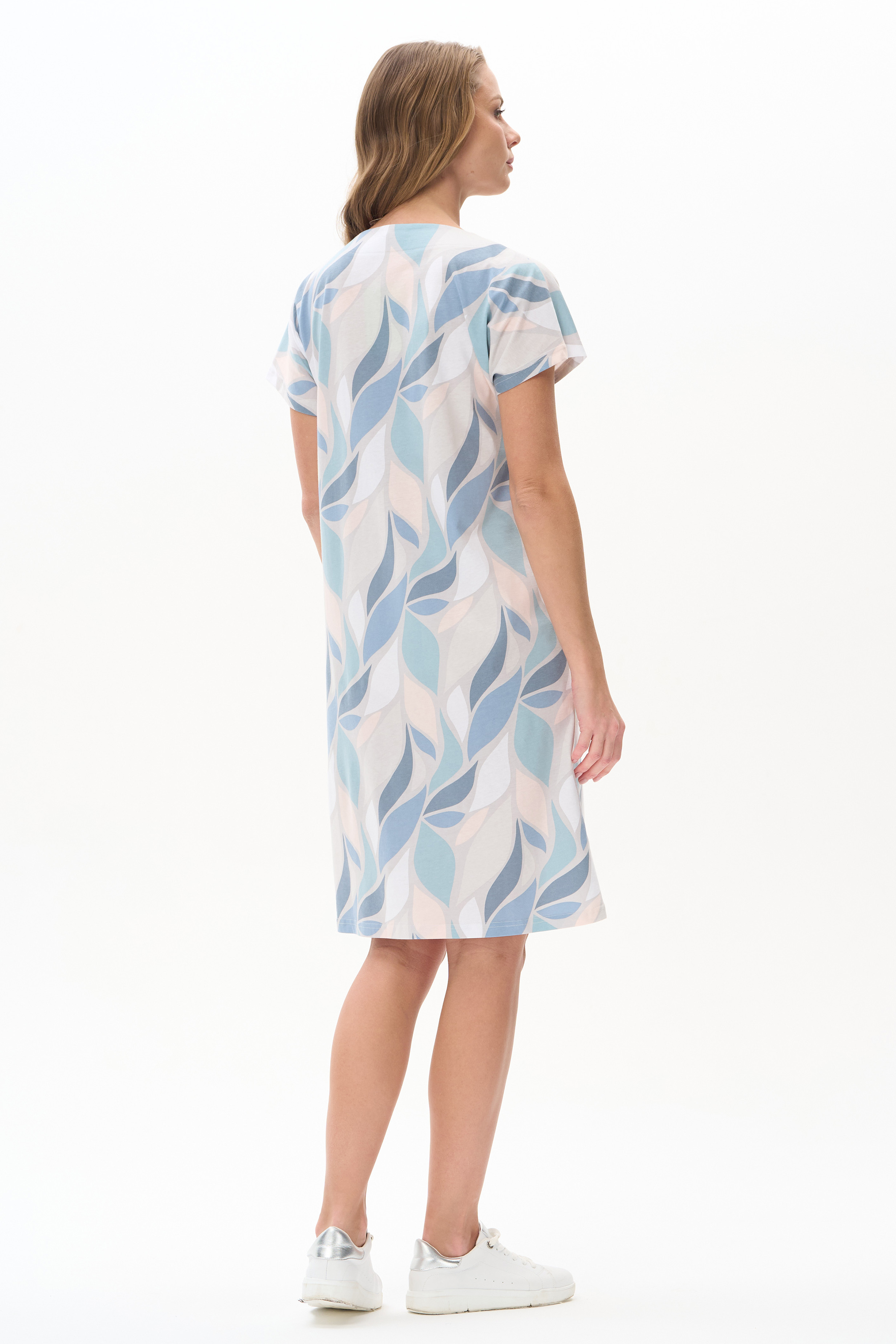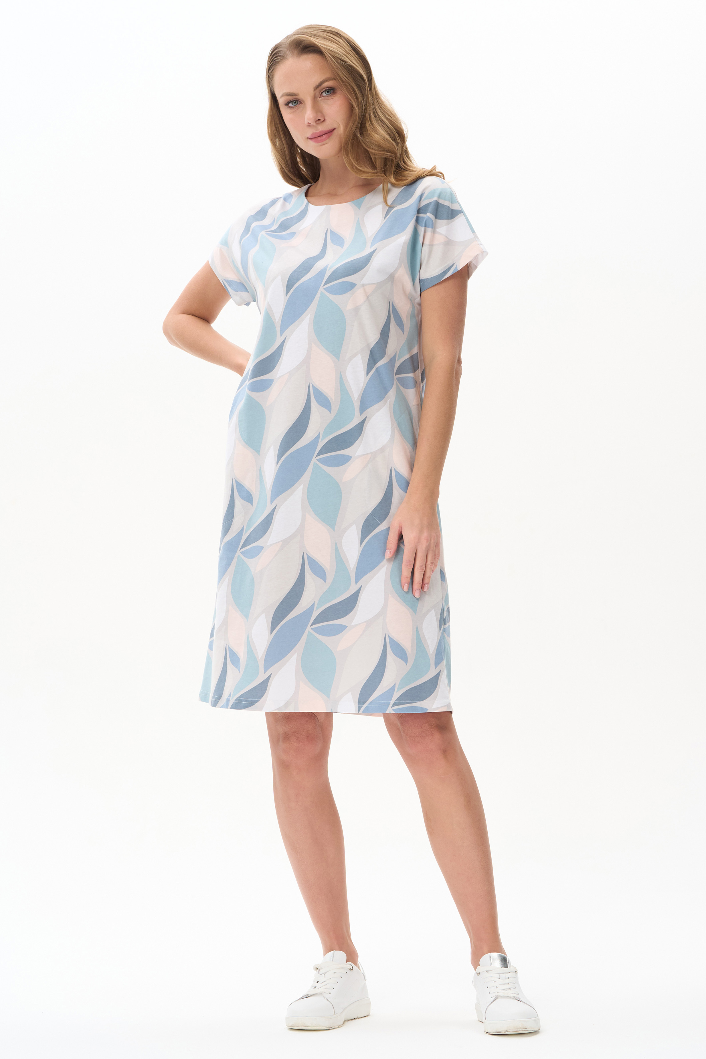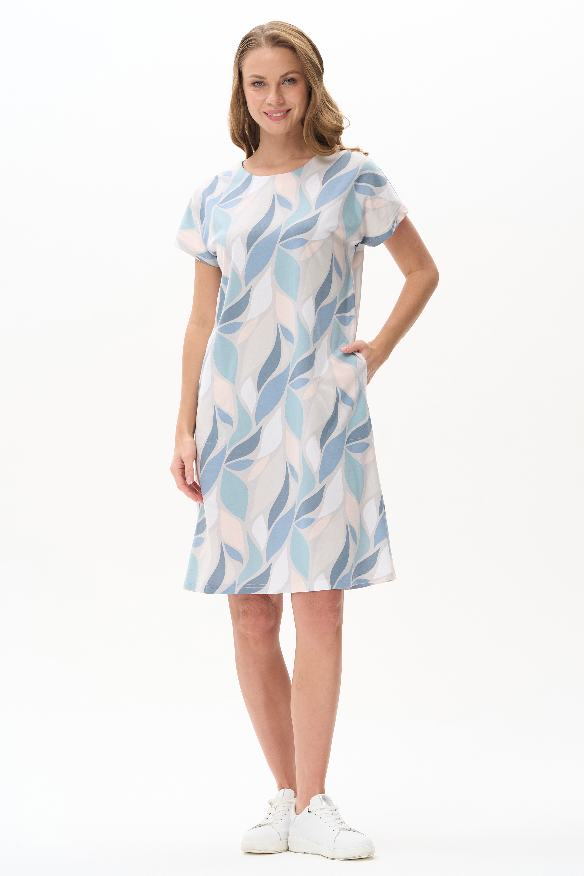 Платье прямого силуэта из кулирки c дизайнерским рисунком - растительная абстракция. Круглый вырез горловины, спущенная линия плеча, цельнокроенные короткие рукава, в боковых швах карманы, длина ниже колена. Эффектная расцветка переводит базовую модель в разряд повседневных и нарядных изделий. Рост модели 175 см