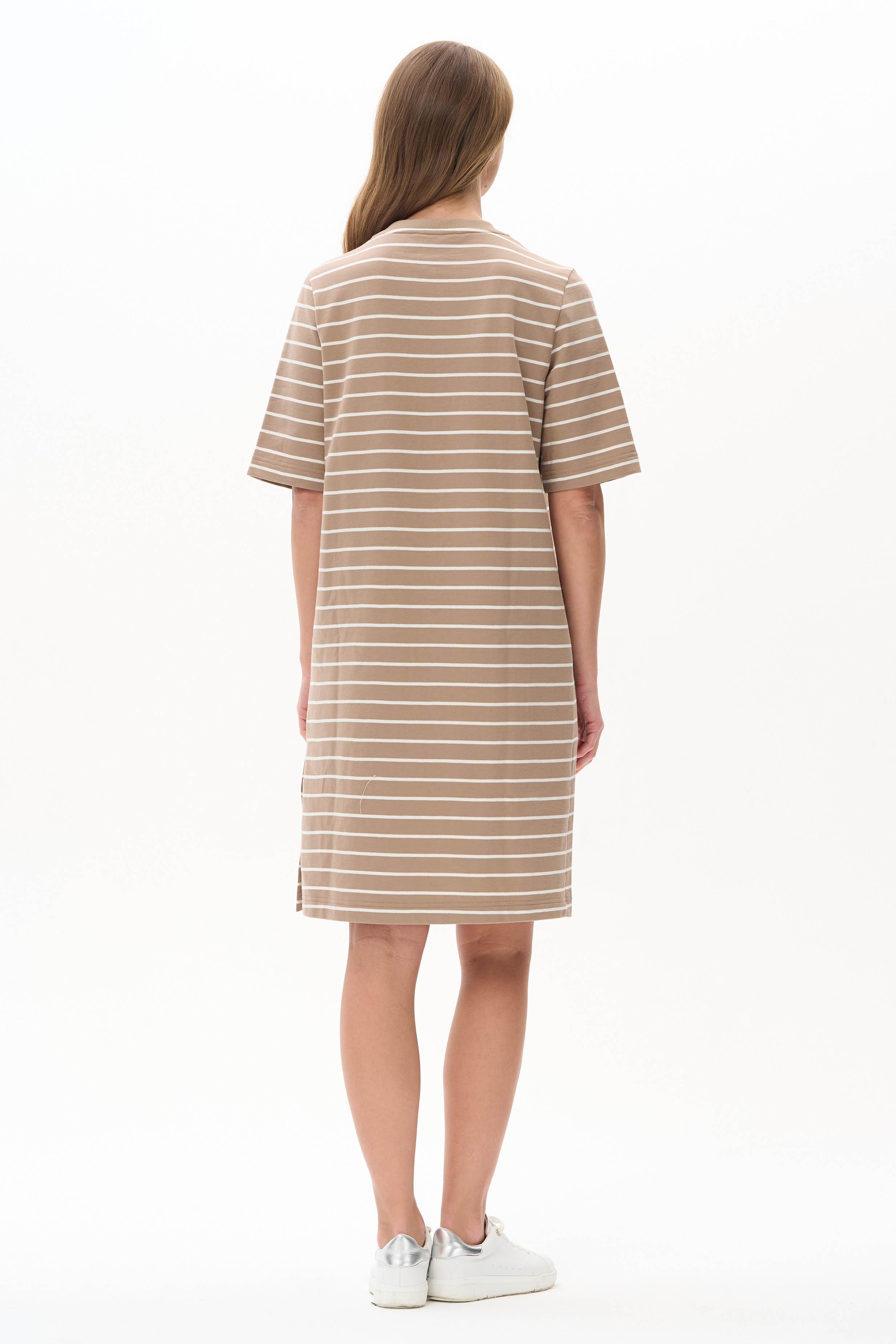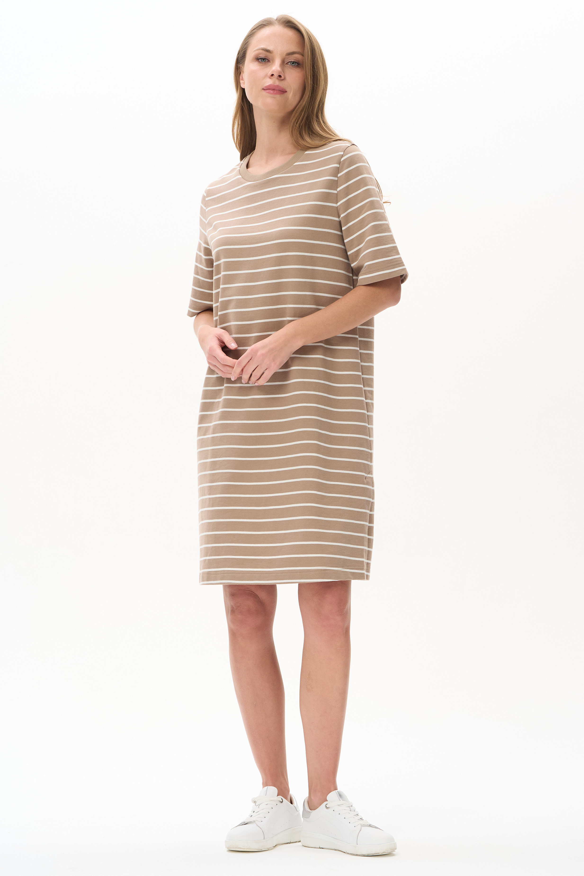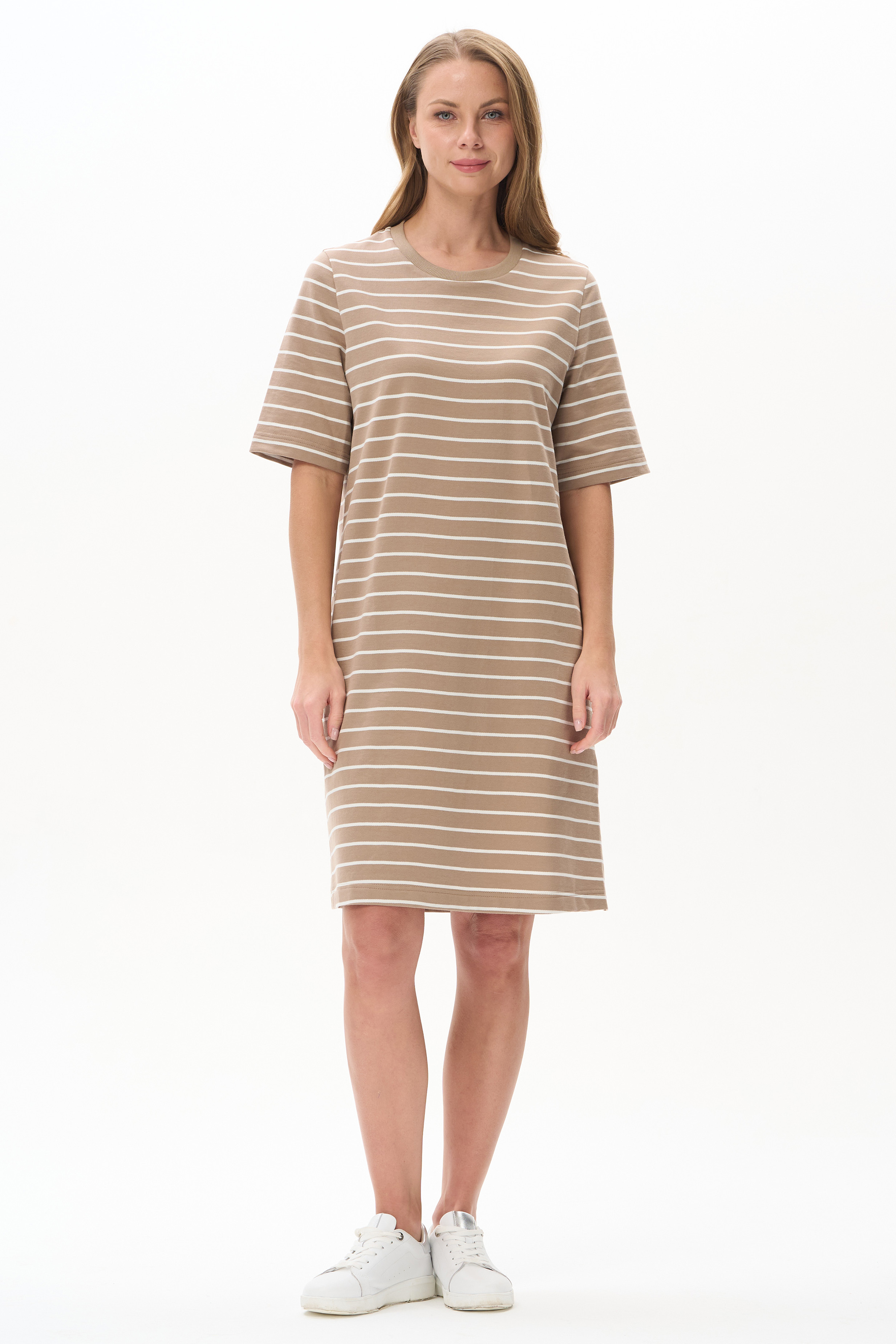 100% хлопок Платье из тонкого футера 200 гр качества ПЕ полоска в оттенках Дюны и Молочный. Модель свободная, прямого силуэта длиной ниже колен, круглый вырез горловины обработан кашкорсе, втачные рукава длиной до локтя, в левом боковом шве - шлица. Комфортное, универсальное платье для города, отдыха и путешествий. Рост модели 175 см.