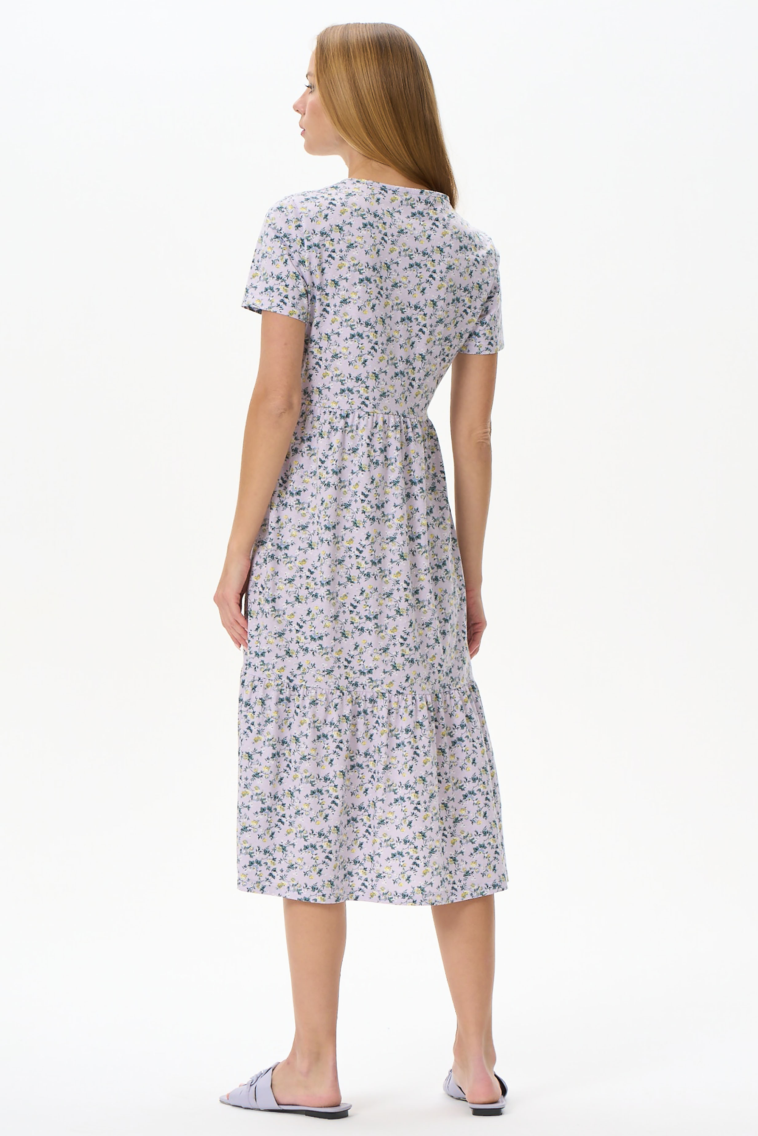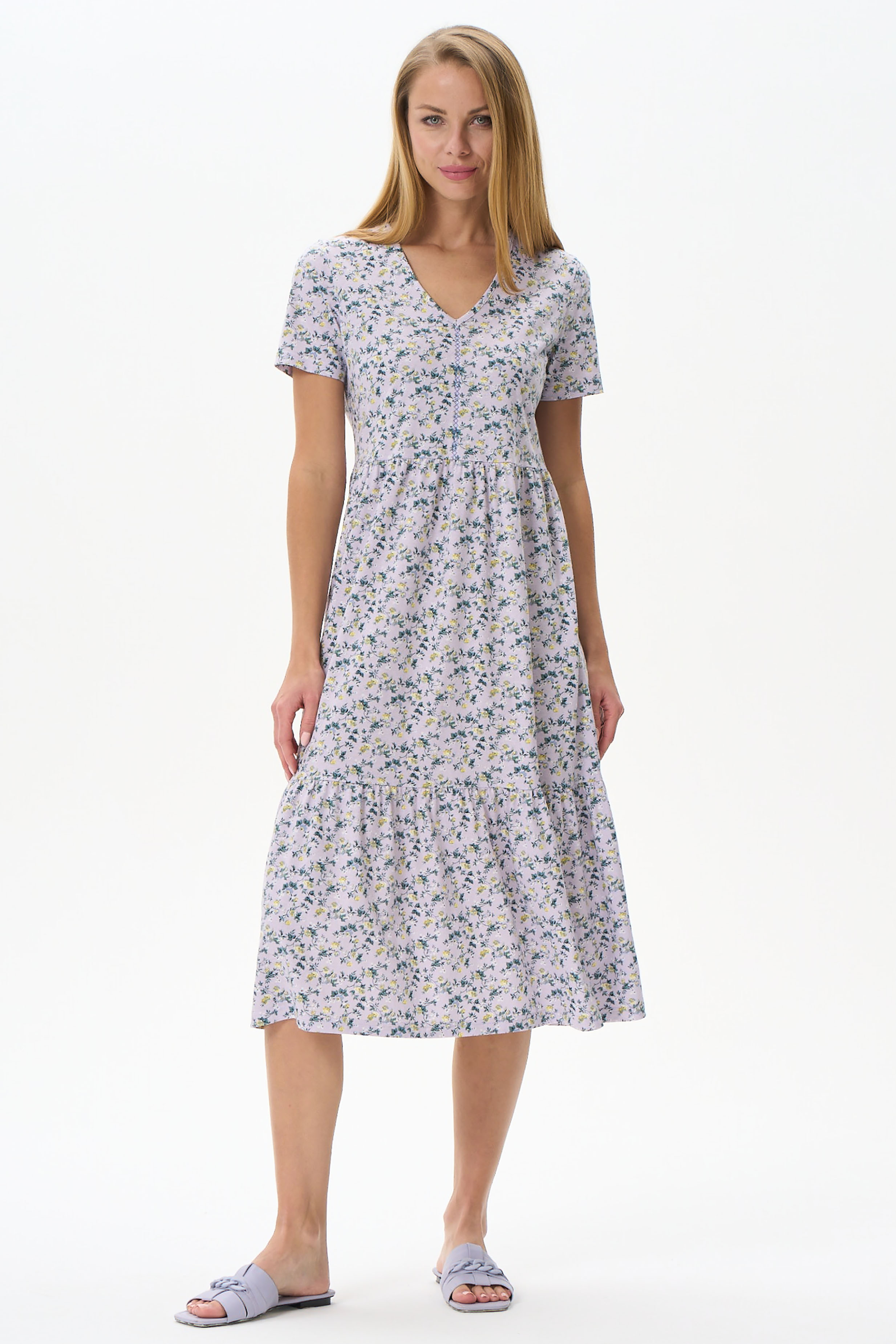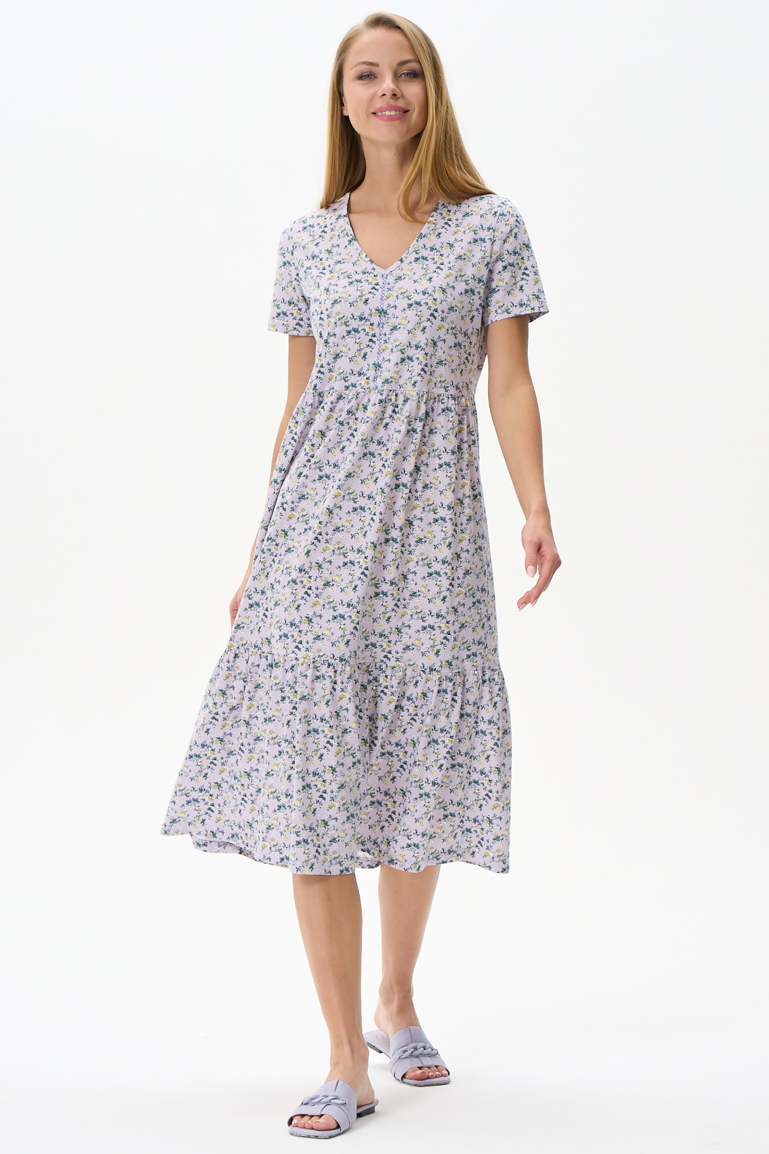 Платье расклешенного силуэта из хлопкового полотна. Вырез горловины V- образной формы, полочка декорирована мережкой. Короткий рукав. Длина ниже колена. Рост модели 177