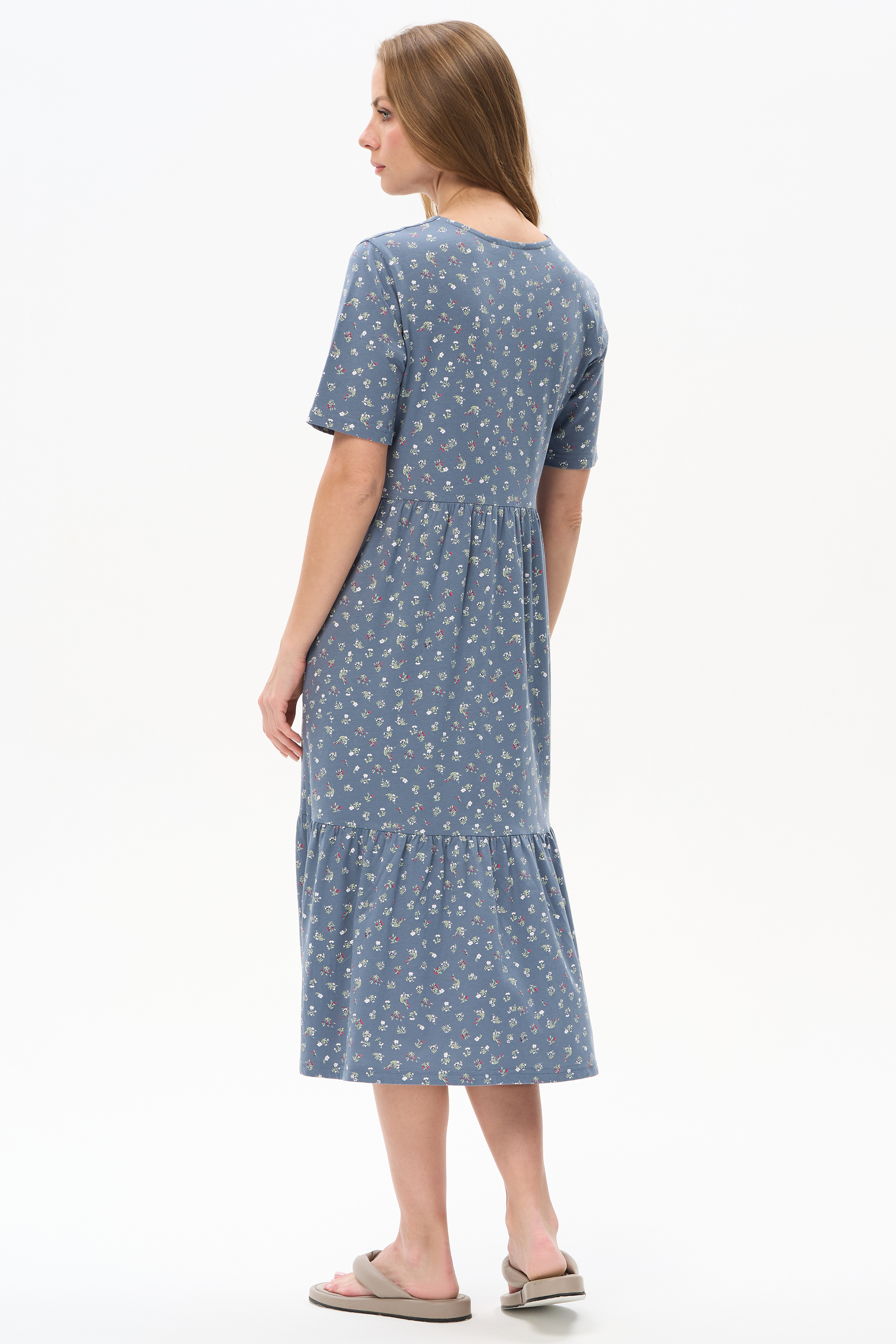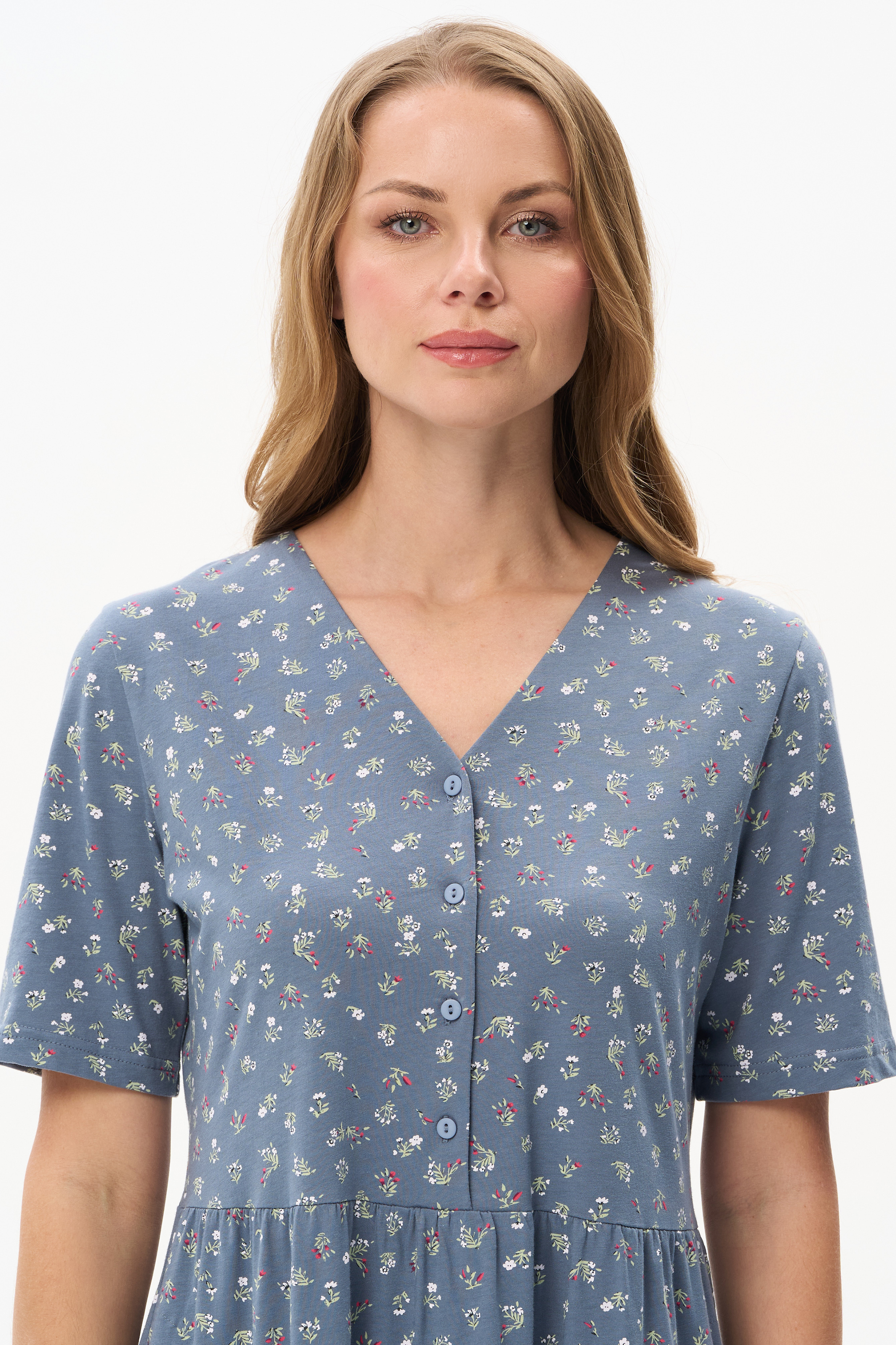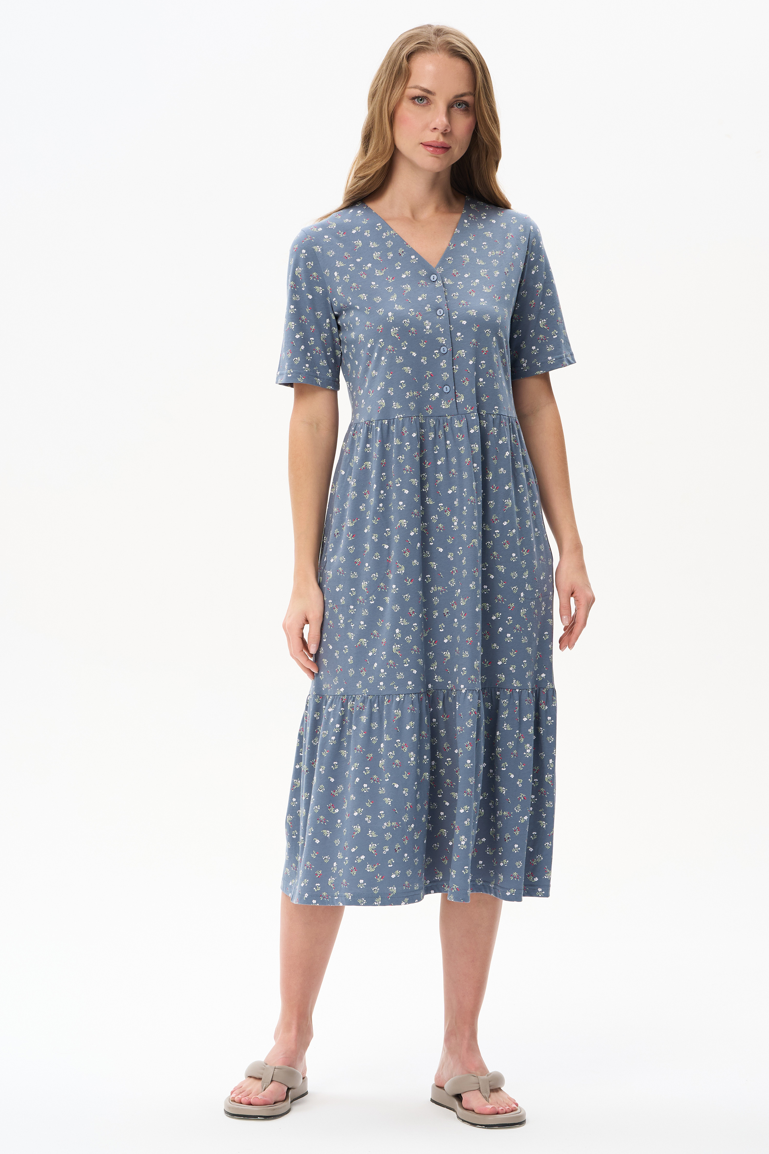100% хлопок Платье расклешенного силуэта из хлопкового трикотажного полотна. Вырез горловины V- образной формы, застежка на пуговицы, в боковых швах карманы. Короткие втачные рукава. Длина изделия ниже колена. Рост модели 175 см.