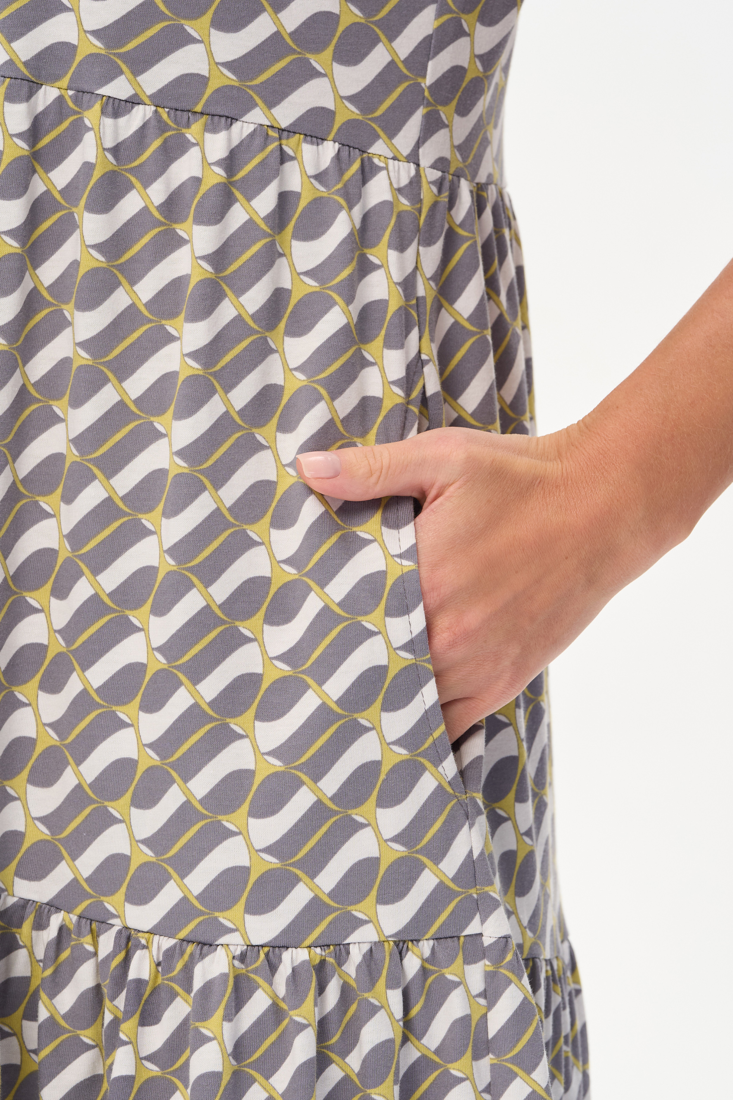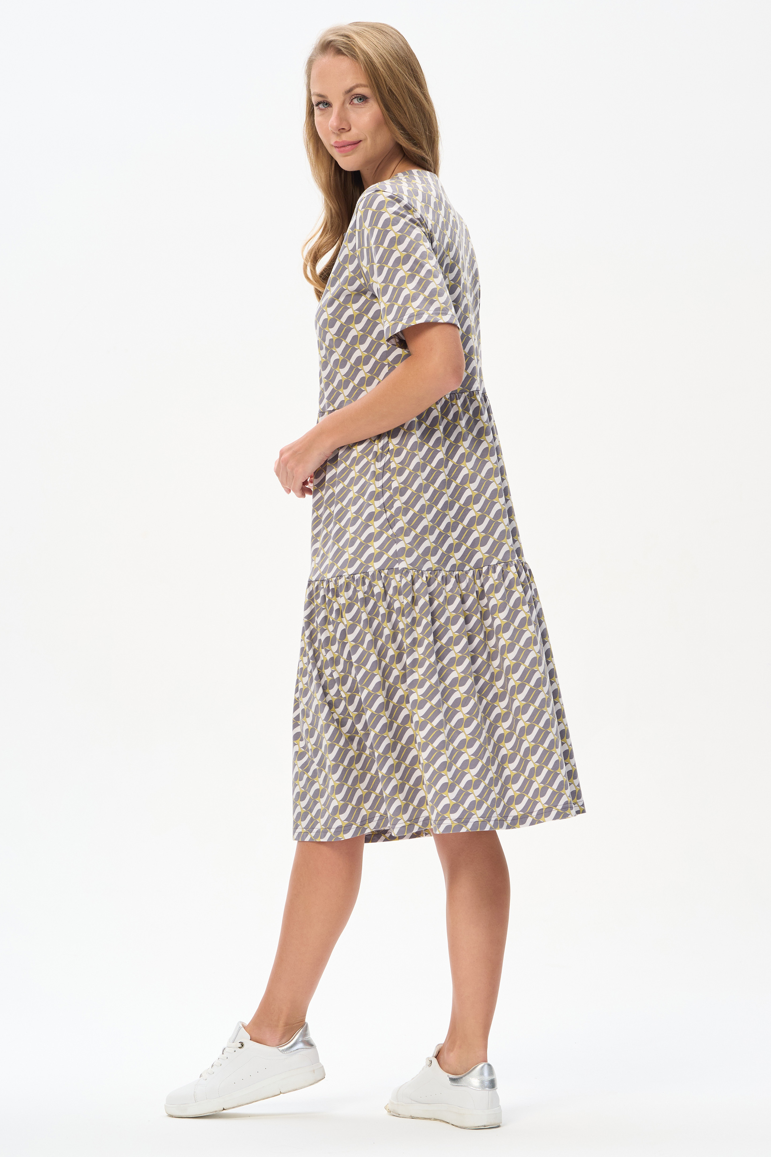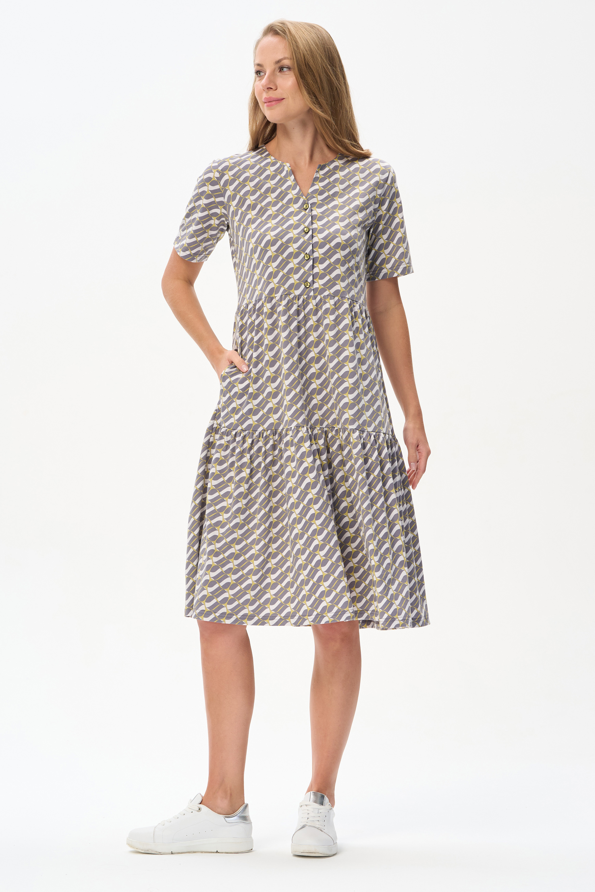 100% хлопок Комфортное ярусное платье из кулирки пенье 150 гр Графический рисунок в стиле Gucci в оттенках коллекции. Круглый вырез горловины, карманы в боковых швах. Модель прекрасно подходит для офиса благодаря рисунку, застежке на эффектные пуговицы и рукава до локтя. Универсальная модель для города и отдыха. Рост модели 175 см.