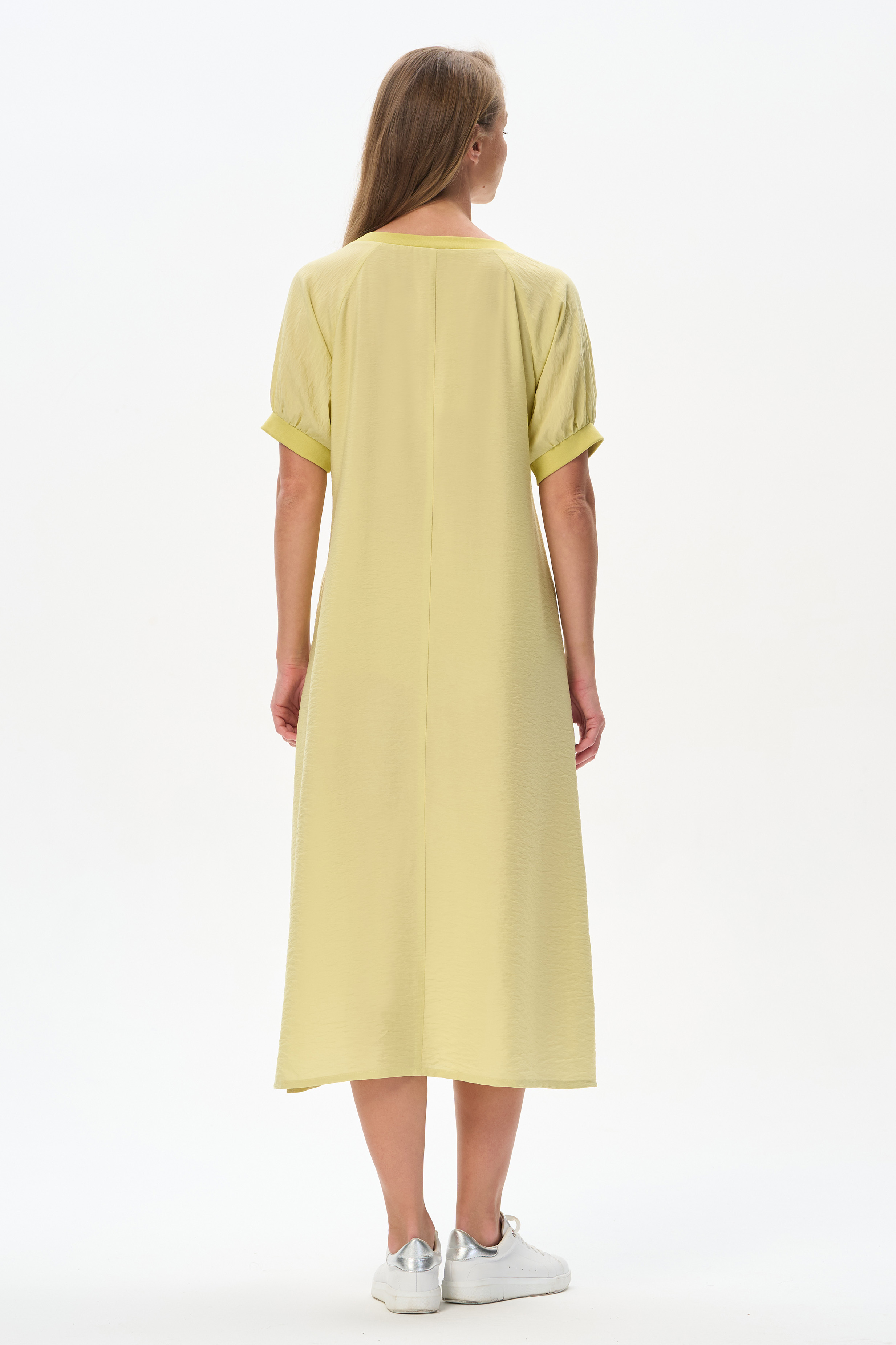 Платье из лёгкой плательной ткани 120 гр в трендовом оттенке. Модель силуэта трапеция, дополнена поясом, с помощью которого можно менять силуэт. Круглый вырез горловины и спущенные рукава обработаны мягким кашкорсе. Платье ниже середины икр,с высоким разрезом в боковом шве. Лёгкая, свободная, комфортная модель для летних образов Рост модели 175 см