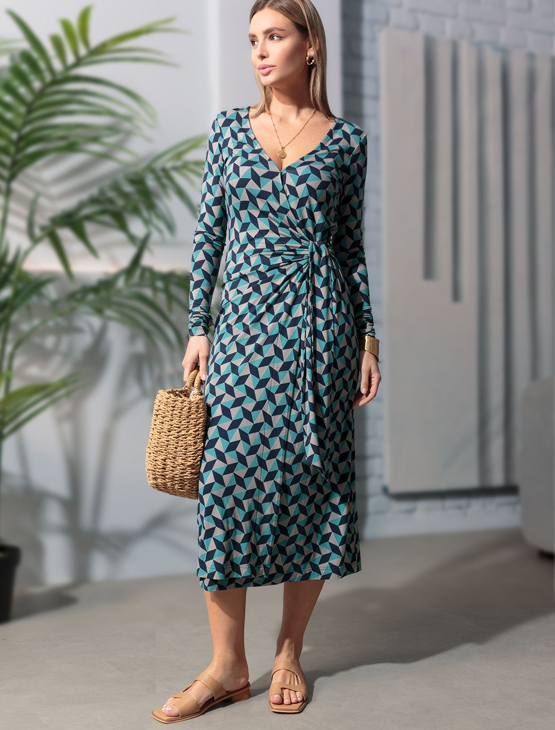 Платье на запАх сшито из трикотажной вискозы с эластаном. V-вырез с мини-копкой на борте с внутренней стороны для фиксации выреза декольте. Запах сходится и завязывается на боковой-пояс ленту. Модель подчеркивает достоинства и изгибы фигуры. А геометрический принт скрывает любые неровности. Роскошь и комфорт, одновременно подчеркивающие стиль, женственность и красоту. сине-зеленый