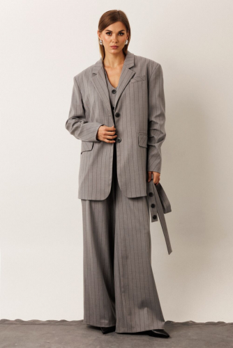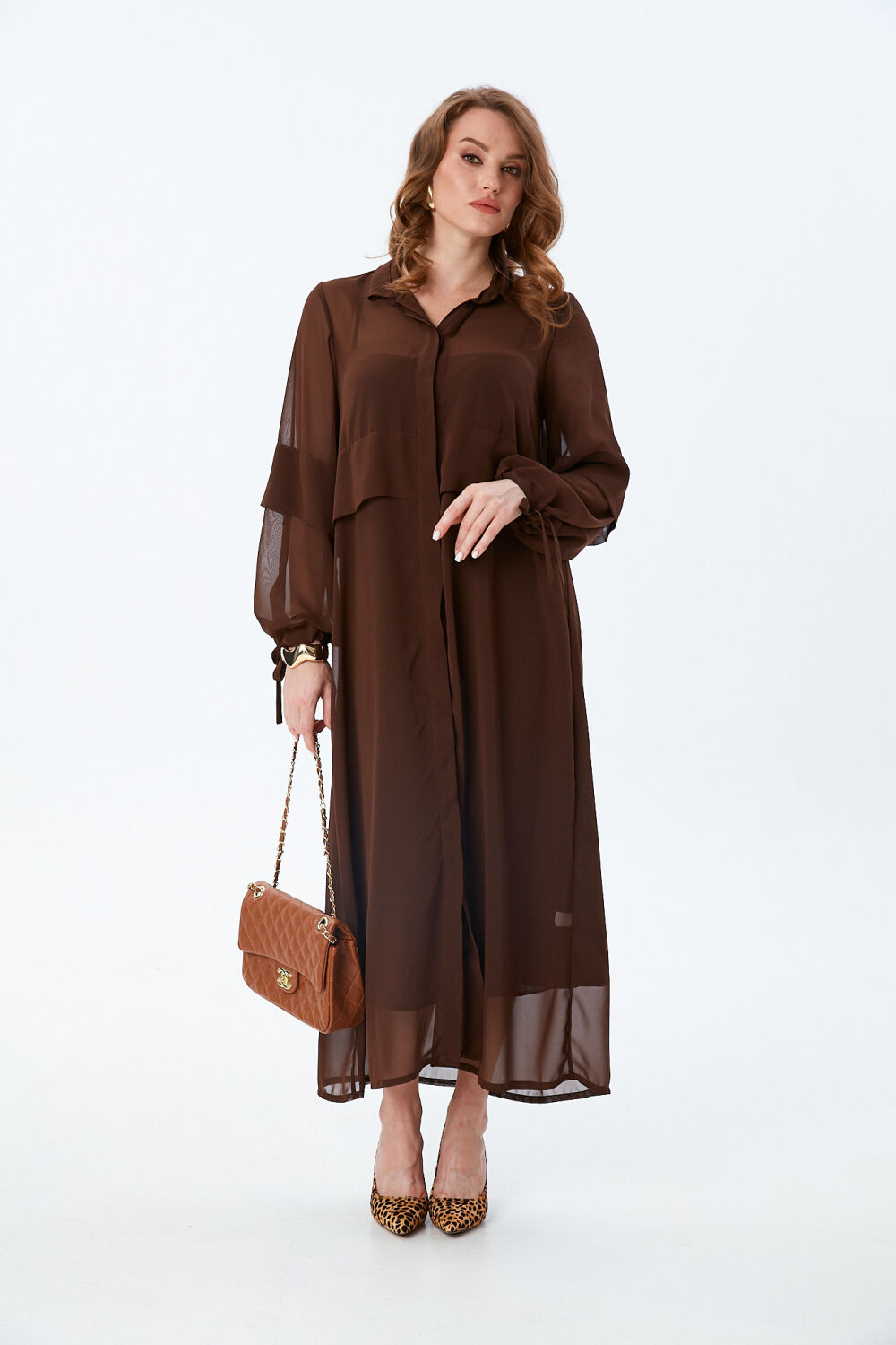 Платье состоит из двух платьев: нижнего и верхнего. Верхнее платье макси с центральной отрезной застёжкой на потайную планку на петли и пуговицы.По переду и спинке цельнокроеные складки на уровне талии. Рукав втачной,одношовный рубашечноно типа. По низу рукава пробиты петли и вставлена завязка для фиксации сборки . Воротник рубашечный стояче отложной. Нижнее платье комбинация на регулируемых бретелях.