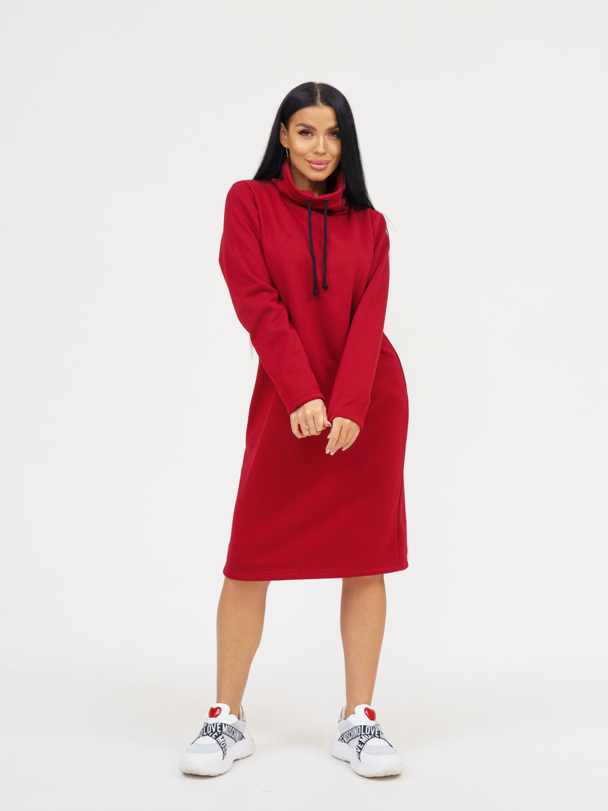 Платье утепленное с начесом-барашек имеет прямой крой, длинный рукав и удобный воротник-стойку, который защитит от ветра. Воротник стойка оформлен крупным шнурком без наконечников (обработан узлом).