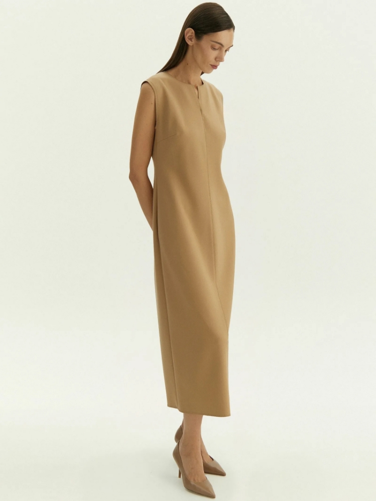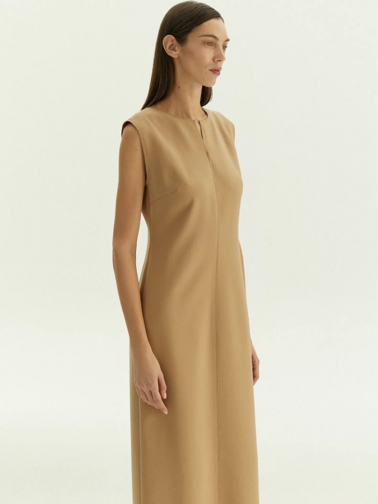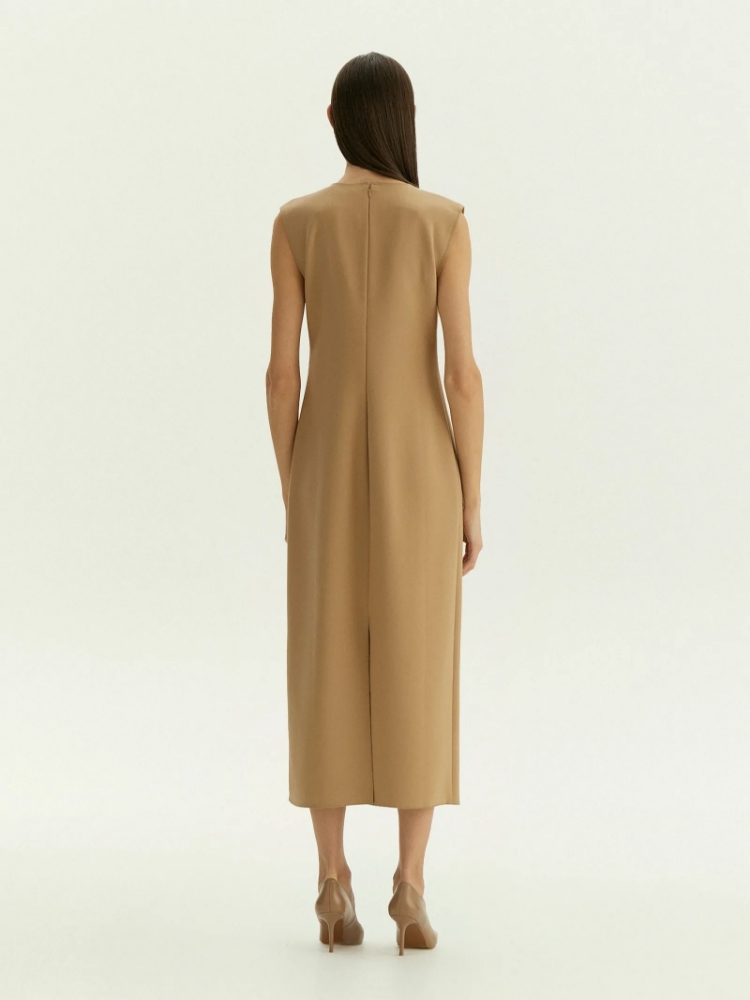 Платье-футляр из очень мягкого, приятного на ощупь трикотажа в телесно-бежевом цвете станет отличным вариантом на каждый день. Приталенную модель без рукавов отличает акцентный шов. Модель выполнена в длине мидакси, которая не теряет актуальности и подходит к любому случаю.Платье может стать частью капсулы с топом tucomo в том же стиле