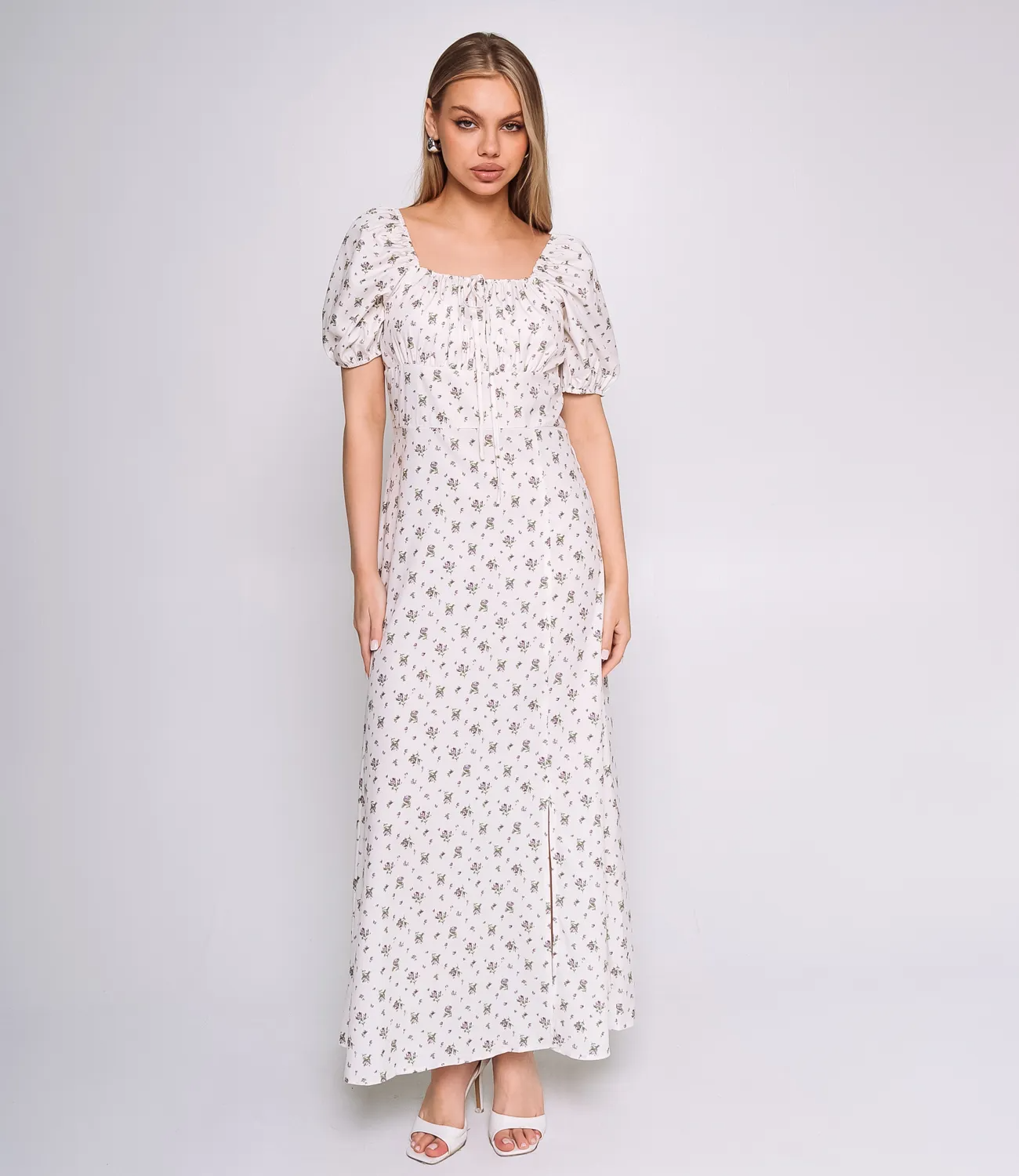 Платье — это незаменимый элемент гардероба, который подчеркивает женственность каждой девушки. Эта модель выполнена из качественной ткани, состоящей на 95% полиэстера и 5% спандекса, что обеспечивает не только комфорт, но и отличный внешний вид. Модель имеет длину макси, прилегает к талии благодаря широкой вставке, создавая силуэт с завышенной талией. Верхняя часть платья оформлена объемными короткими рукавами длиной чуть выше локтя и квадратным вырезом горловины с небольшой завязкой спереди, придающей романтичный вид. Также присутствует цветочный принт. Обратите внимание на насыщенные цвета и текстуру материала, которые отлично переданы на фотографиях на сайте. Для уверенности в выборе размера мы представили на странице таблицу измерений. Воспользовавшись ею, ваши клиентки смогут легко подобрать нужный размер. Предложенная цена на это платье является доступной для оптовых покупателей, что делает его отличным дополнением к вашему ассортименту. Не упустите возможность предложить своим клиентам стильное и комфортное платье, которое подчеркнет их индивидуальность и сделает их неотразимыми! Рост модели: 168, параметры: 89-63-90.