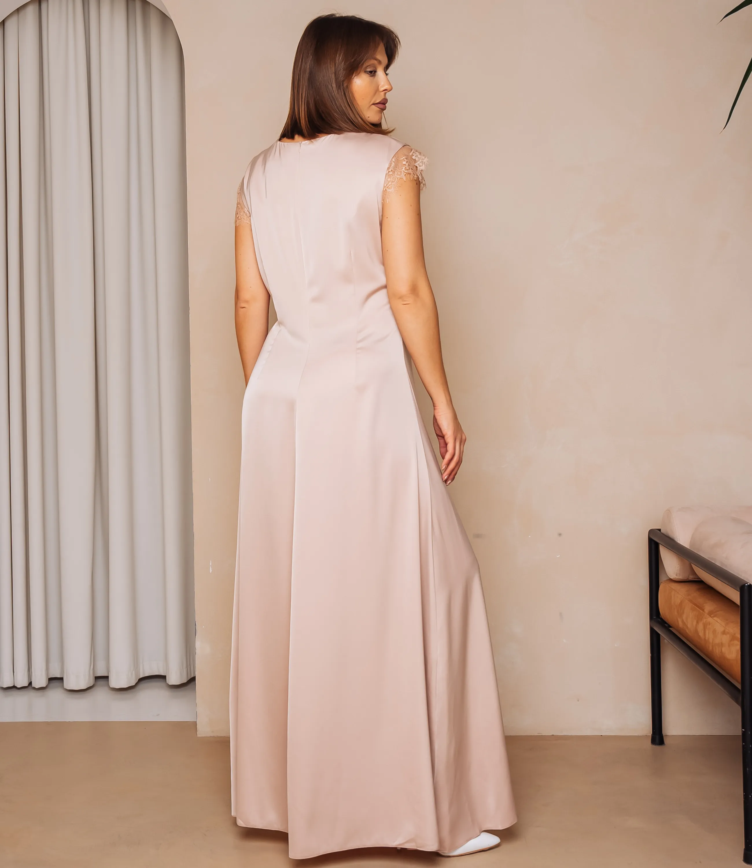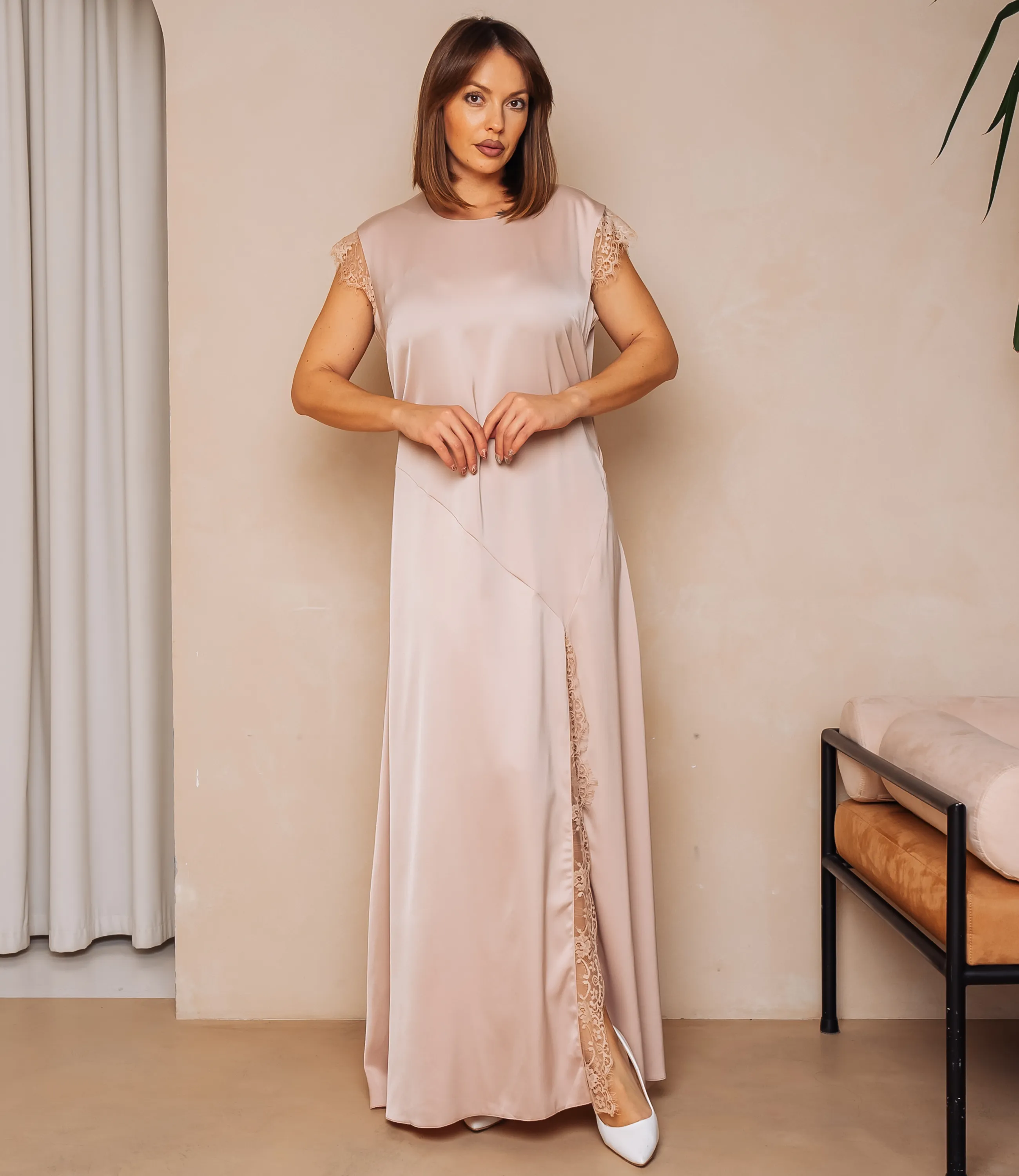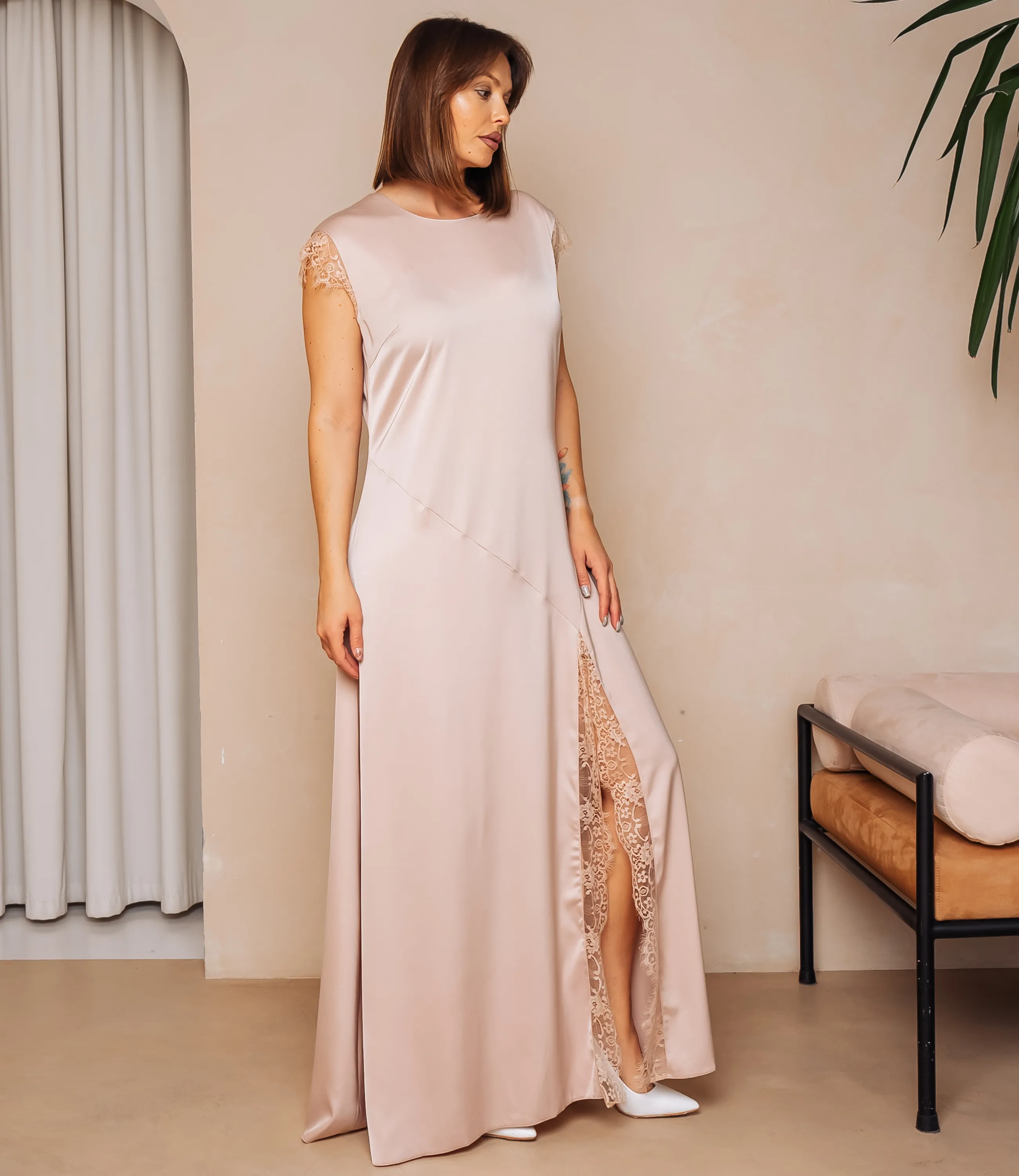 Платье — это часть гардероба, которая подчёркивает женственность каждой женщины. Длинное платье прямого, слегка расширяющегося книзу силуэта из гладкой струящейся ткани с мягким блеском, имеет круглую неглубокую горловину и короткие рукава с тонким кружевным кантом, силуэт облегает верхнюю часть туловища и плавно спадает вниз, с имитацией косой́ вставки по передней ноге, где выполнен высокий разрез, украшенный кружевной аппликацией, открывающей часть бедра; швы аккуратно выполнены, низ изделия ровный. Для пошива использована ткань: 95% полиэстер, 5% спандекс. При соблюдении рекомендаций по уходу изделие сохраняет форму и цвет после многократных стирок, что снижает вероятность возвратов и важно для розничной торговли. Цвет и фактура соответствуют фотографии на сайте, что облегчает демонстрацию товара покупательницам. На странице представлена таблица размеров, с помощью которой вы сможете корректно сформировать ассортимент и подобрать модели для разных групп клиентов. Производитель обеспечивает аккуратную отделку и надёжную фурнитуру; оптовые условия поставки позволяют получить привлекательную маржинальность для магазинов. Рекомендуем включить это платье в ассортимент оптовых закупок — оно станет востребованным предложением для клиенток, ищущих элегантную и универсальную модель.