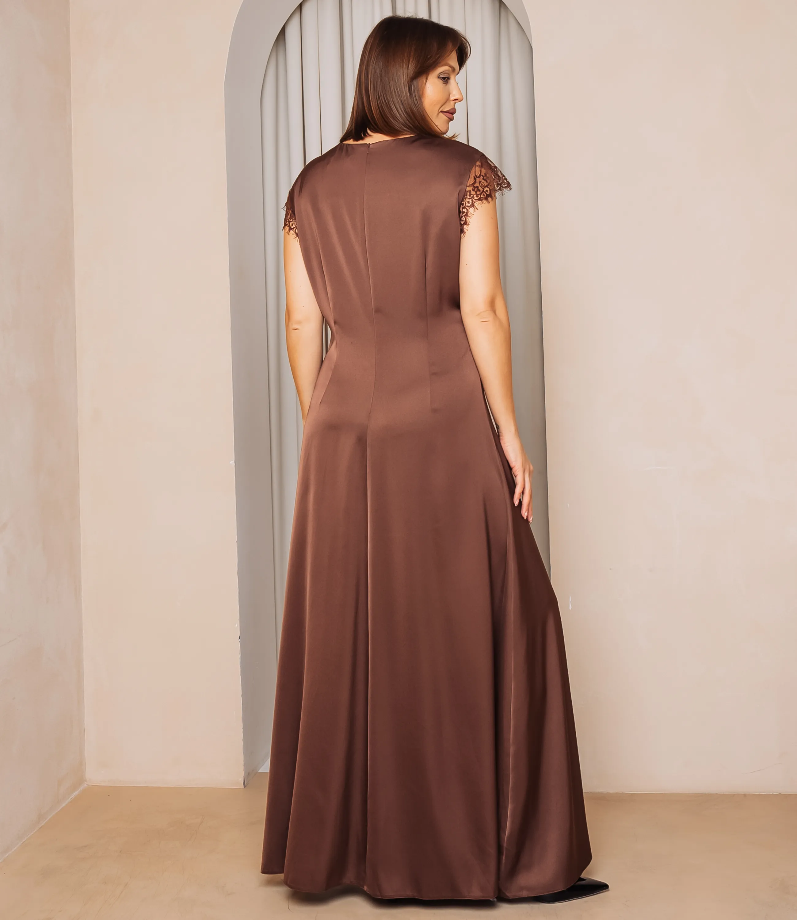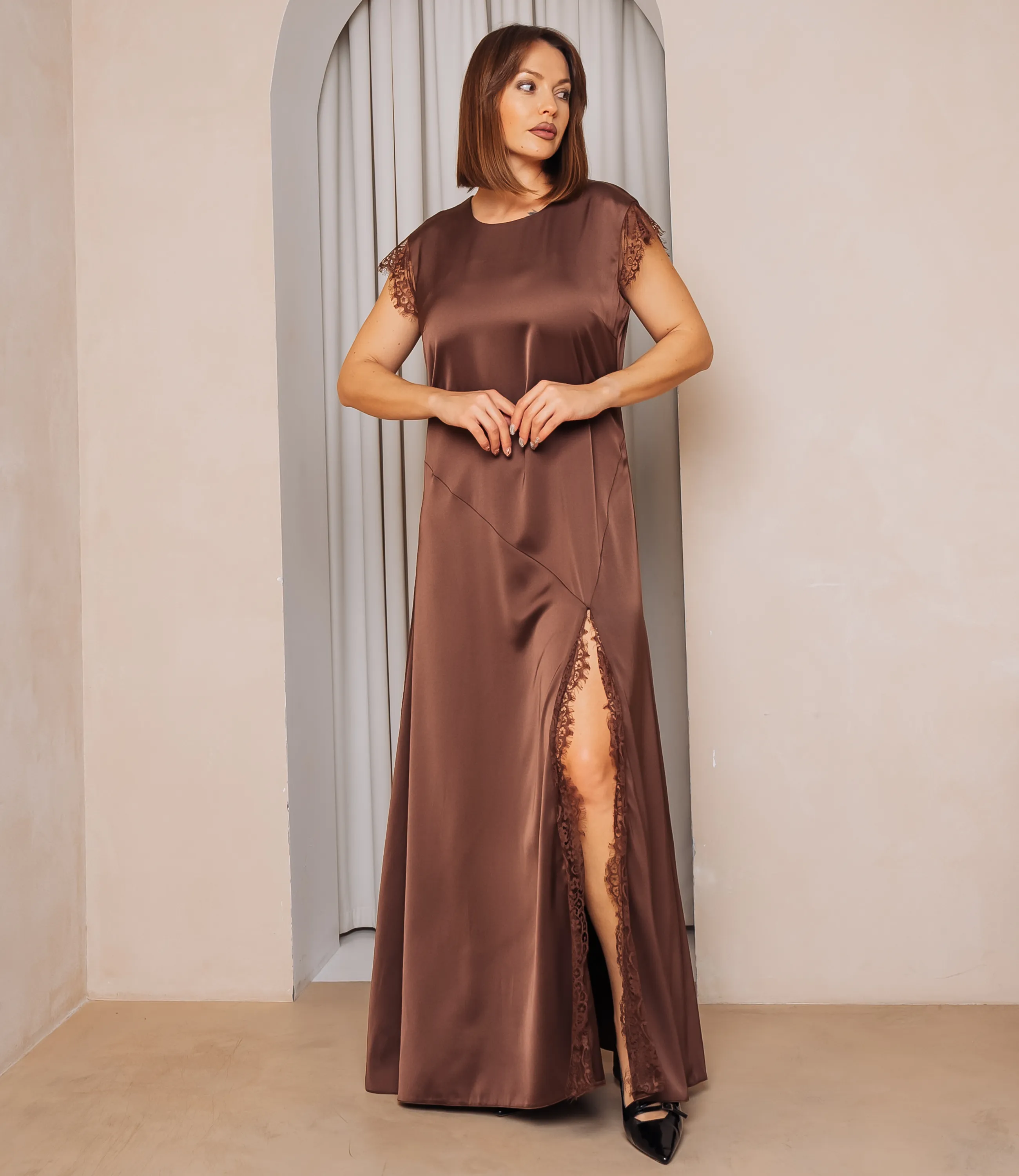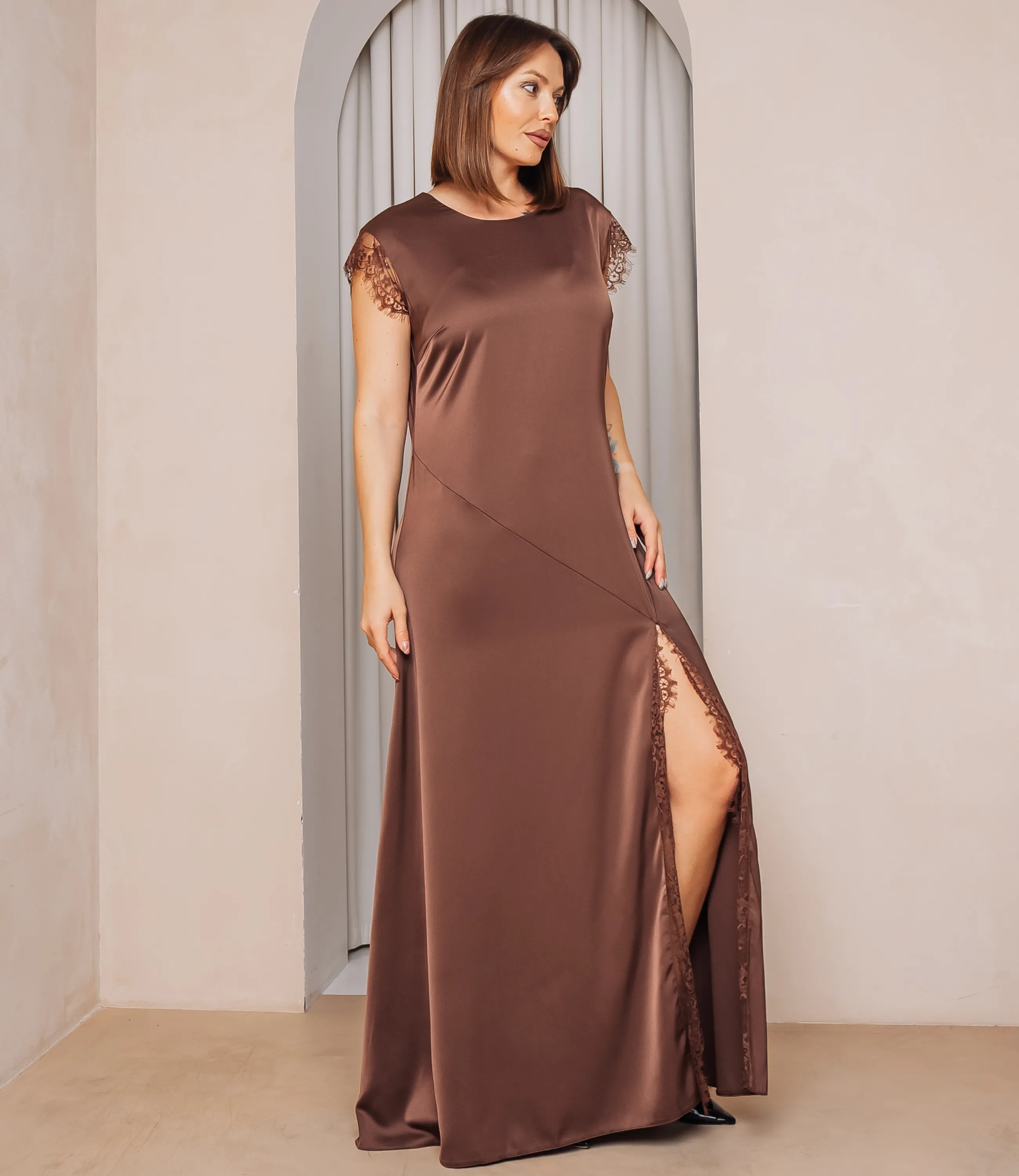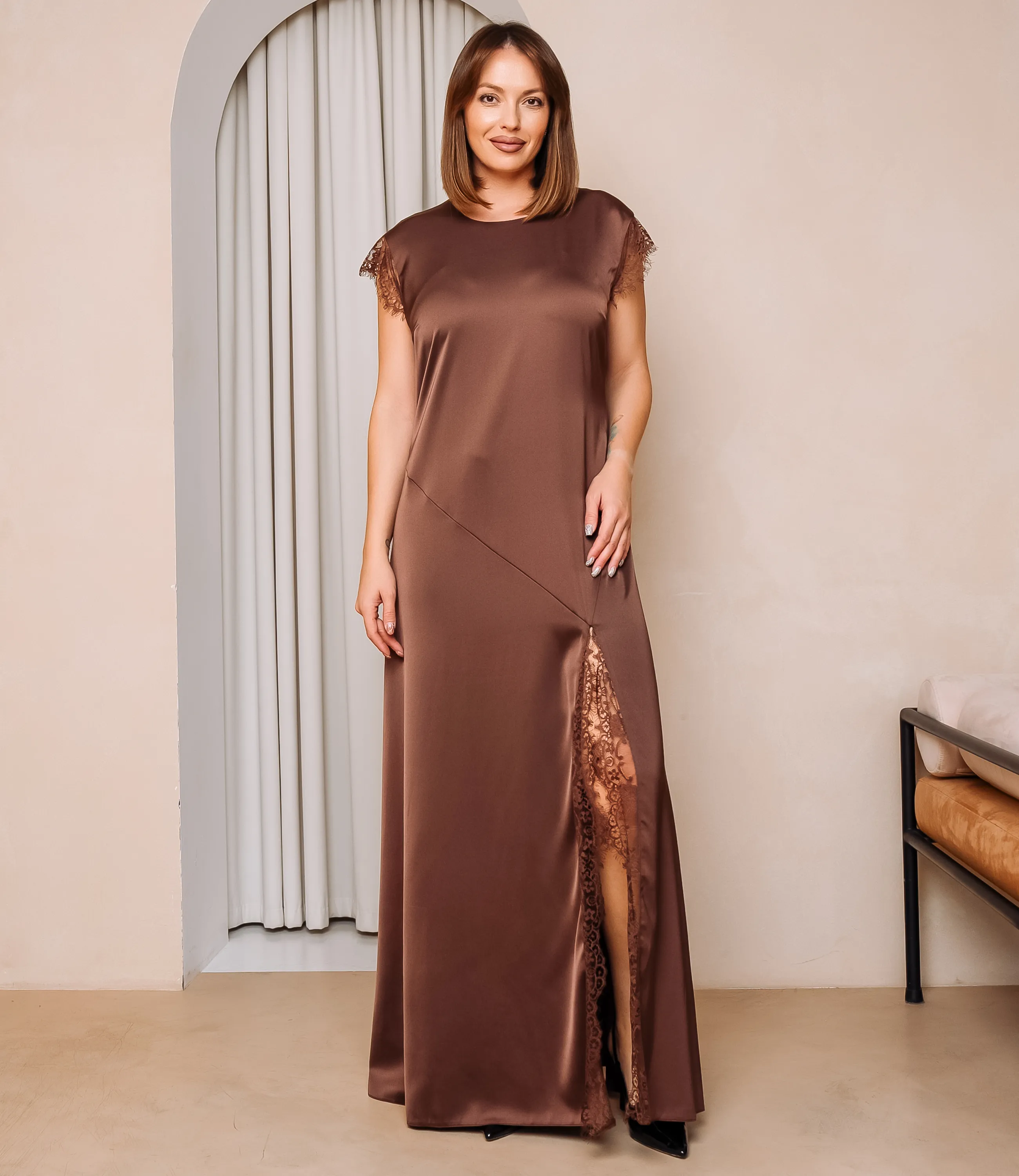 Платье — это часть гардероба, которая подчёркивает женственность каждой женщины. Длинное платье прямого, слегка расширяющегося книзу силуэта из гладкой струящейся ткани с мягким блеском, имеет круглую неглубокую горловину и короткие рукава с тонким кружевным кантом, силуэт облегает верхнюю часть туловища и плавно спадает вниз, с имитацией косой́ вставки по передней ноге, где выполнен высокий разрез, украшенный кружевной аппликацией, открывающей часть бедра; швы аккуратно выполнены, низ изделия ровный. Для пошива использована ткань: 95% полиэстер, 5% спандекс. При соблюдении рекомендаций по уходу изделие сохраняет форму и цвет после многократных стирок, что снижает вероятность возвратов и важно для розничной торговли. Цвет и фактура соответствуют фотографии на сайте, что облегчает демонстрацию товара покупательницам. На странице представлена таблица размеров, с помощью которой вы сможете корректно сформировать ассортимент и подобрать модели для разных групп клиентов. Производитель обеспечивает аккуратную отделку и надёжную фурнитуру; оптовые условия поставки позволяют получить привлекательную маржинальность для магазинов. Рекомендуем включить это платье в ассортимент оптовых закупок — оно станет востребованным предложением для клиенток, ищущих элегантную и универсальную модель.