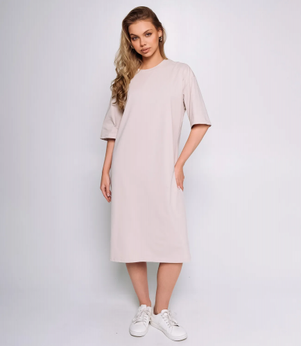 Платье бежевого цвета с простым и элегантным дизайном станет настоящим хитом в вашем магазине. Оно выполнено из высококачественного материала, состоящего на 50% из хлопка и 50% из полиэстера, что обеспечивает комфорт и долговечность. Свободный крой и длина до колен делают его универсальным вариантом, который подходит для многих типов фигур. Короткие рукава добавляют легкости и свежести этому изделию, а возможность комбинировать его с разной обувью открывает множество стильных решений. Это платье легко сочетается с различными аксессуарами и верхней одеждой, что позволяет вашим покупательницам создать свой уникальный стиль. Обратите внимание на качество материала: оно мягкое и приятное на ощупь, что делает его идеальным для ношения в любое время года. На сайте размещена таблица размеров, чтобы ваши клиентки могли без труда подобрать идеальный вариант. Платье представлено по доступной цене, что делает его отличным предложением для оптовых покупателей. Не упустите возможность предложить своим клиентам это стильное и комфортное платье, которое станет любимым элементом их гардероба! Рост модели: 168, параметры: 89-63-90.