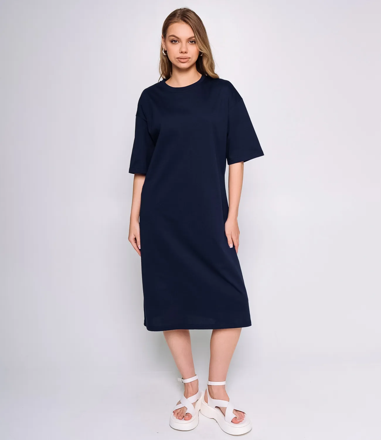 Платье тёмно-синего цвета с простым и элегантным дизайном станет настоящим хитом в вашем магазине. Оно выполнено из высококачественного материала, состоящего на 50% из хлопка и 50% из полиэстера, что обеспечивает комфорт и долговечность. Свободный крой и длина до колен делают его универсальным вариантом, который подходит для многих типов фигур. Короткие рукава добавляют легкости и свежести этому изделию, а возможность комбинировать его с разной обувью открывает множество стильных решений. Это платье легко сочетается с различными аксессуарами и верхней одеждой, что позволяет вашим покупательницам создать свой уникальный стиль. Обратите внимание на качество материала: оно мягкое и приятное на ощупь, что делает его идеальным для ношения в любое время года. На сайте размещена таблица размеров, чтобы ваши клиентки могли без труда подобрать идеальный вариант. Платье представлено по доступной цене, что делает его отличным предложением для оптовых покупателей. Не упустите возможность предложить своим клиентам это стильное и комфортное платье, которое станет любимым элементом их гардероба! Рост модели: 168, параметры: 89-63-90.