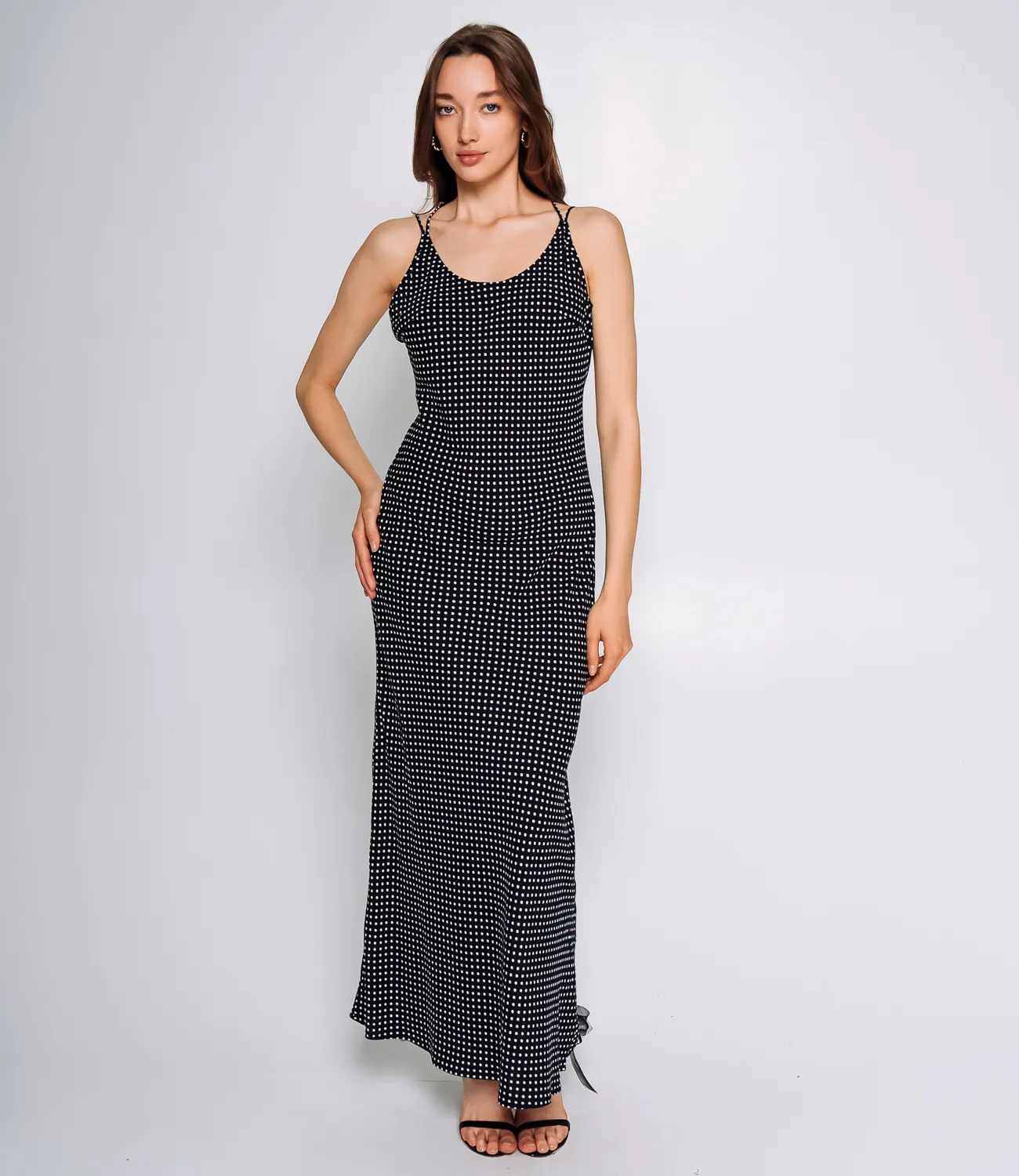 Платье выполнено из 100% вискозы, что придает ткани легкость, воздушность и приятное шелковистое ощущение при соприкосновении с кожей. Материал обладает хорошей драпировкой, благодаря чему платье свободно и плавно облегает фигуру, создавая элегантный силуэт. Модель имеет удлиненный прямой крой макси-длины, который нежно опускается до пола, создавая изящные линии. Платье оснащено тонкими регулируемыми бретелями, придающими ему легкость и открывая плечи и верхнюю часть спины. Горловина образует аккуратный округлый вырез, подчеркивающий зону декольте. По всей поверхности изделия расположен равномерный принт из мелких геометрических фигур, что придает платью изысканность и стиль. Отсутствие дополнительных деталей или декоративных элементов делает модель универсальной и лаконичной, позволяя использовать её как в повседневной жизни, так и для более официальных или вечерних мероприятий. Подарите своим клиентам возможность наслаждаться стилем и комфортом в этом замечательном платье! Рост 168, 85-63-92.