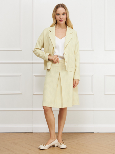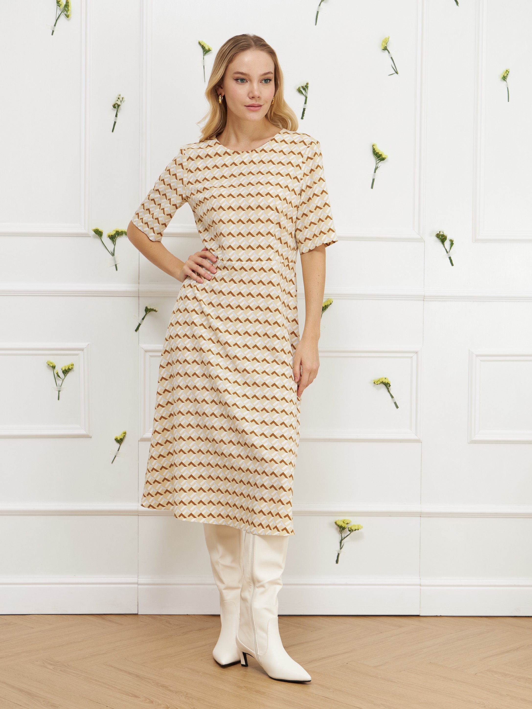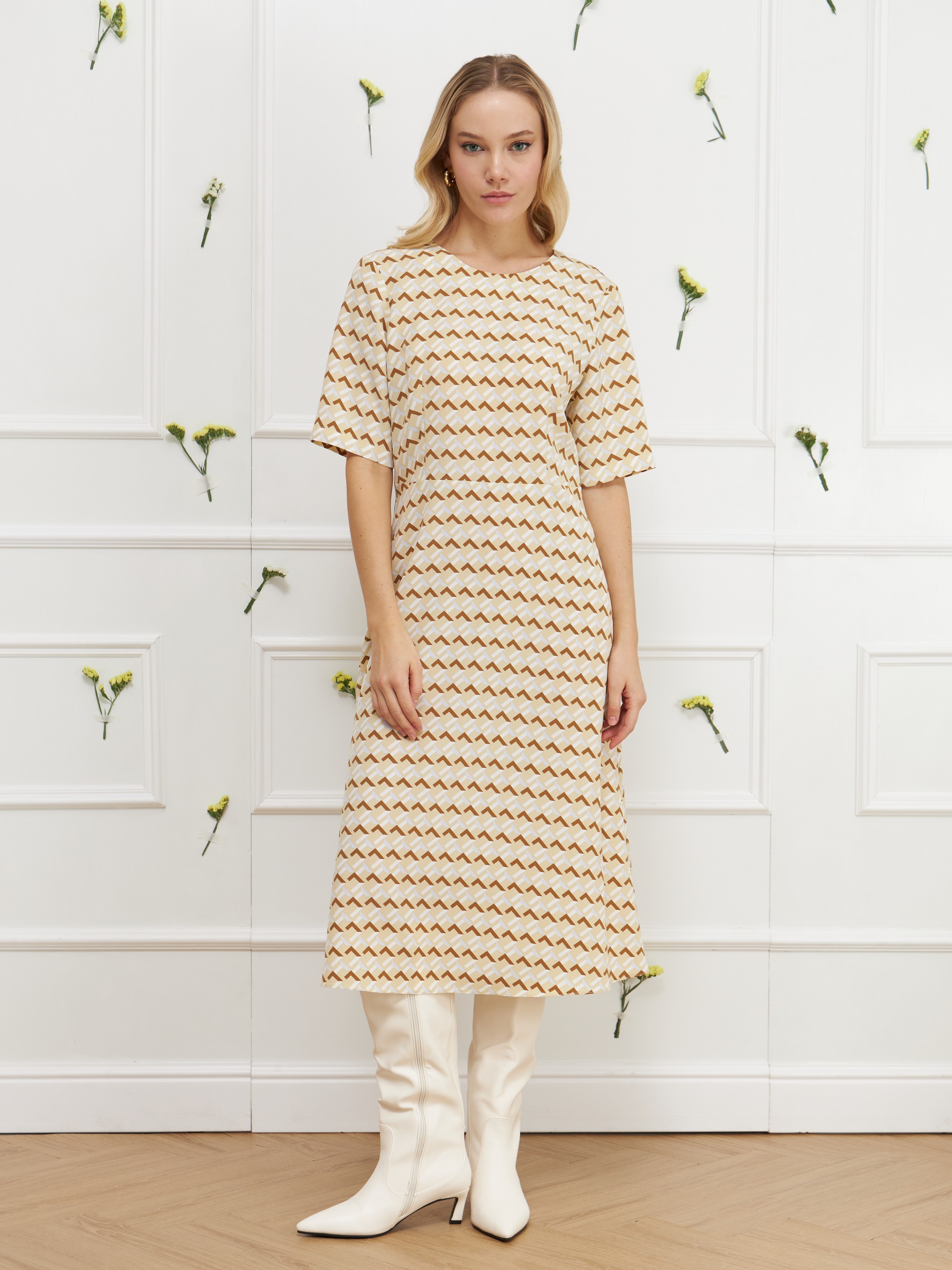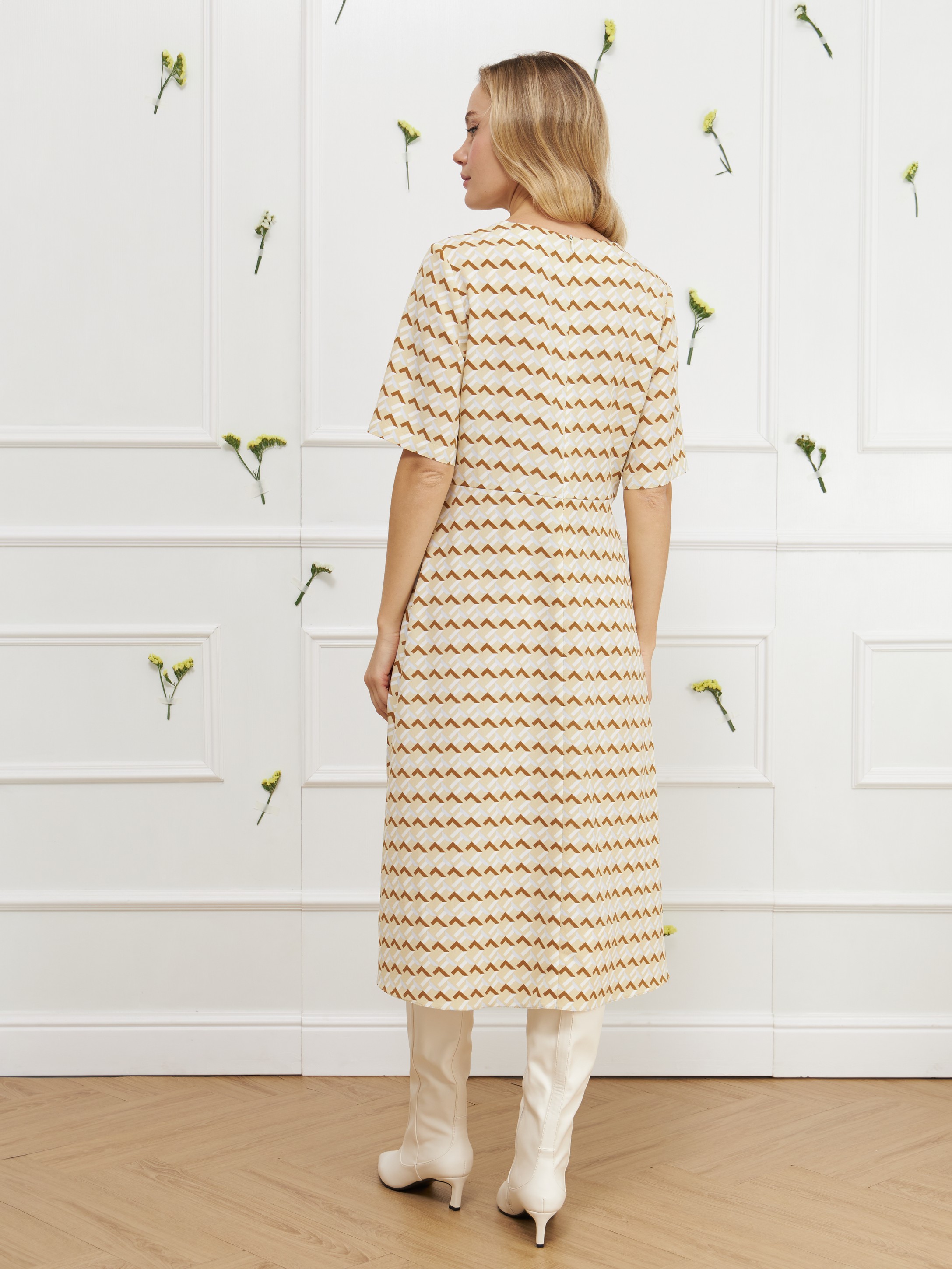 Приталенное платье длины миди, с короткими рукавами, выполнили из дышащей ткани с мелким графичным принтом в солнечной палитре. Модель с чуть расклешенной юбкой застегивается сзади на потайную молнию.