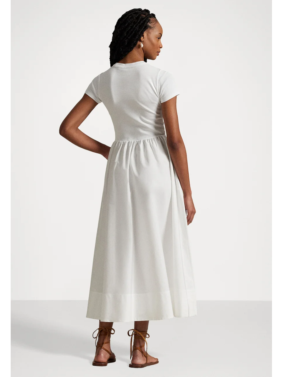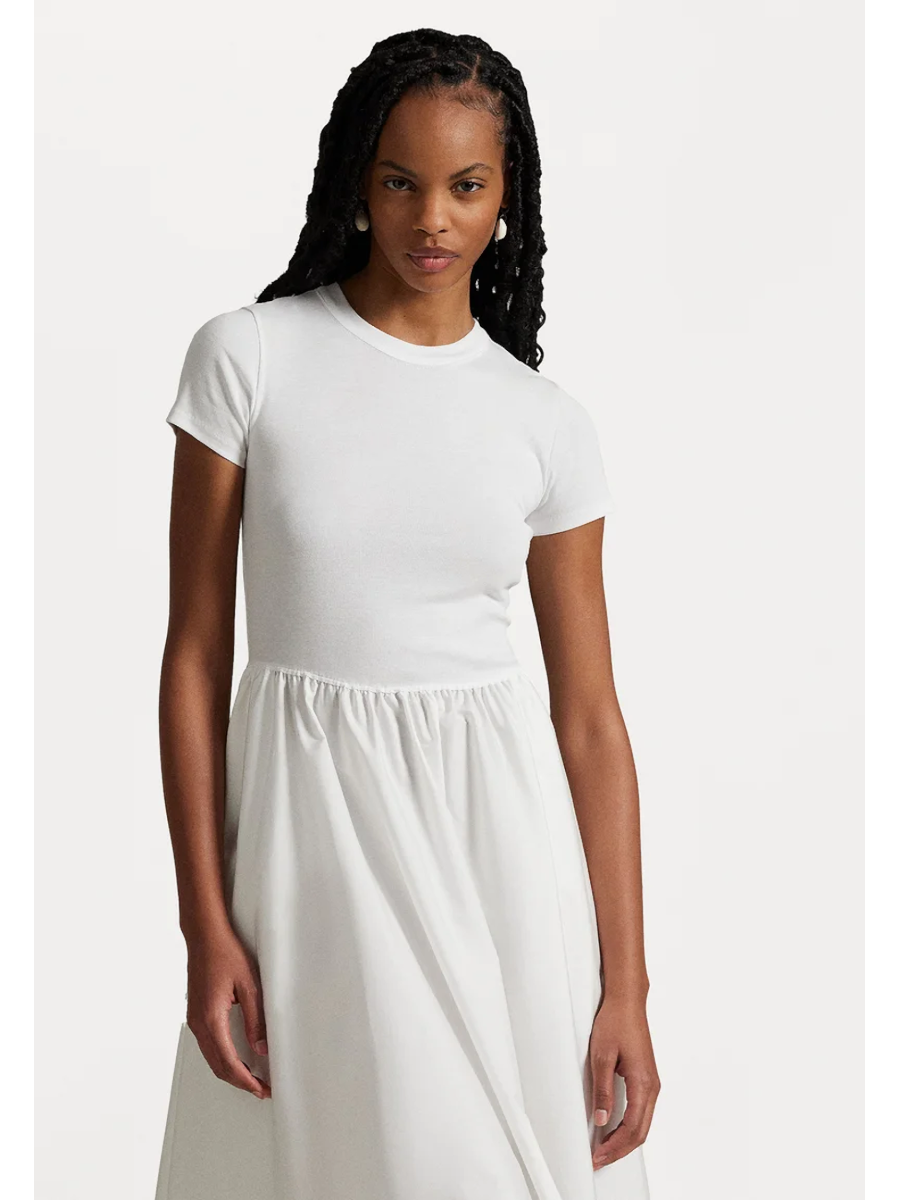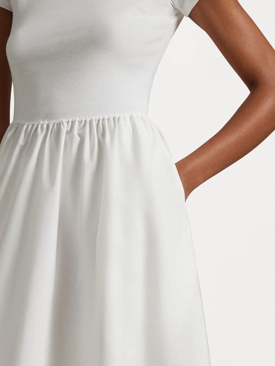 Это универсальное платье сочетает в себе облегающий хлопковый топ с круглым вырезом и струящуюся поплиновую юбку А-силуэта со сборками на талии для дополнительного объема.