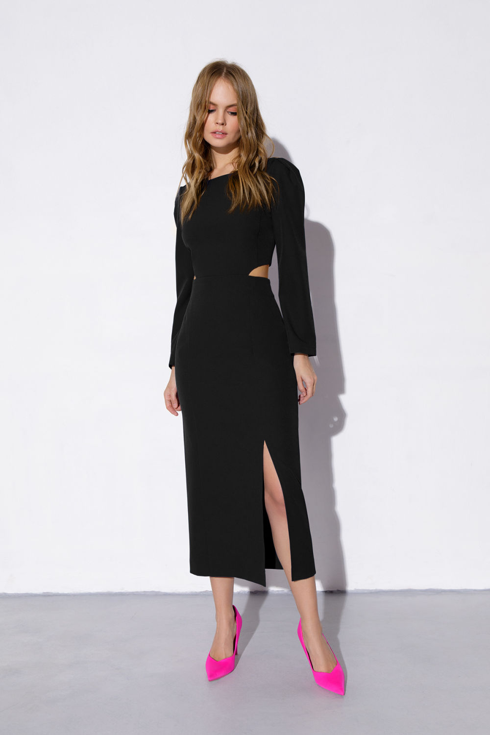 Текстильное миди-платье прилегающего силуэта с декоративными вырезами. Детали: отрезная завышенная линия талии, нагрудные вытачки, смещенные рельефы, спинка со средним швом и потайными молниями, рукава укороченные со складками по окату