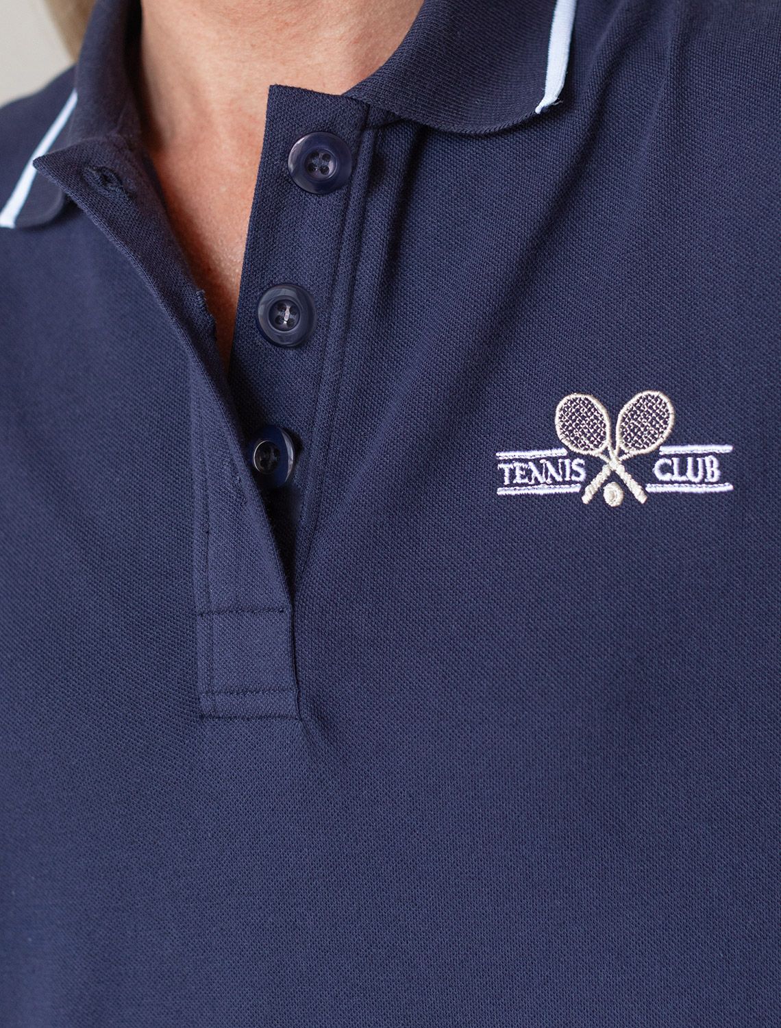 Платье-поло выполнено из фактурного трикотажа. Перевод принта: Теннисный клуб