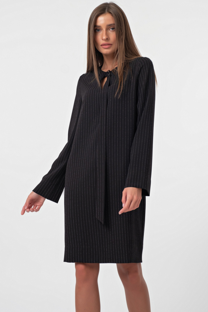 • Особенности: Платье прямого силуэта из креповой ткани в тонкую полоску. Детали: округлая форма горловины, по горловине отделка с двумя полукольцами и длинной завязкой, рукав втачной с широкой подгибкой слегка расклешенный, по низу изделия - широкая подгибка.
