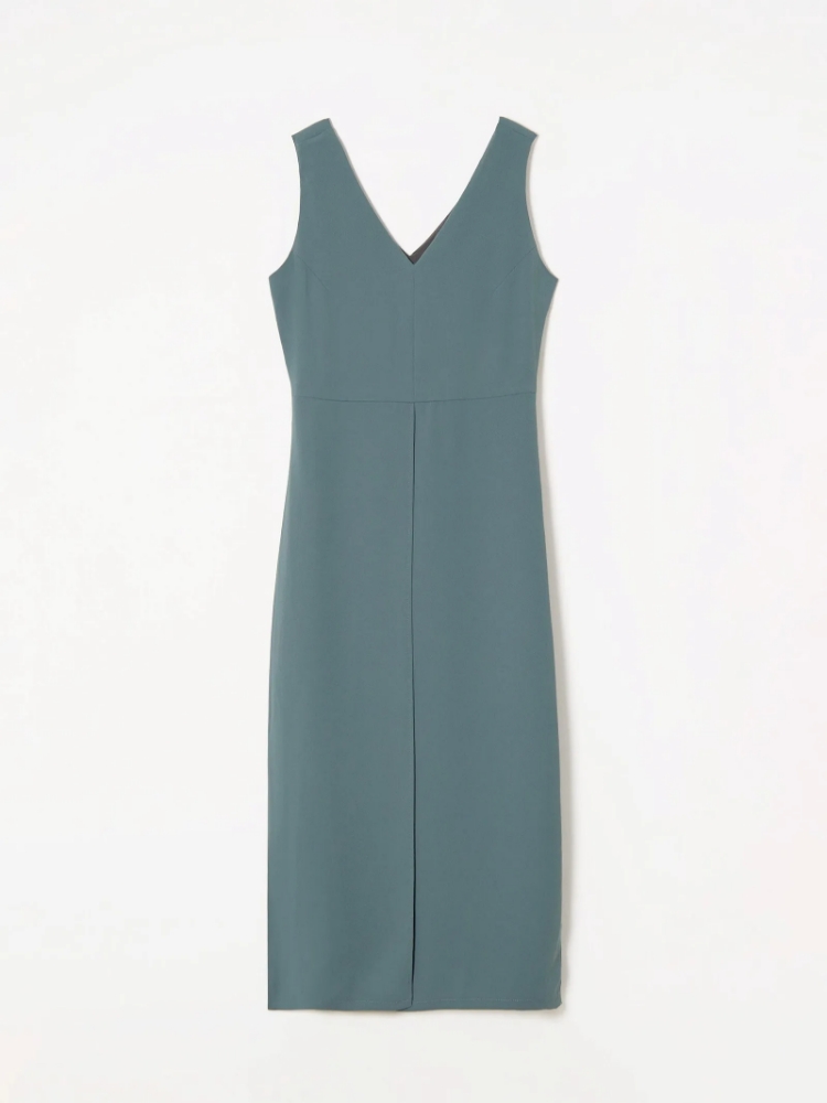 Эффектное платье на каждый день в модном оттенке зелёного. Хорошо подойдёт в качестве первого слоя под базовые жакеты. Модель без рукавов красиво открывает руки, ключицы и спину за счёт V-образного декольте и выреза сзади. Разрез обеспечивает свободу движений. Приталенная модель имеет длину миди. Изделие выполнено из материала с высоким содержанием вискозы, на подкладке