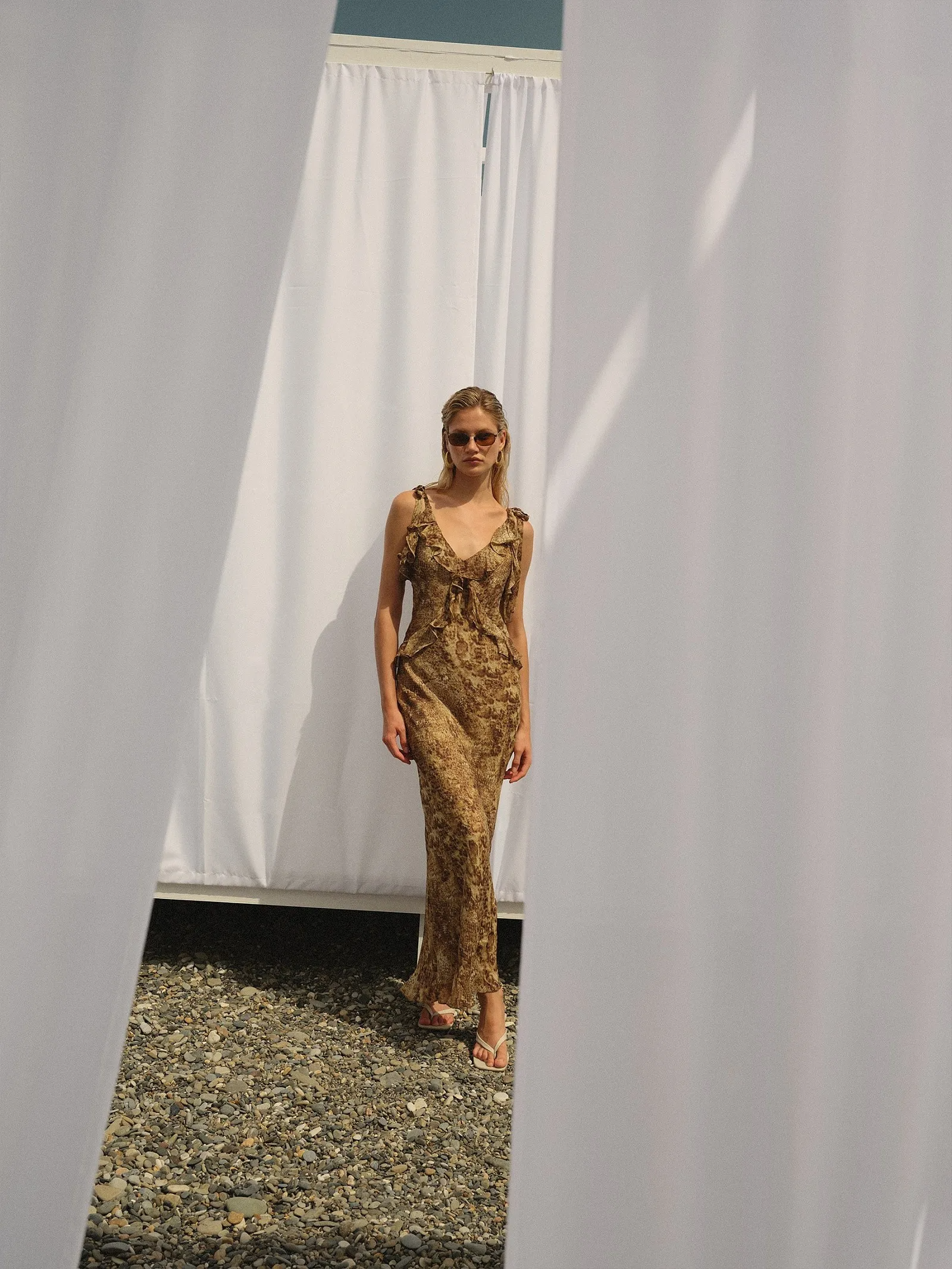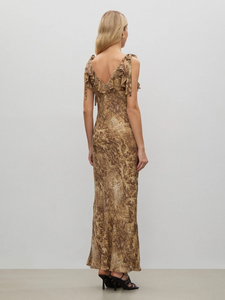 Модное платье с анималистическим принтом добавит пикантности образу. Благодаря цветовой гамме подойдёт как для контрастной, так и для более нежной внешности. Модель отличается модными бантами-завязками на плечах и гирляндами из воланов, крест-накрест спускающимися от плеч к талии. Интересный выбор для отпуска или вечеринки. В будние дни платье можно "успокоить" базовым чёрным жакетом и носить с трендовыми мюлями