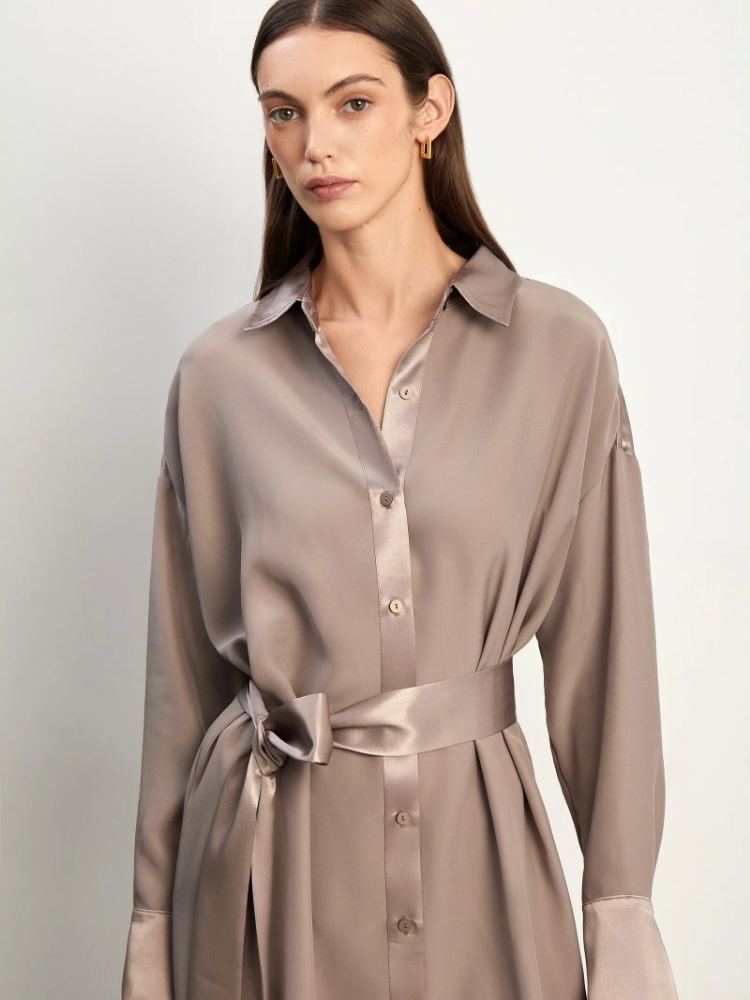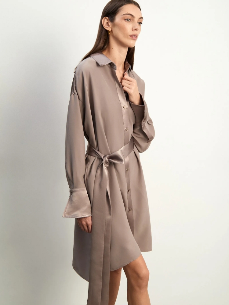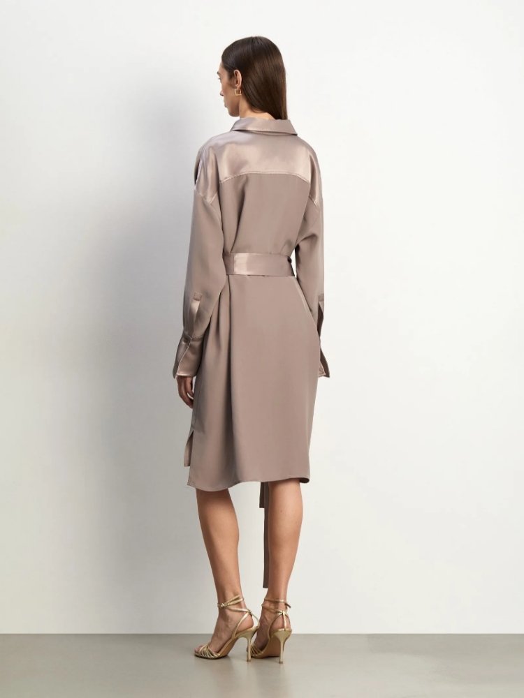 Элегантное и необычное платье-рубашка в цвете мокко. Манжеты и линия плеч, воротник и планка, а также пояс-кушак выполнены из атласа. Интересный контраст между матовой и атласной фактурами делает платье отличным выбором как для будней, так и для праздников. Приталенный силуэт и длина чуть выше колена являются универсальным решением, а трендовый асимметричный подол добавляет в образ изюминку. Платье выполнено из лёгкого и тактильно приятного материала с высоким содержанием вискозы. Оно станет одной из любимых вещей в гардеробе, которую хочется носить чаще