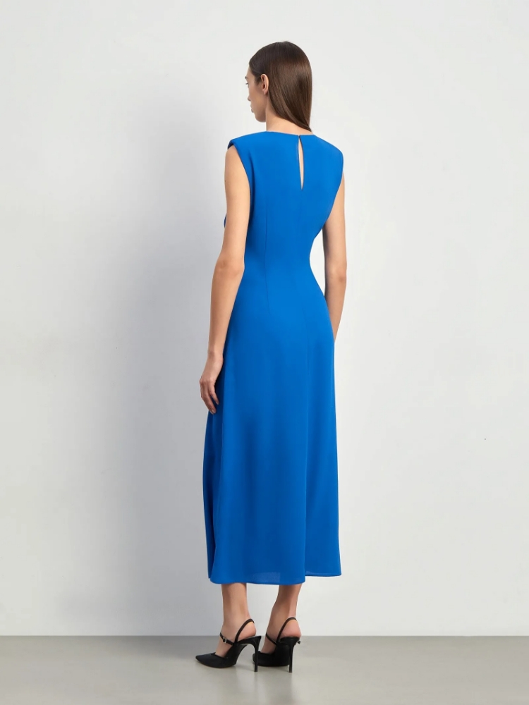 Универсальное платье в синем цвете. Драпировка сбоку в области талии и подплечники — трендовая изюминка образа. Модель миди имеет приталенный силуэт с безупречной посадкой по спинке. Отсутствие рукавов, изящная и комфортная пройма, круглый вырез под горло делают платье идеальным вариантом для офисных образов. Плечи укрупнены, но при этом сохраняется женственная плавность линий. Модель застёгивается на молнию сбоку и пуговицу сзади. Под пуговицей располагается небольшой вырез-капля. Платье выполнено без подкладки