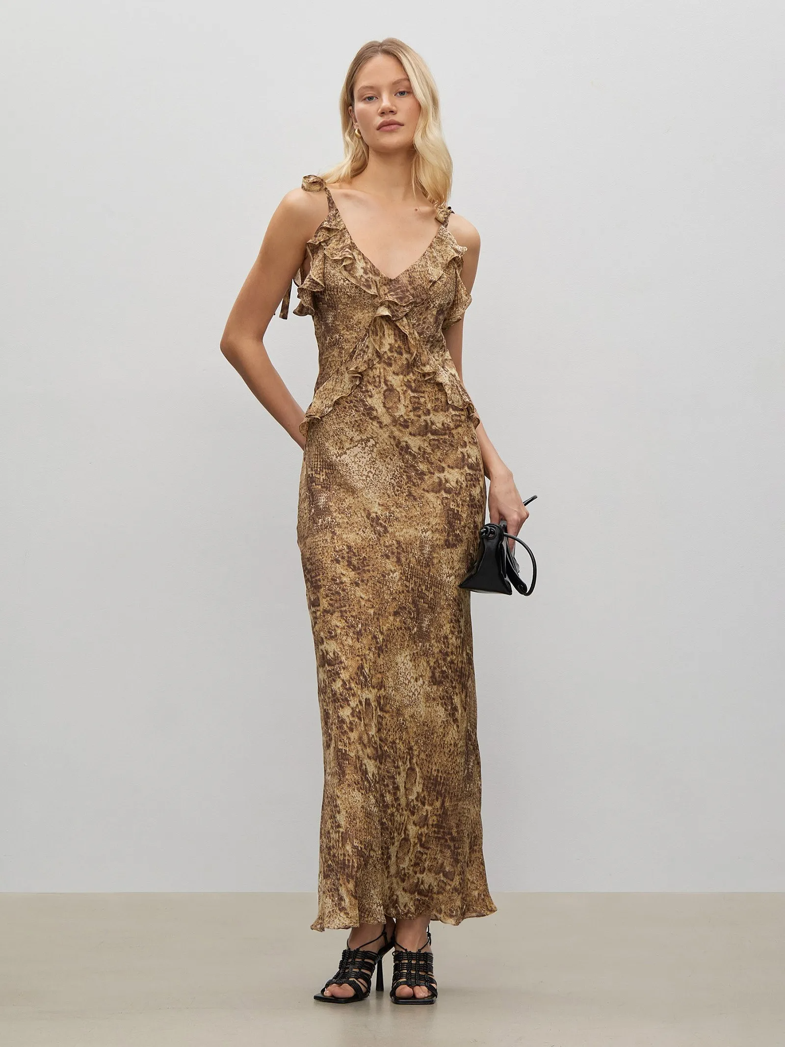 Модное платье с анималистическим принтом добавит пикантности образу. Благодаря цветовой гамме подойдёт как для контрастной, так и для более нежной внешности. Модель отличается модными бантами-завязками на плечах и гирляндами из воланов, крест-накрест спускающимися от плеч к талии. Интересный выбор для отпуска или вечеринки. В будние дни платье можно "успокоить" базовым чёрным жакетом и носить с трендовыми мюлями.