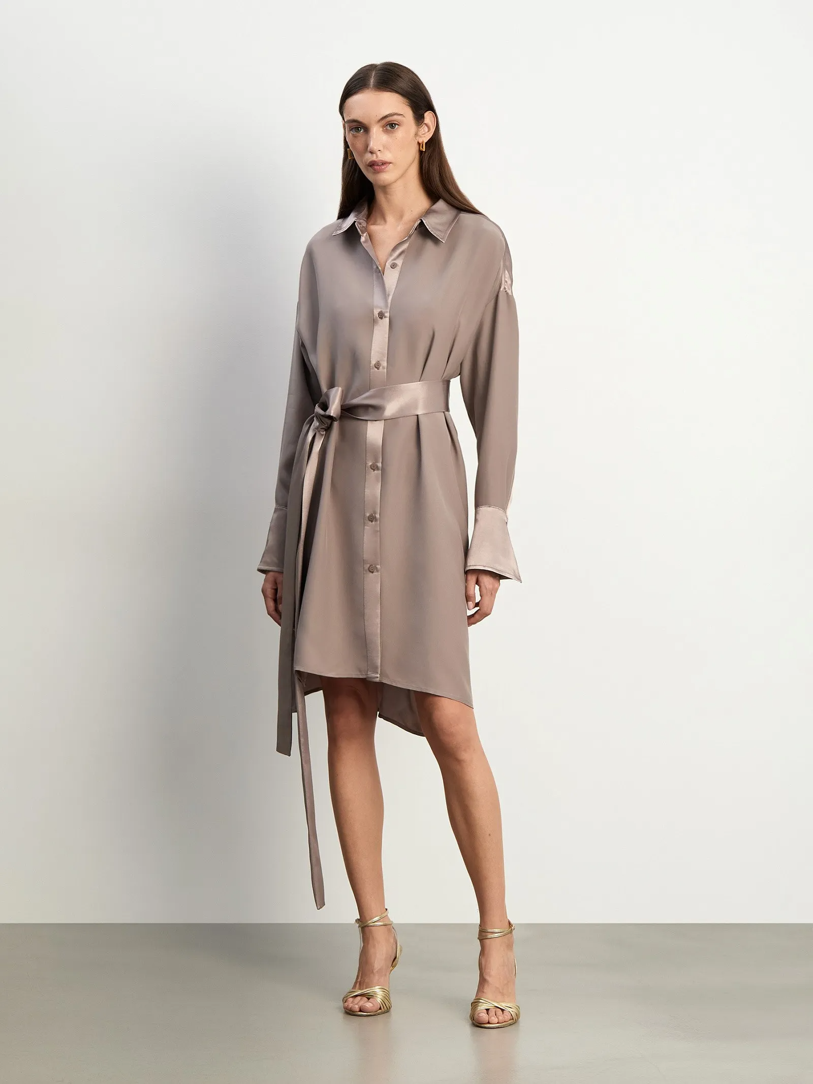 Элегантное и необычное платье-рубашка в цвете мокко. Манжеты и линия плеч, воротник и планка, а также пояс-кушак выполнены из атласа. Интересный контраст между матовой и атласной фактурами делает платье отличным выбором как для будней, так и для праздников. Приталенный силуэт и длина чуть выше колена являются универсальным решением, а трендовый асимметричный подол добавляет в образ изюминку. Платье выполнено из лёгкого и тактильно приятного материала с высоким содержанием вискозы. Оно станет одной из любимых вещей в гардеробе, которую хочется носить чаще.