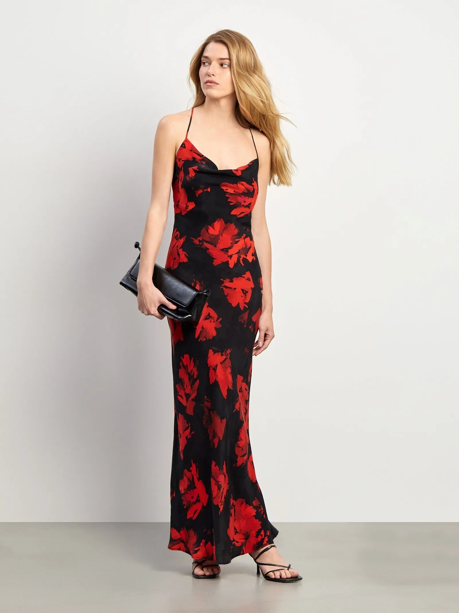 Платье макси со смелыми мазками алого цвета на чёрном фоне — модная вещь сезона. Изготовлено из купры: это тактильно приятный, шелковистый материал на основе вискозы. Комбинация выполнена на тонких бретелях, которые перекрещиваются на спинке. Открытая спина, женственная "качелька" в зоне декольте и яркое цветовое сочетание в испанском духе создают темпераментный образ. Платье можно дополнить чёрным жакетом.