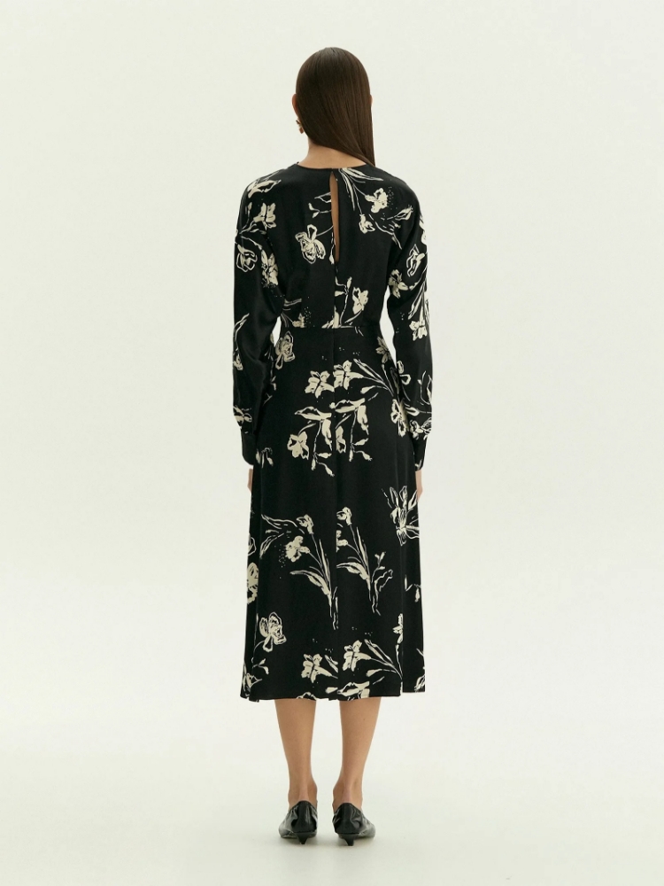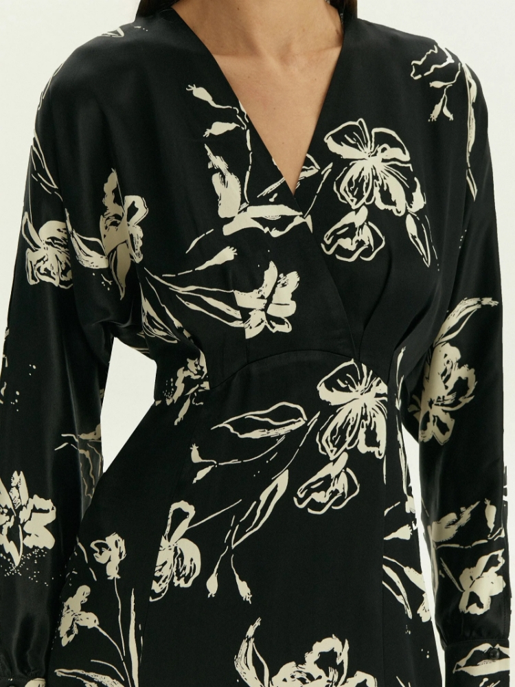 Нежное платье из шелковистой вискозы украшено женственным принтом с цветочными мотивами. Цветочный принт стилизован в восточном духе, что отражает тренды сезона. Платье может стать идеальным выбором для особого случая или выходного дня, романтического вечера и любых личных планов. Модель миди выполнена с высокой талией и хорошо закреплённой имитацией запаха под грудью: такой фасон хорошо смотрится на разных фигурах. На спинке под застёжкой имеется глубокий вырез-капля, под вырезом расположена молния. Платье может стать частью капсулы с блузой и юбкой paluma. Сделано без подкладки
