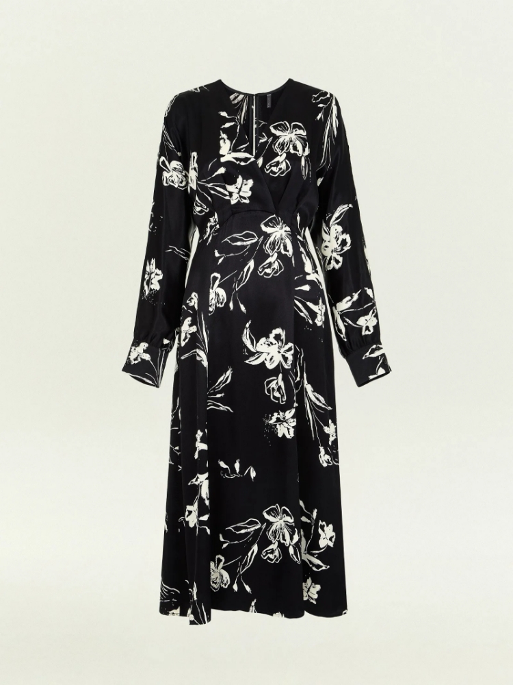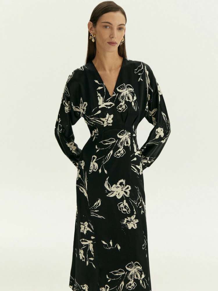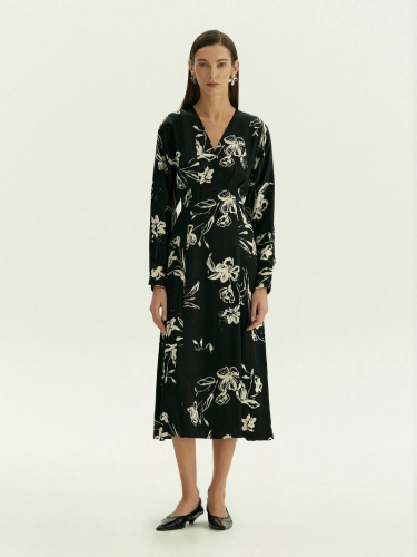 Нежное платье из шелковистой вискозы украшено женственным принтом с цветочными мотивами. Цветочный принт стилизован в восточном духе, что отражает тренды сезона. Платье может стать идеальным выбором для особого случая или выходного дня, романтического вечера и любых личных планов. Модель миди выполнена с высокой талией и хорошо закреплённой имитацией запаха под грудью: такой фасон хорошо смотрится на разных фигурах. На спинке под застёжкой имеется глубокий вырез-капля, под вырезом расположена молния. Платье может стать частью капсулы с блузой и юбкой paluma. Сделано без подкладки