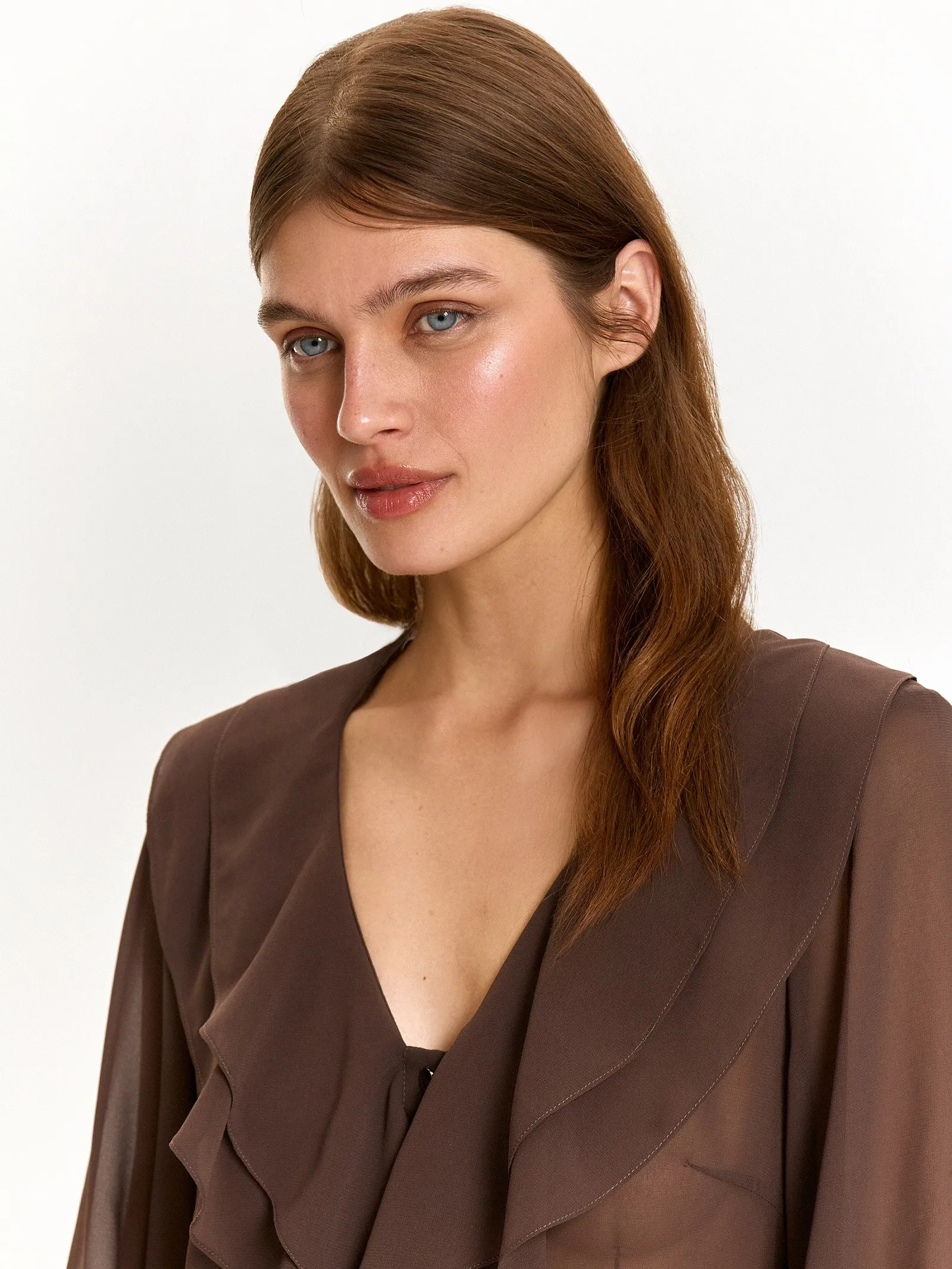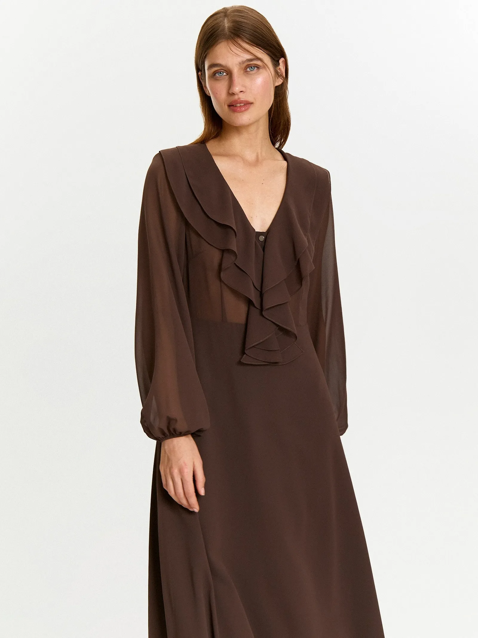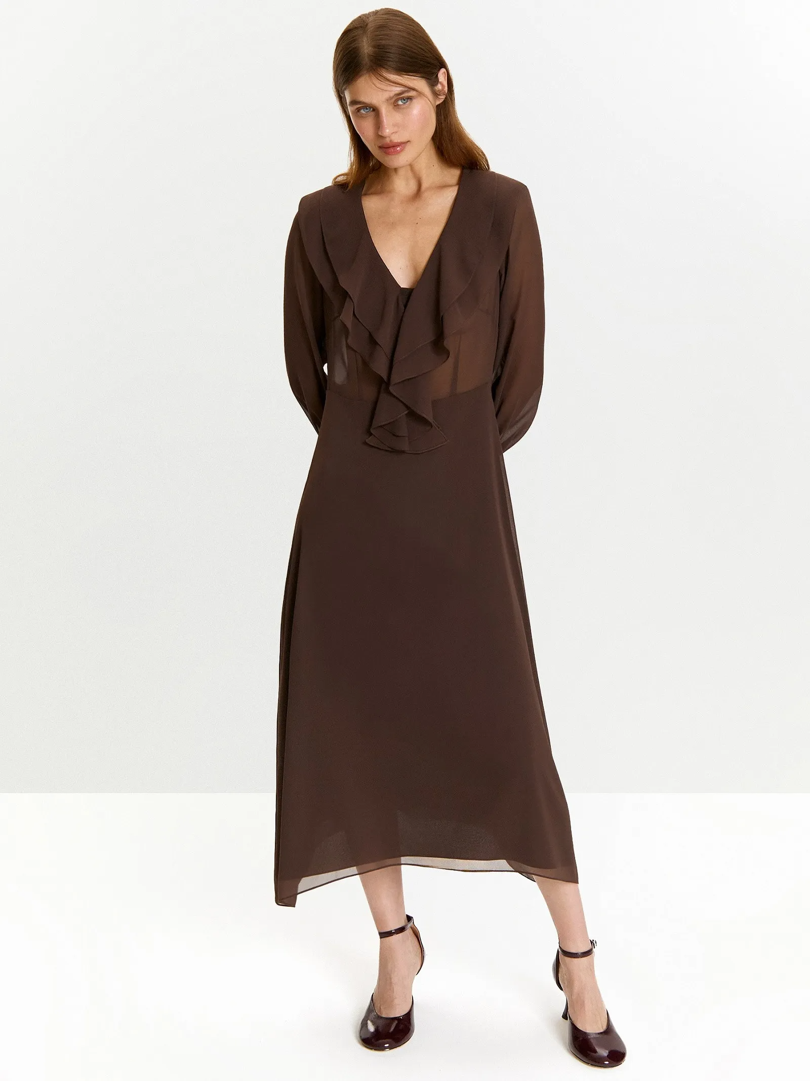 Платье сделано с частичной подкладкой: она присутствует на юбке. Лежащие на груди и плечах воланы, а также цвет мокко делают прозрачный верх допустимым. Также с платьем можно надеть лёгкий шёлковый топ в тон.