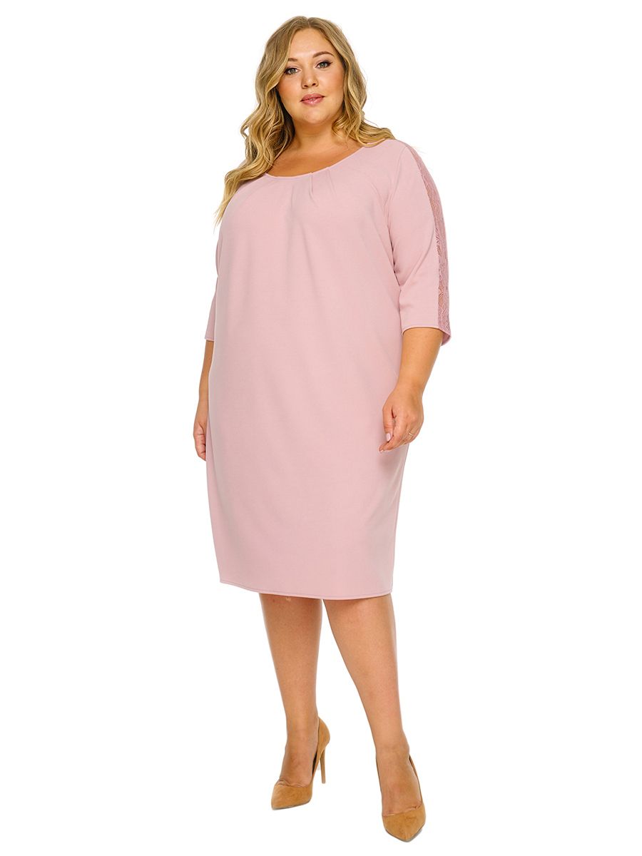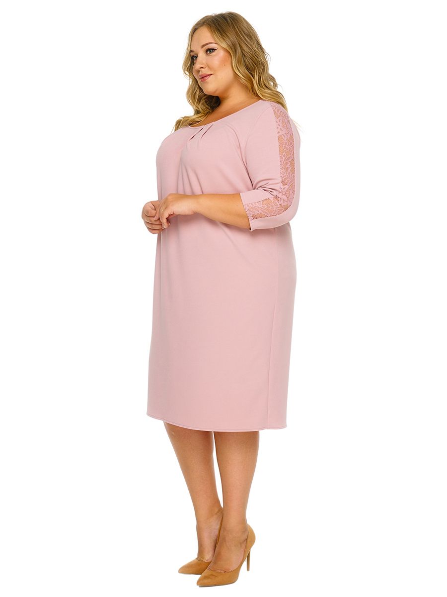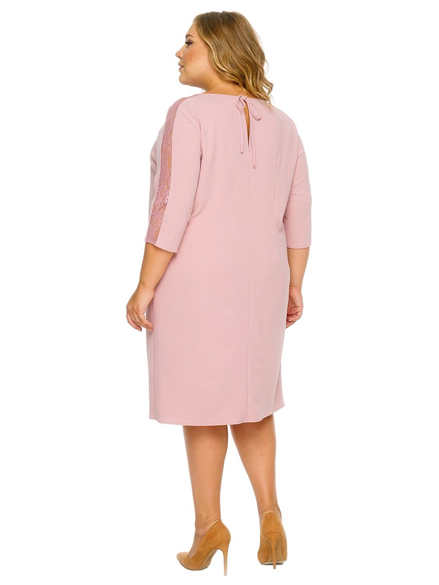 Платье прямое с кружевной вставкой на рукавах цвета сомон