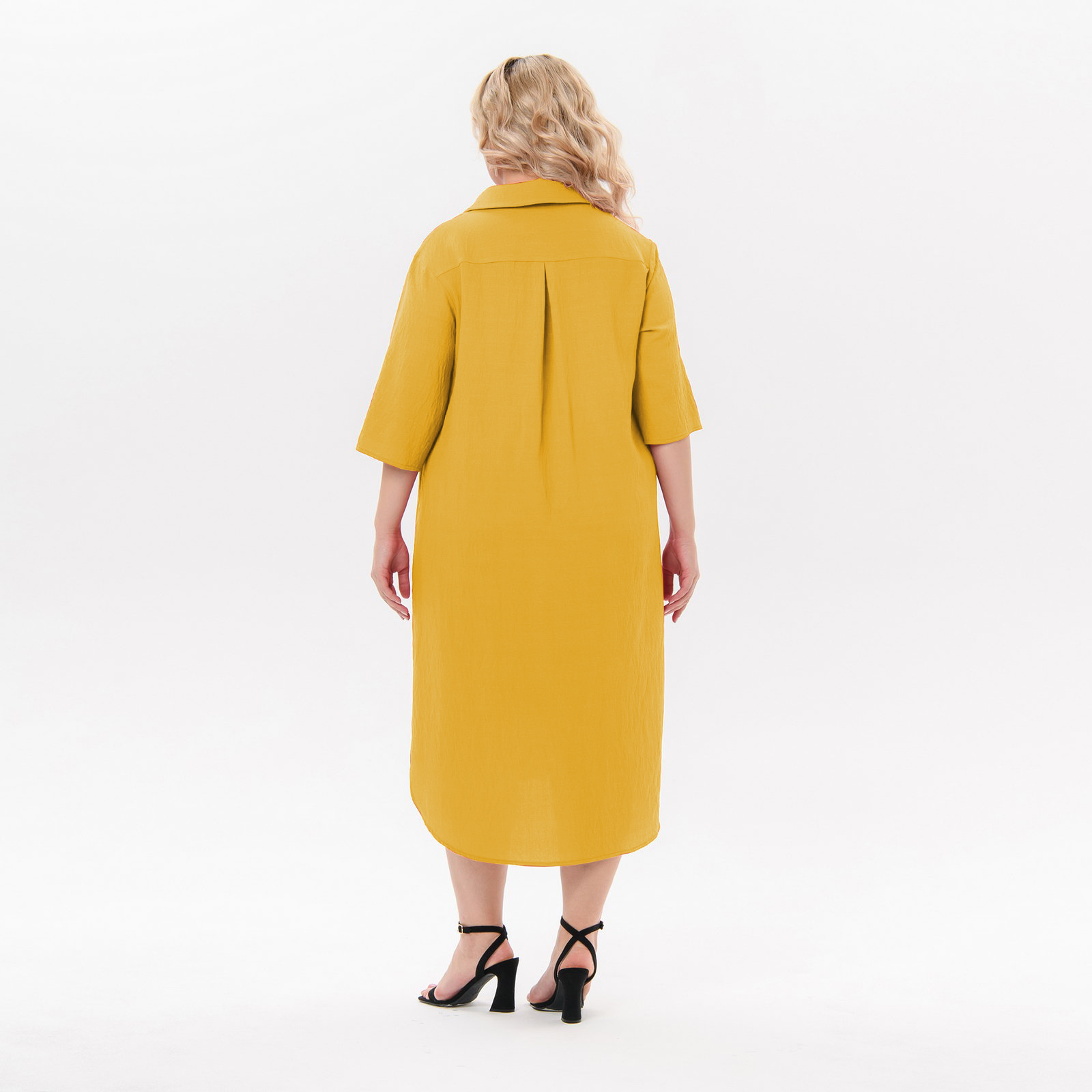 Платье - рубашка свободного А-силуэта из ткани средней плотности. Линия плеча спущена, рукав прямой, свободный. По переду V-вырез, переходящий в складку.