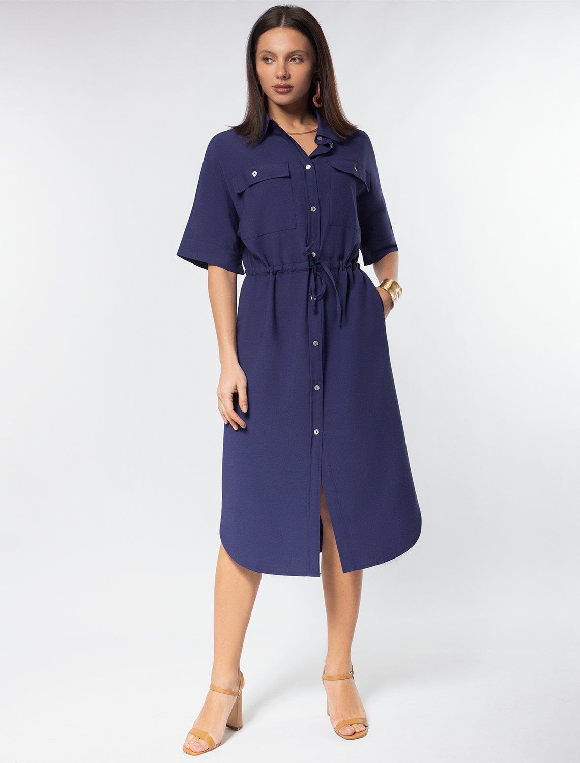 Платье-рубашка выполнено из плотного лиоцелла. Модель дополнена двумя накладными карманами в стиле сафари с пуговицами из натурального перламутра. Свободный силуэт не сковывает движений. Талия подчеркнута регулируемым поясом-шнуром. По бокам разрезы. Добавление синтетических волокон в составе изделия предотвращает сминаемость. Изделие сохранит свой безупречный внешний вид в течении долгого времени.