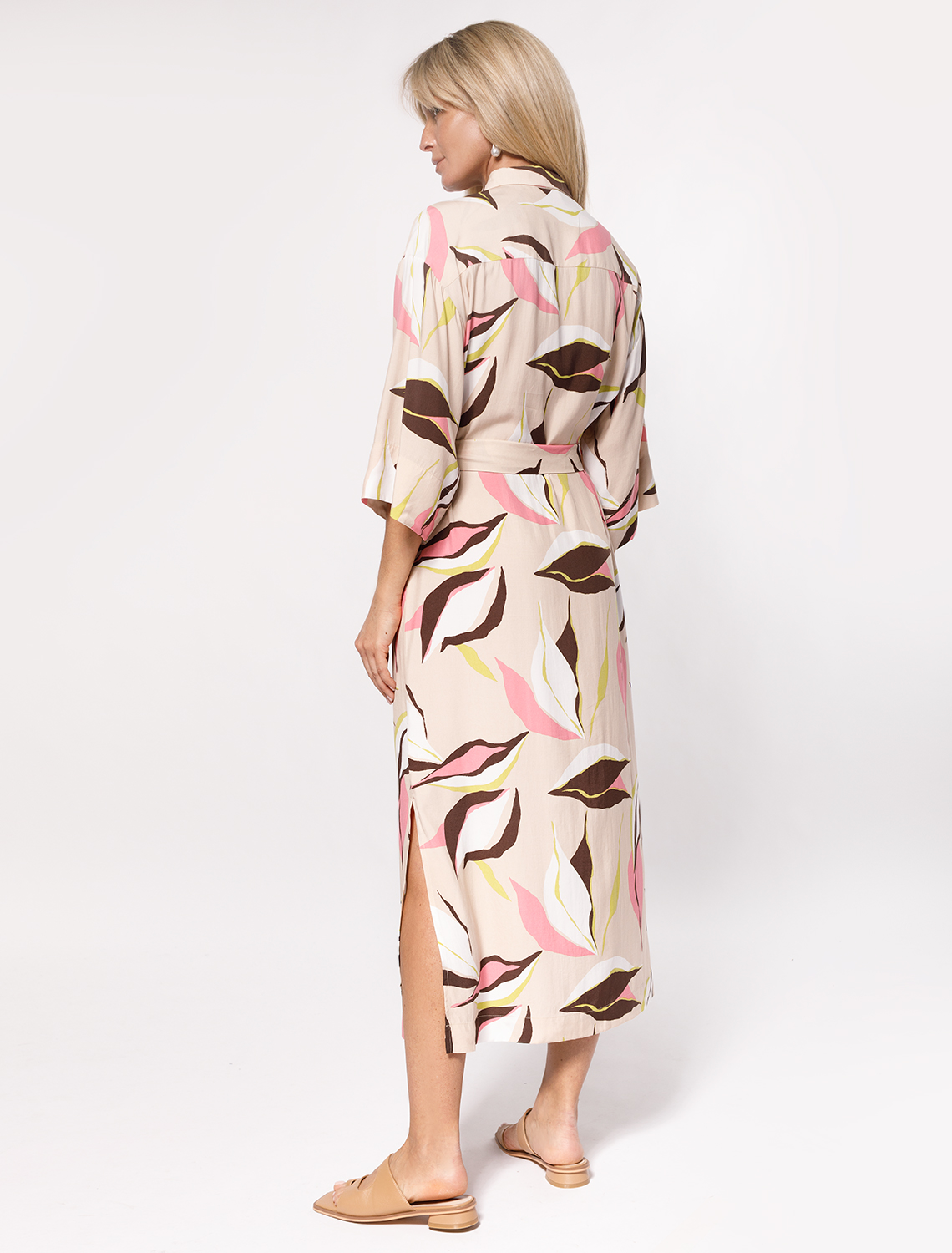 Платье-рубашка выполнено из вискозы. За счет добавления лиоцелла в состав изделия, ткань формоустойчива и надолго сохраняет безупречный внешний вид в течении долгого времени. Модель дополнена разрезами по бокам и поясом-лентой. Приятная на ощупь ткань охлаждает кожу в жаркую погоду, а крой не ограничивает свободу движений. Растительный принт подходит всем цветотипам. пудровый