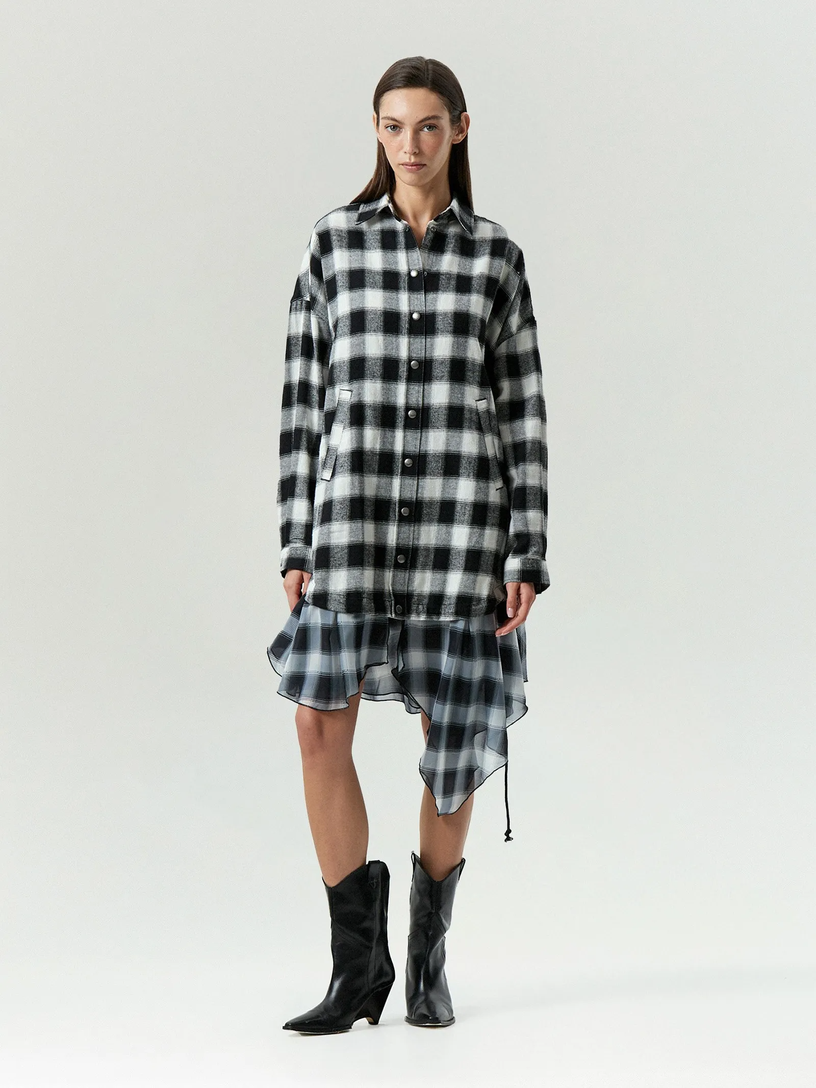 Платье-рубашка в стиле гранж с игрой фактур. Асимметричный край с рваным эффектом из шифона пришит к удлинённой рубашке из мягкой хлопковой фланели. Низ платья-рубашки можно затянуть или расслабить с помощью кулиски. Такую вещь можно сочетать с джинсами скинни и лосинами. Она сделает интереснее повседневные образы. Идеальный вариант для экспериментов с многослойными образами.