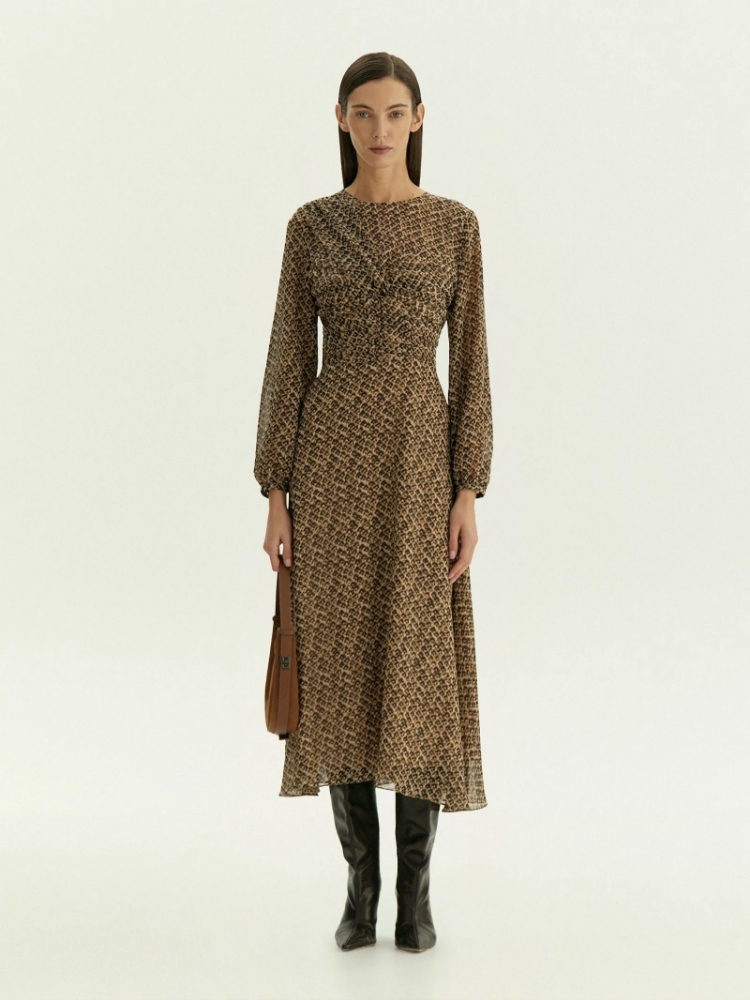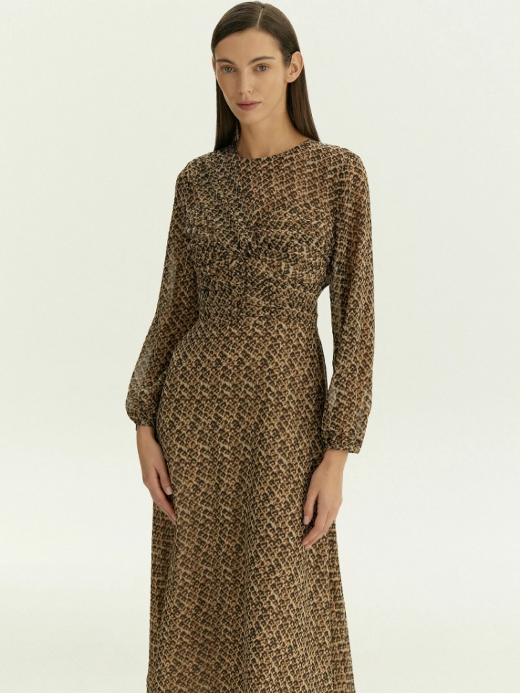 Шифоновое платье с анималистическим принтом подойдёт на каждый день и к особым случаям. Приталенную модель миди с длинным рукавом на узких манжетах отличает необычная драпировка. Особым образом заложенные складки формируют подобие корсета, делая силуэт ещё изящнее. Очень деликатная имитация узла спереди на лифе делает образ ещё интереснее. Платье сделано на непросвечивающей подкладке