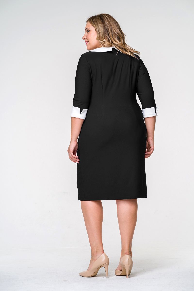 Черный Офисное платье полуприлегающего силуэта из однотонного черного джерси. Воротник и манжеты белого цвета. Рукав 3/4.