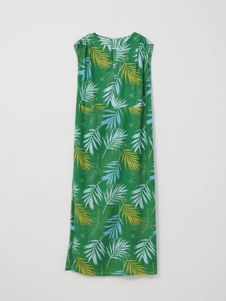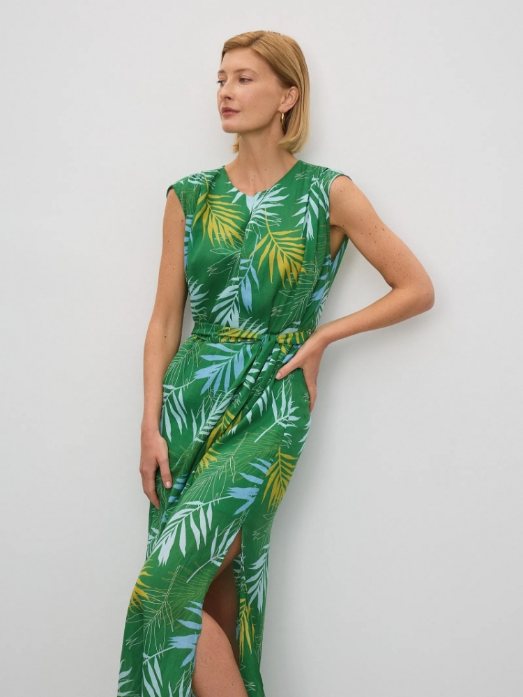 Зелёное платье с тропическим флоральным принтом — лучший выбор для отпуска на море, отличный вариант для шопинга или спокойной прогулки по городу. Изготовлено из хлопка, на комфортной к телу подкладке из вискозы. Выделяется красиво оформленной вертикальными складками областью плеч и небольшим разрезом в зоне декольте, а также разрезом на юбке. Длинная приталенная модель дополнена поясом в тон